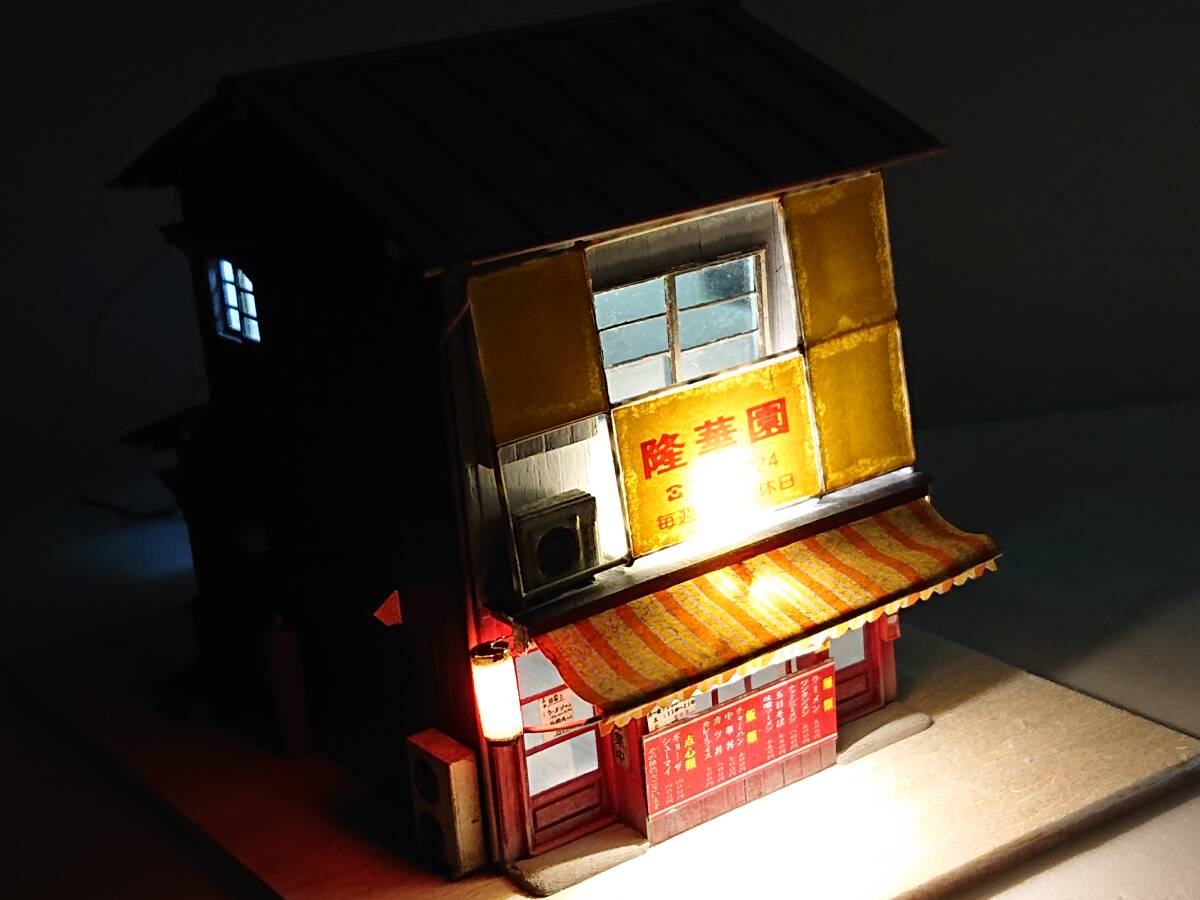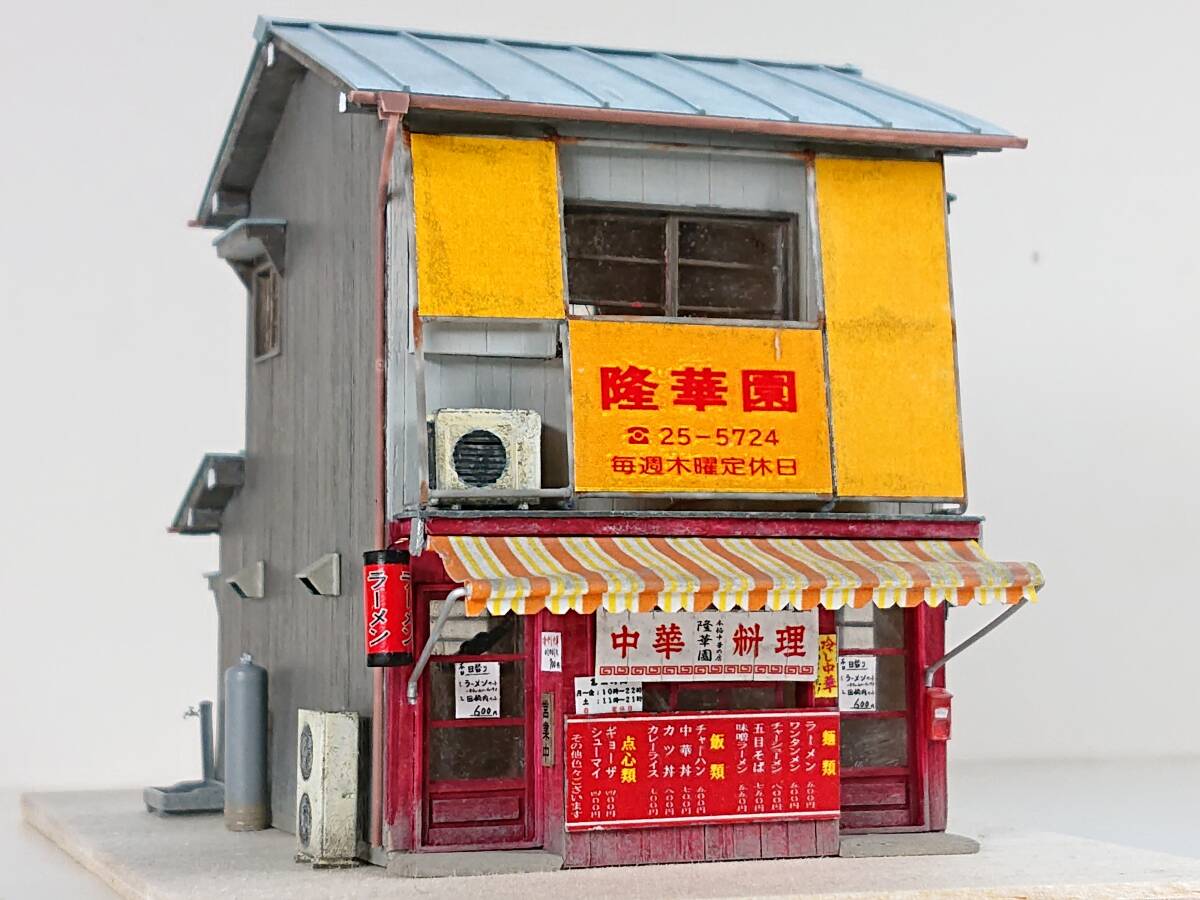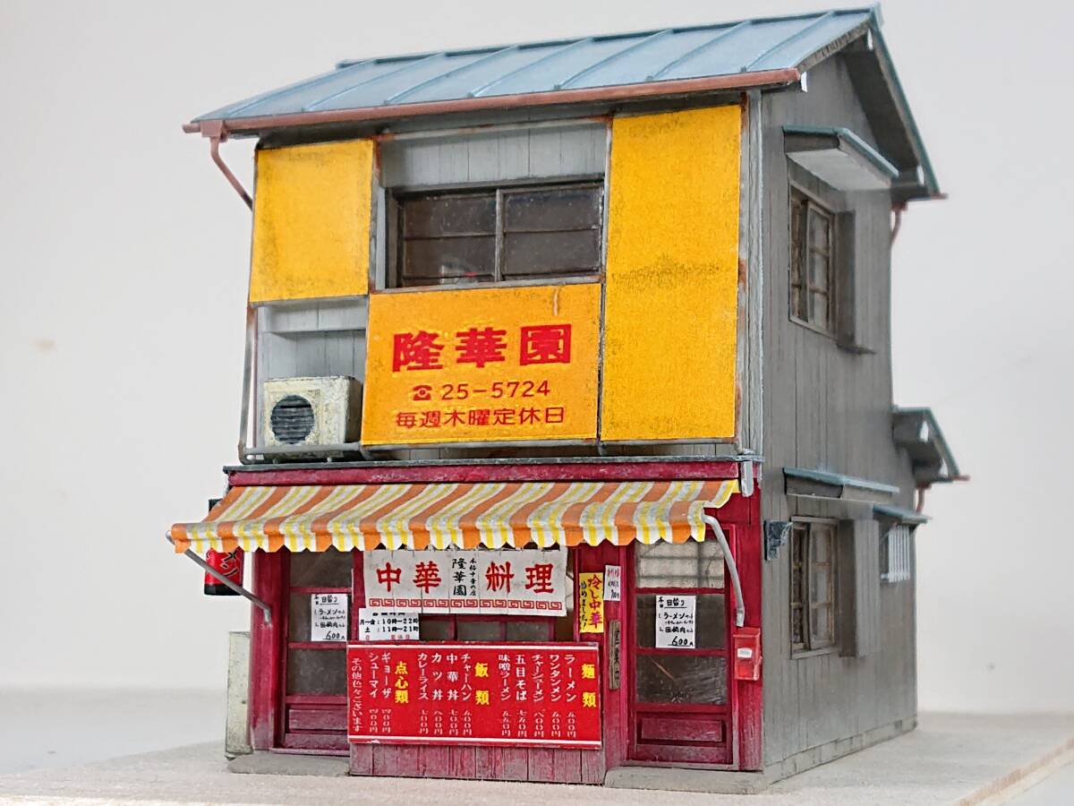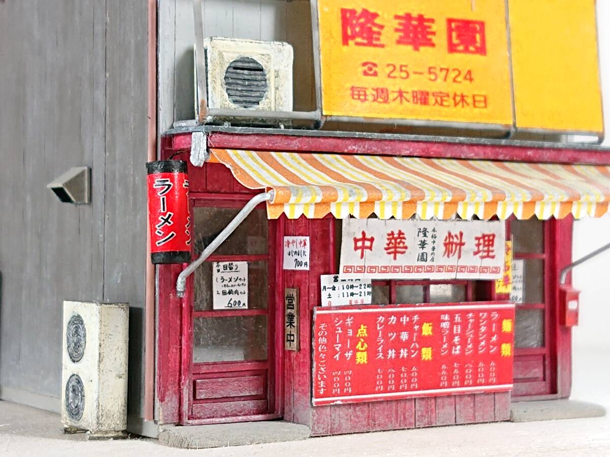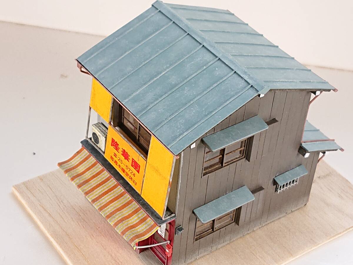 江ノ島電鉄の極楽寺駅から歩いてすぐの場所にあります中華料理店「盛華園」さんをプロトタイプとしております。 2階窓と室外機の部分だけ無い変わった形の店舗テント看板や、出入り口ではない場所に掛けられた暖簾など、一味違った面白味を感じたので参考にして作ってみました。 材料にはバルサ材と厚紙を中心に、壁にはエコーモデル製のSTウッド、各所に木材・プラ材などを使用しております。 各窓は全て固定しております。 室内は作成しておりませんが、室内灯を付けられるよう2階の屋根は取り外せます。 店舗テント看板と小田原提灯には乾電池2本3Vで点灯するR工房製 電球色LED を組み込んでおります。 ただし、ただ組み込んであるだけで立派な配線は組んでおらずスイッチもありませんのでご注意ください。 落札者様で設置状況に合わせて仕上げて頂ければと思います。 また室内用のLEDは屋根には固定しておらず、別でのお渡しとなります。 (画像は屋根裏にLEDをセロハンテープで仮止めして撮影したものです。) その他アクセサリーとして、KinoArts製の プロパンボンベ、MATSURIMODELS製の 室外機、エコーモデル製の 水道蛇口 と 流し(大)、梅桜堂製の ガスメーター、建物に固定してありますが同社製の 郵便受け と 電気メーター と 換気扇、さかつう製の エアコン室外機 をお付けします。 お好きな位置に置いて楽しんで頂ければ幸いです。 最後の写真は、同時に出品しておりますシミヅヤ書店と一緒に撮ったものです。 入札の参考にして頂ければ幸いです。 建物寸法 : 幅 約 68 mm × 奥行 約 108 mm × 高さ 約 88 mm |