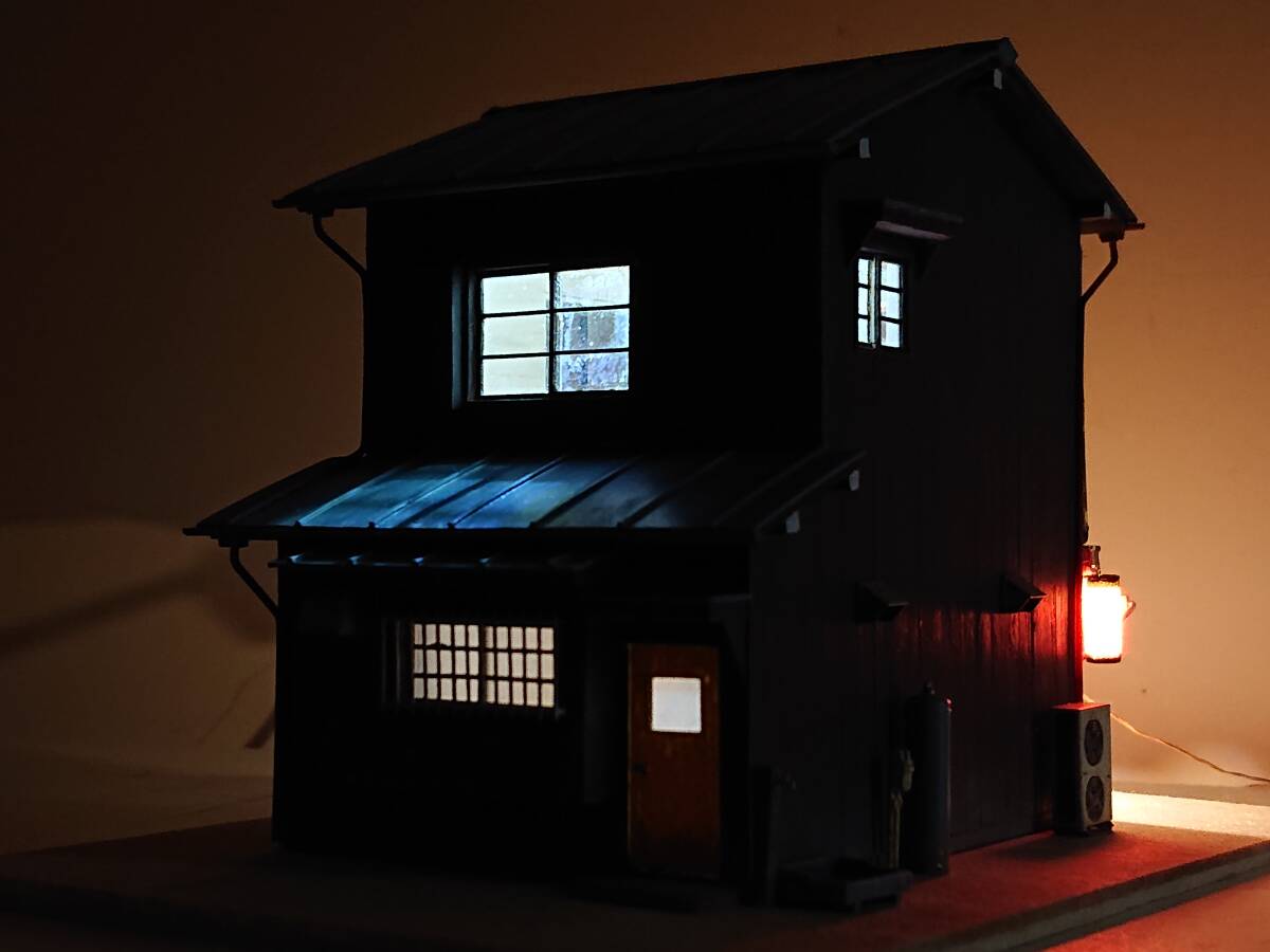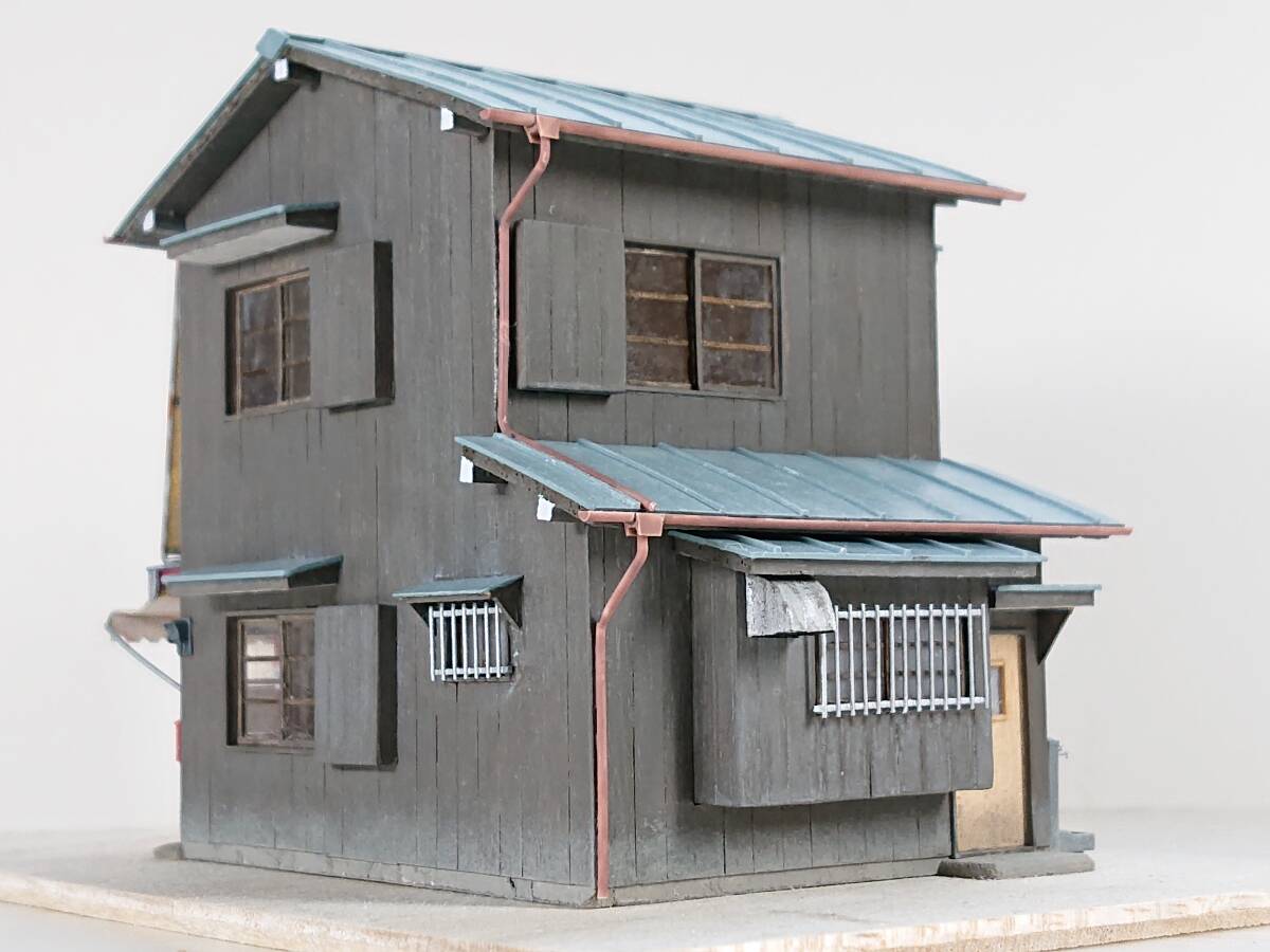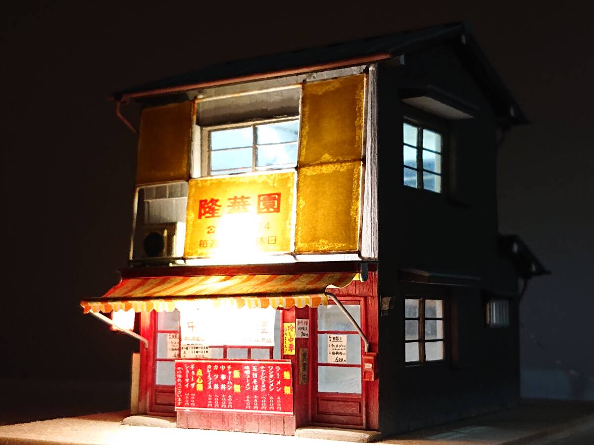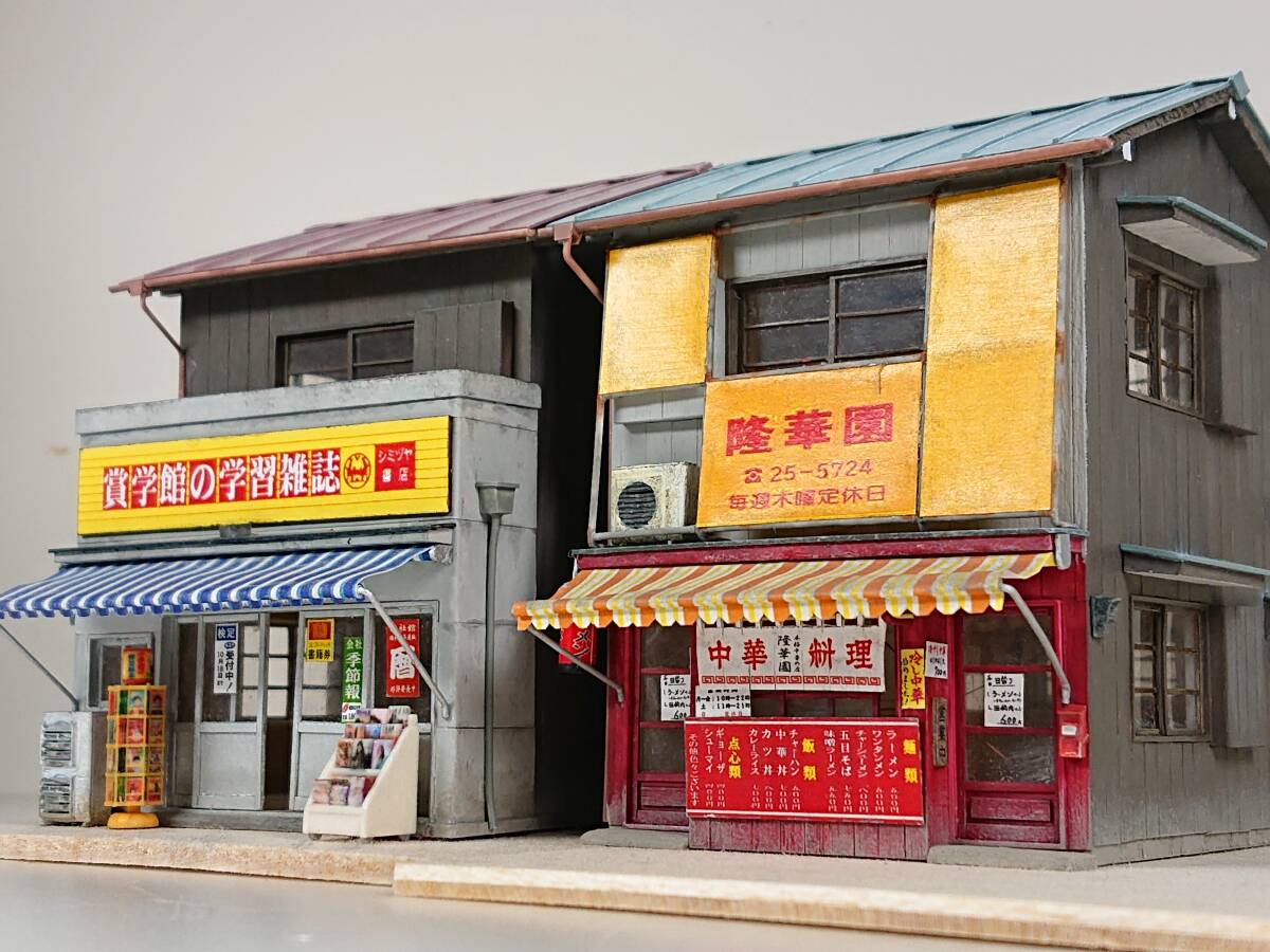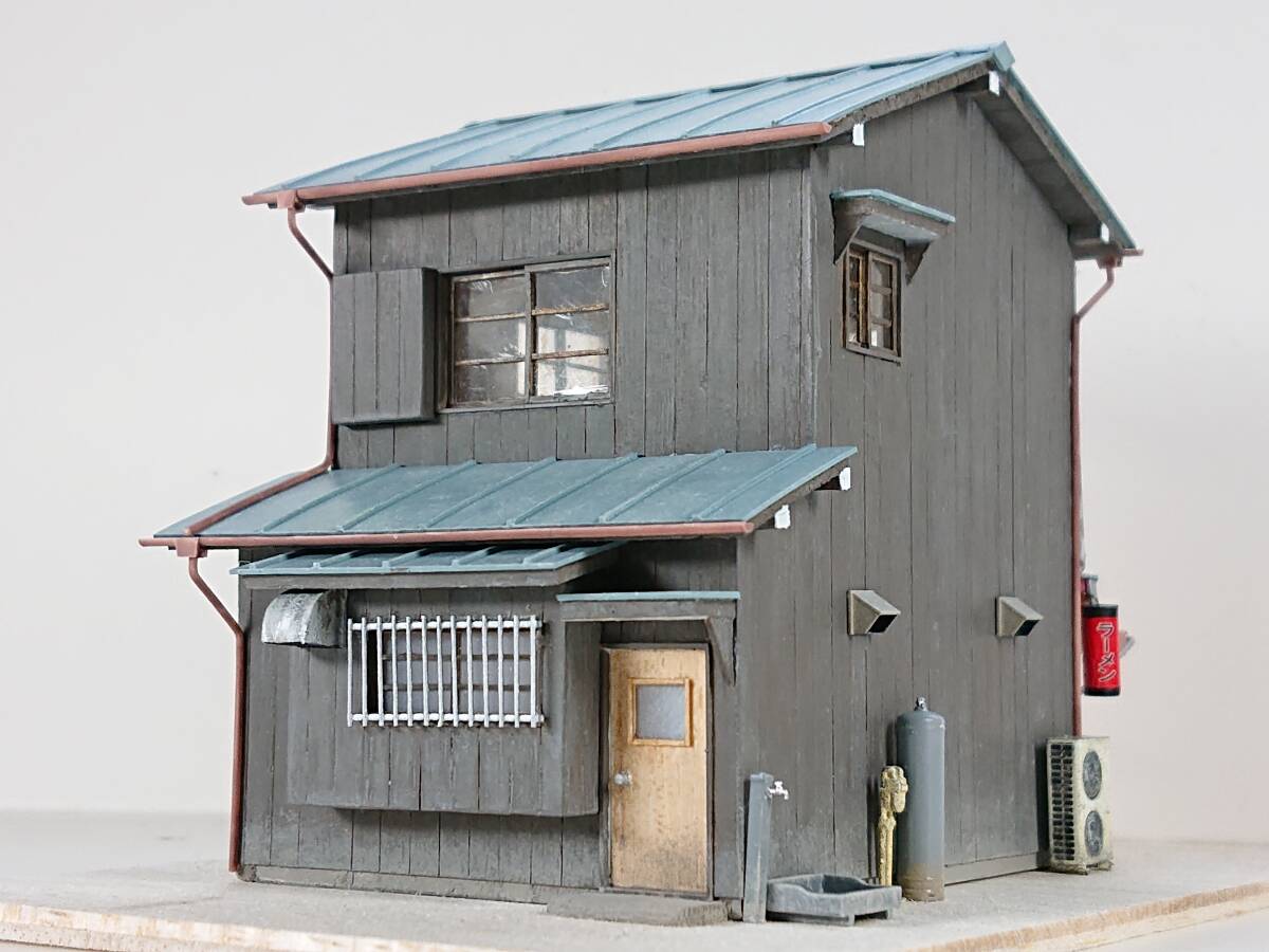 江ノ島電鉄の極楽寺駅から歩いてすぐの場所にあります中華料理店「盛華園」さんをプロトタイプとしております。 2階窓と室外機の部分だけ無い変わった形の店舗テント看板や、出入り口ではない場所に掛けられた暖簾など、一味違った面白味を感じたので参考にして作ってみました。 材料にはバルサ材と厚紙を中心に、壁にはエコーモデル製のSTウッド、各所に木材・プラ材などを使用しております。 各窓は全て固定しております。 室内は作成しておりませんが、室内灯を付けられるよう2階の屋根は取り外せます。 店舗テント看板と小田原提灯には乾電池2本3Vで点灯するR工房製 電球色LED を組み込んでおります。 ただし、ただ組み込んであるだけで立派な配線は組んでおらずスイッチもありませんのでご注意ください。 落札者様で設置状況に合わせて仕上げて頂ければと思います。 また室内用のLEDは屋根には固定しておらず、別でのお渡しとなります。 (画像は屋根裏にLEDをセロハンテープで仮止めして撮影したものです。) その他アクセサリーとして、KinoArts製の プロパンボンベ、MATSURIMODELS製の 室外機、エコーモデル製の 水道蛇口 と 流し(大)、梅桜堂製の ガスメーター、建物に固定してありますが同社製の 郵便受け と 電気メーター と 換気扇、さかつう製の エアコン室外機 をお付けします。 お好きな位置に置いて楽しんで頂ければ幸いです。 最後の写真は、同時に出品しておりますシミヅヤ書店と一緒に撮ったものです。 入札の参考にして頂ければ幸いです。 建物寸法 : 幅 約 68 mm × 奥行 約 108 mm × 高さ 約 88 mm |