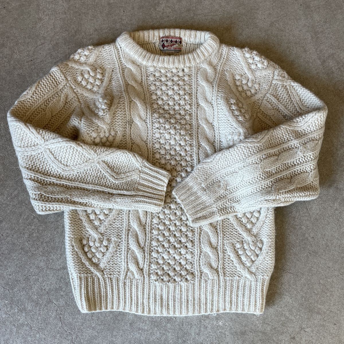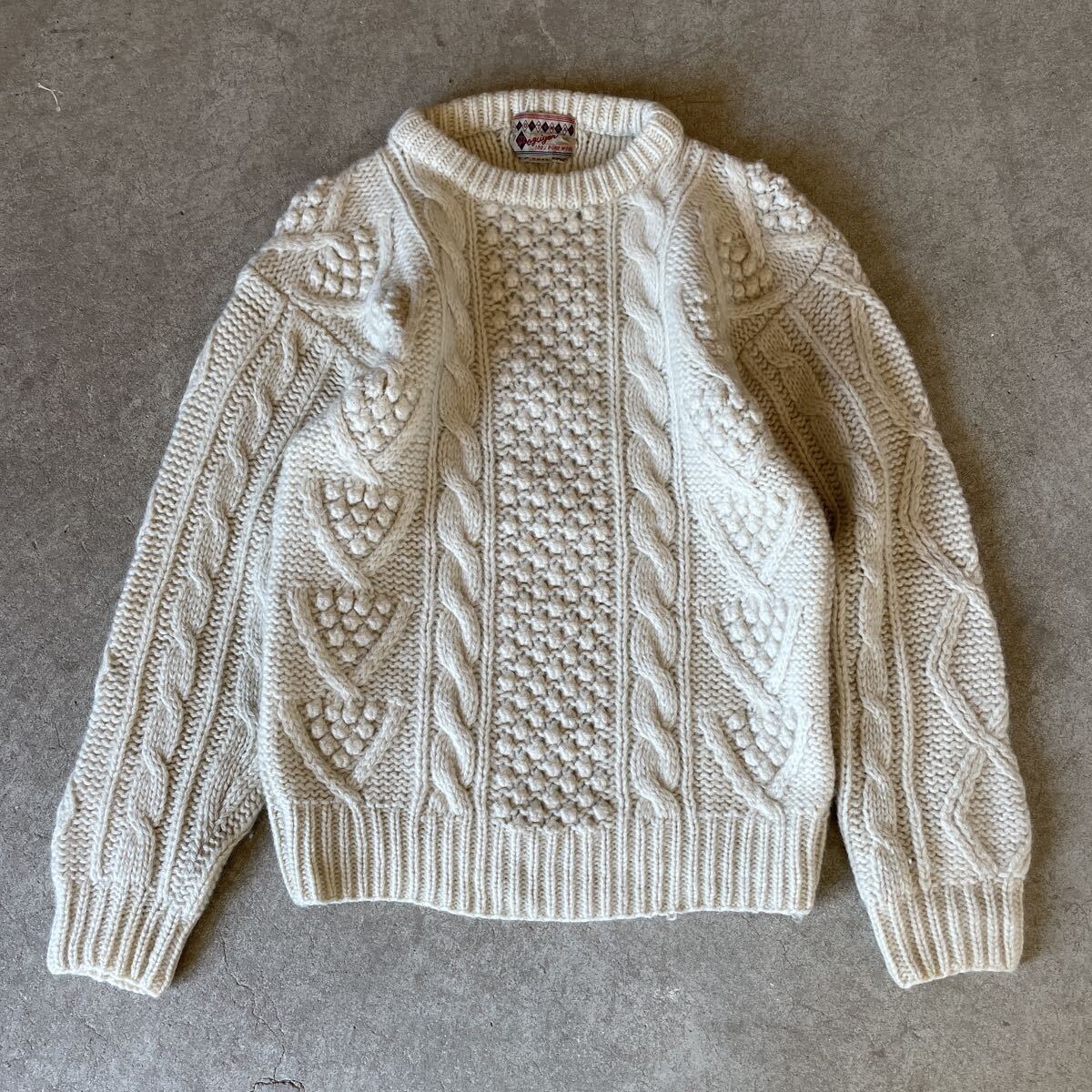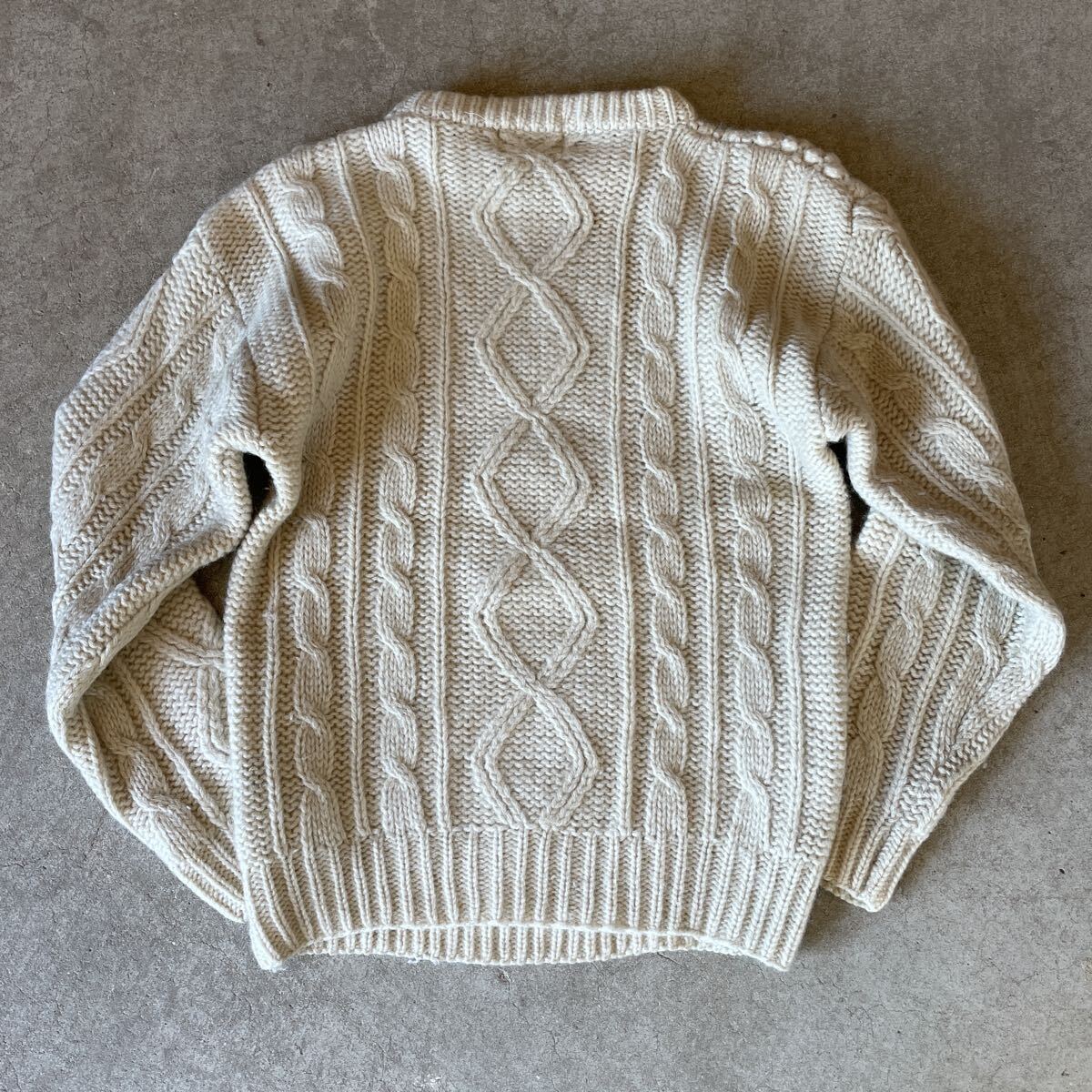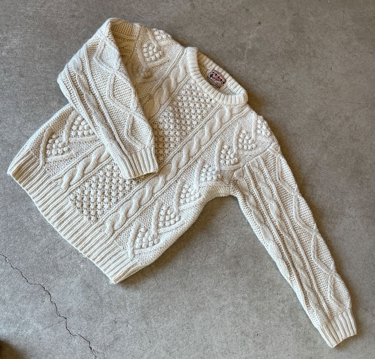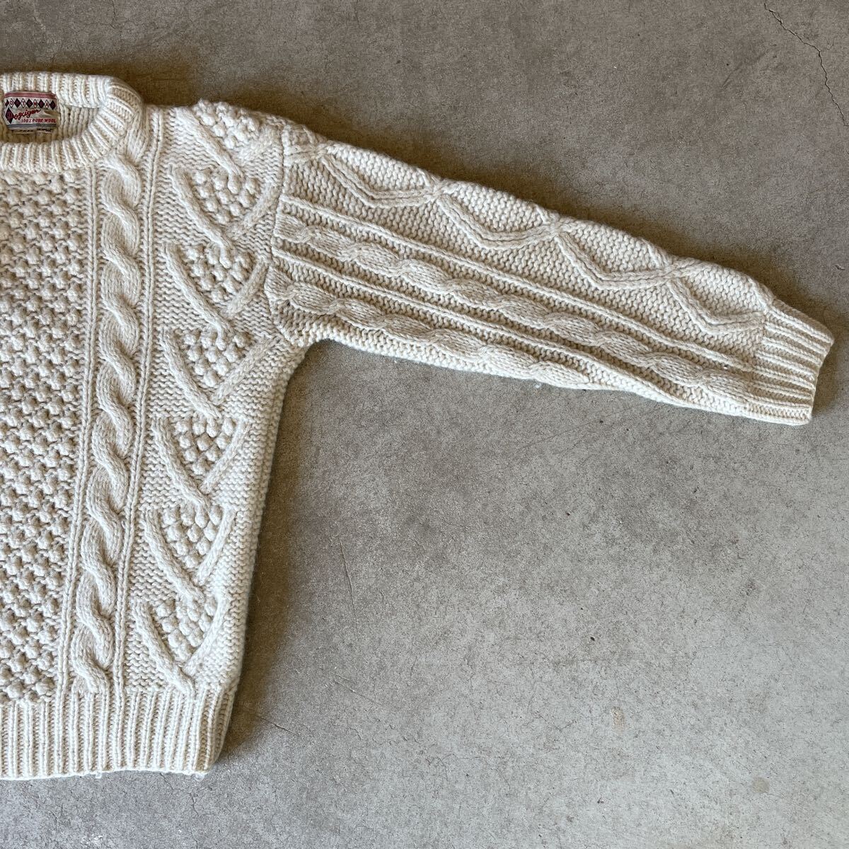 PURE WOOL100% シェットランドウール ローゲージのアランニット フィッシャーマンセーターケーブル編みになります。複雑繊細に編み込まれた雰囲気のあるニットです。サイズはFREEと記載されていますがM~Lぐらいに感じます。サイズ感フォルムの良い品です。男女問わず着て頂けるかと思います。