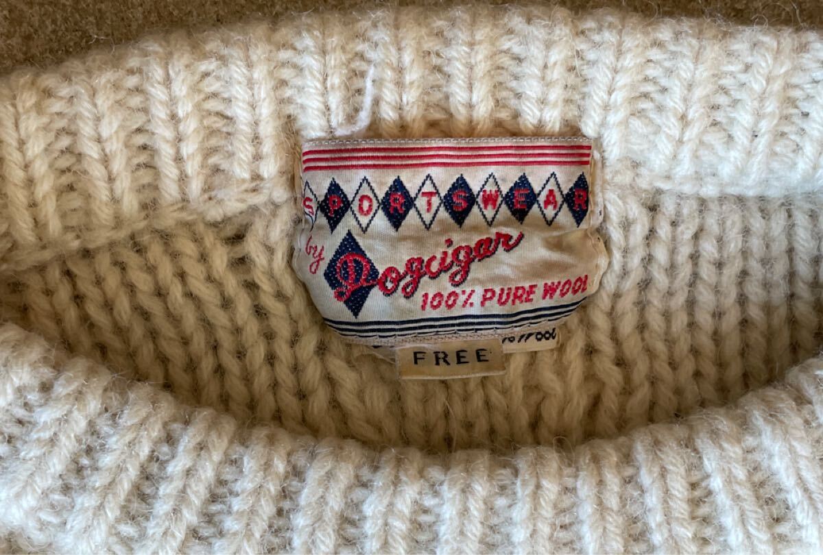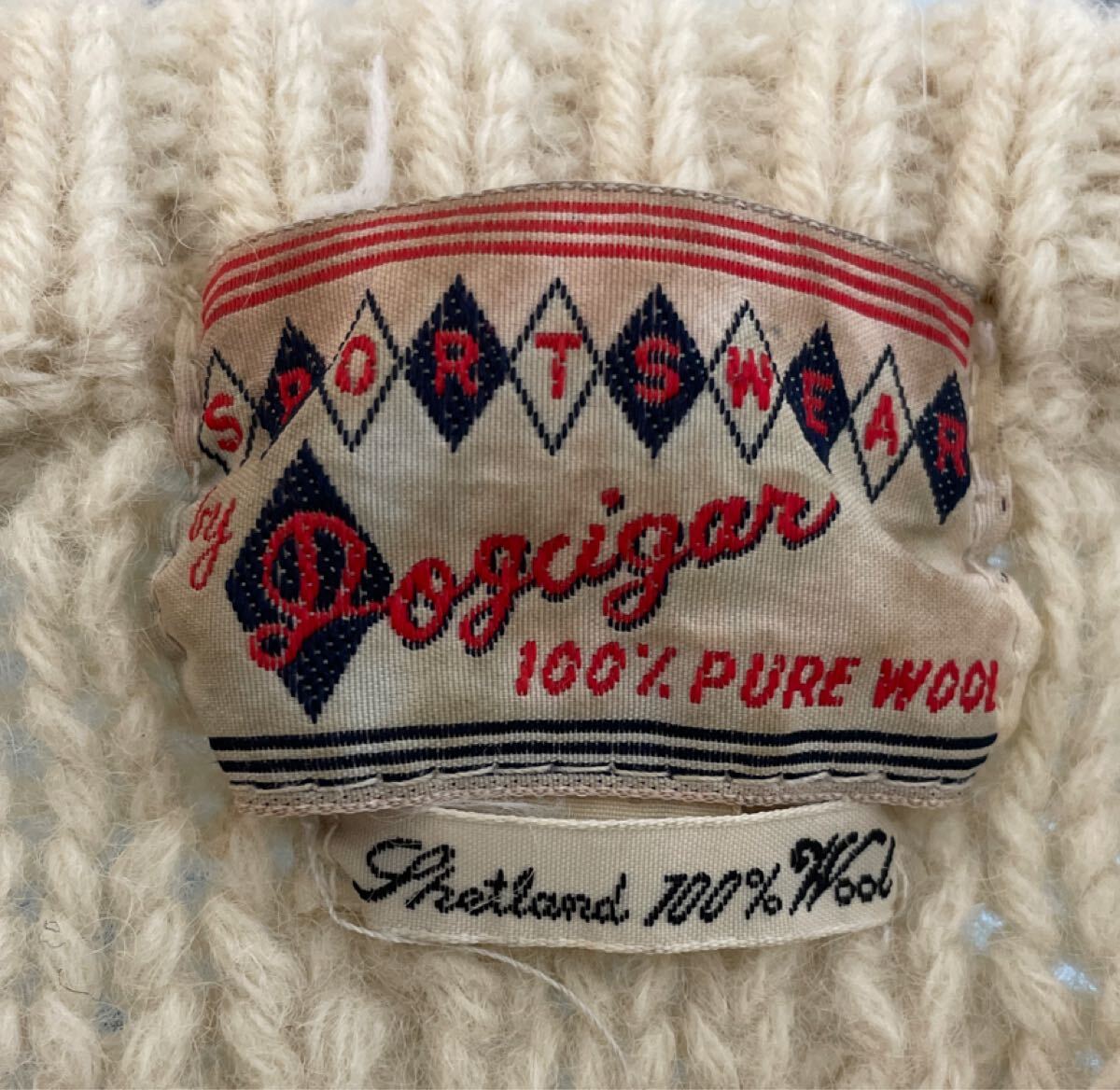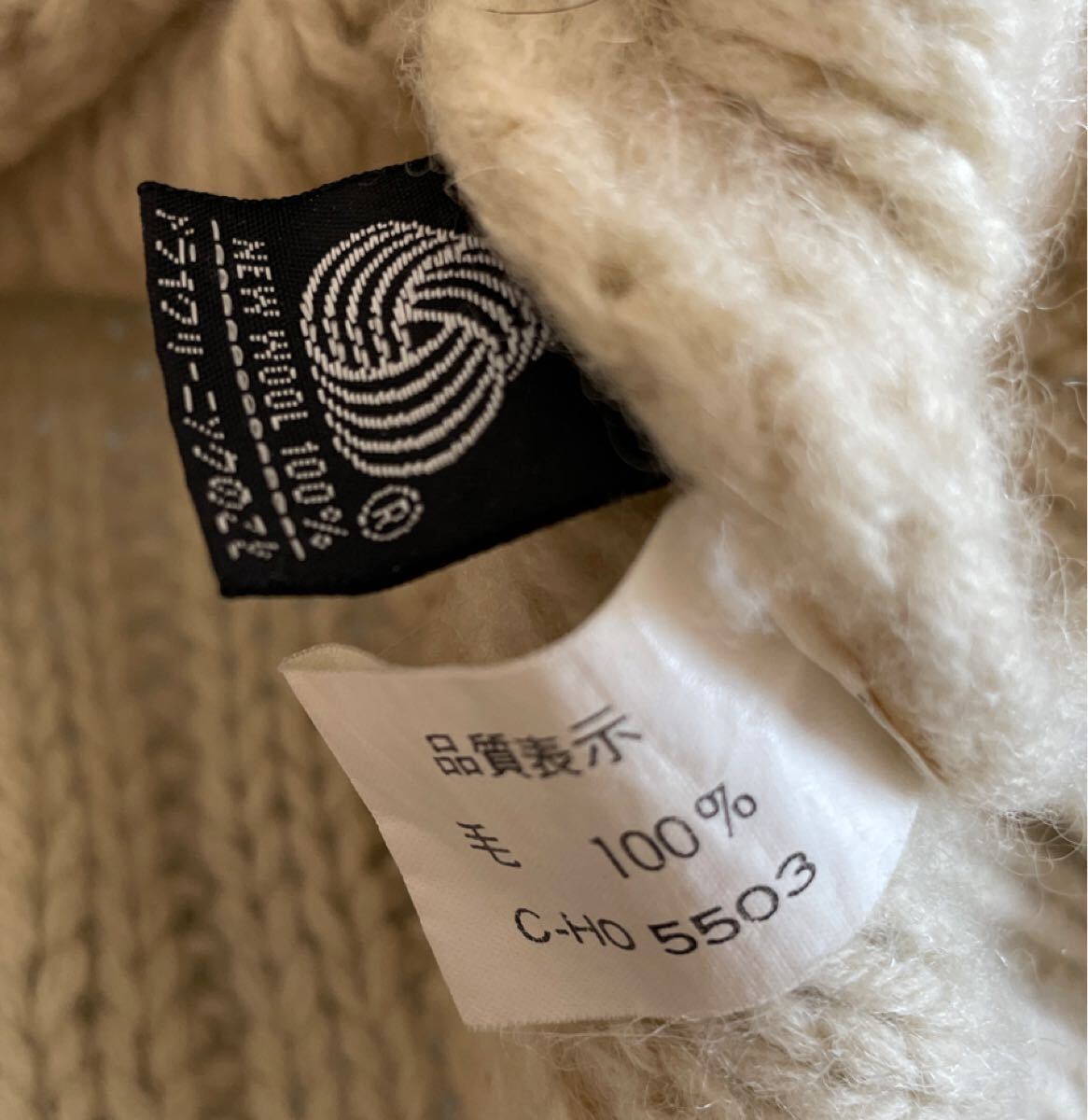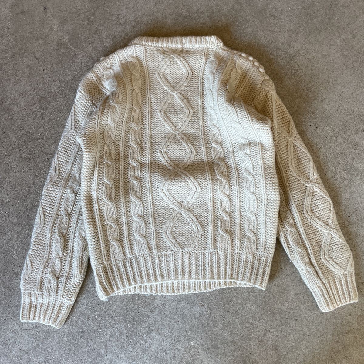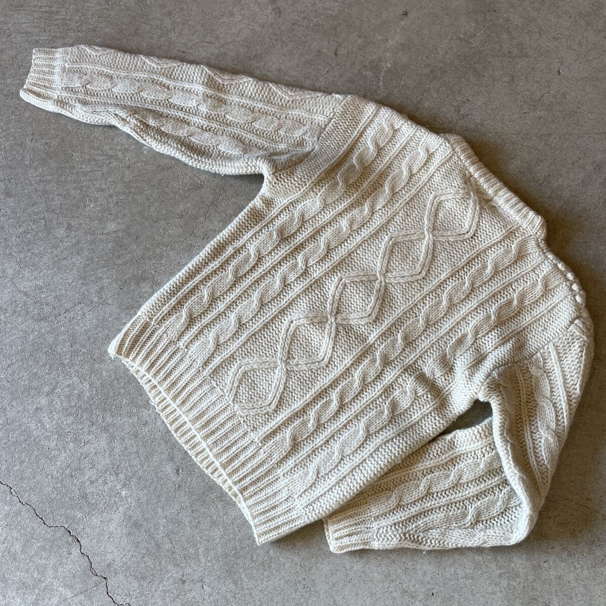 PURE WOOL100% シェットランドウール ローゲージのアランニット フィッシャーマンセーターケーブル編みになります。複雑繊細に編み込まれた雰囲気のあるニットです。サイズはFREEと記載されていますがM~Lぐらいに感じます。サイズ感フォルムの良い品です。男女問わず着て頂けるかと思います。