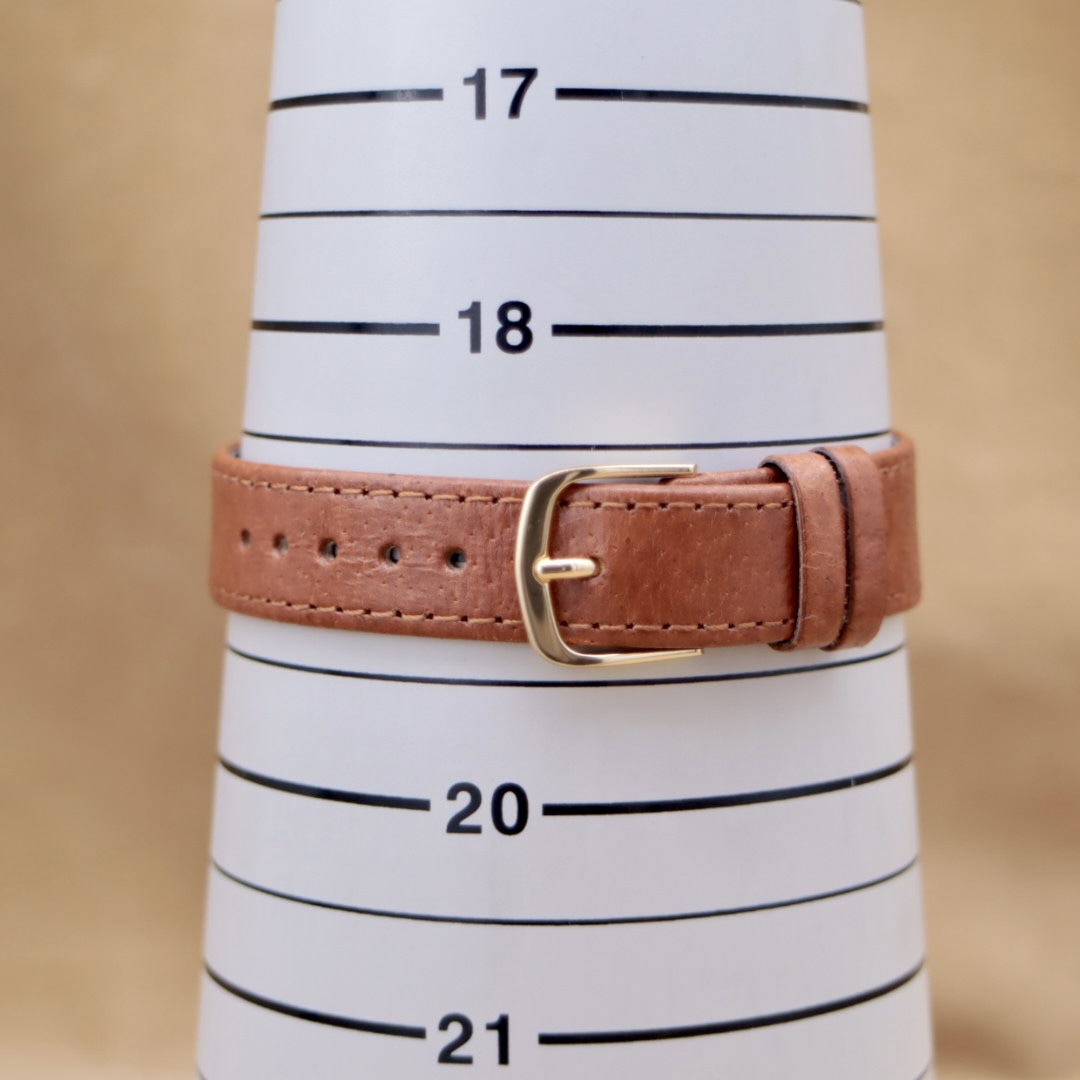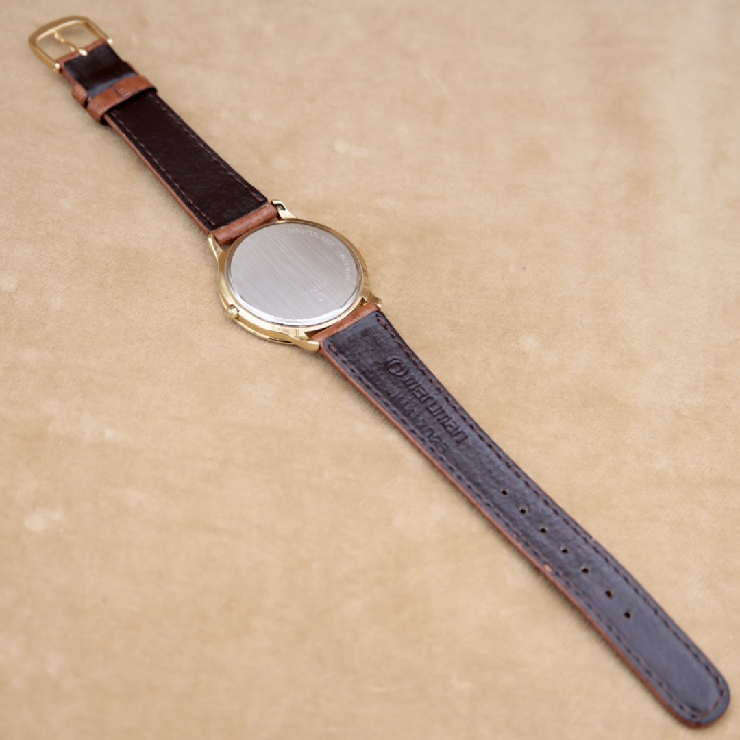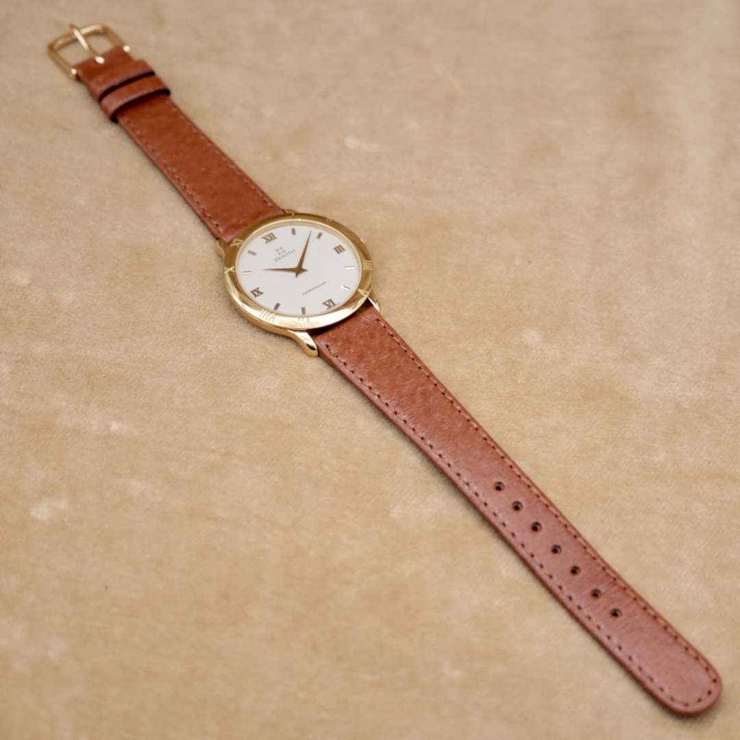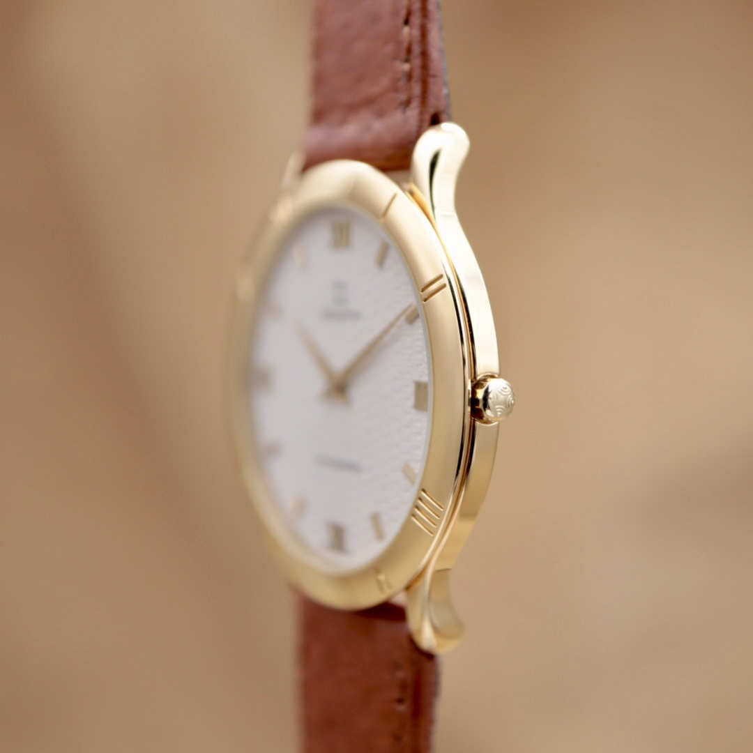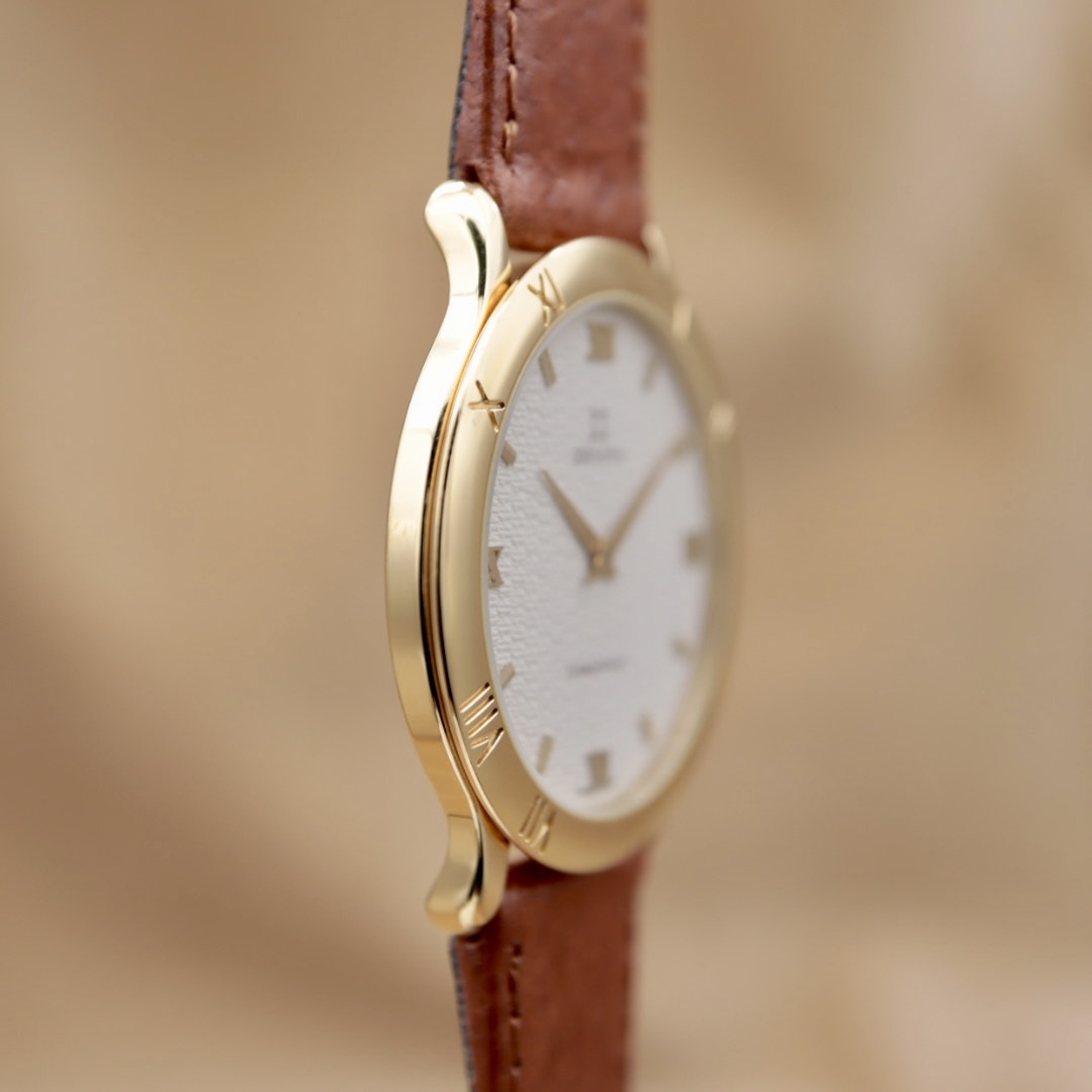 ホワイトの繊細なテクスチャーダイヤルに、ゴールドのローマン×バーインデックスを配した上品なデザインです。スリムなゴールドトーンケースが手元に華やかさを添えます。