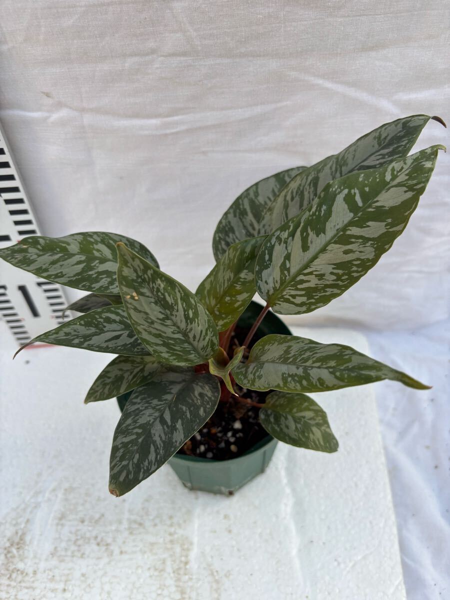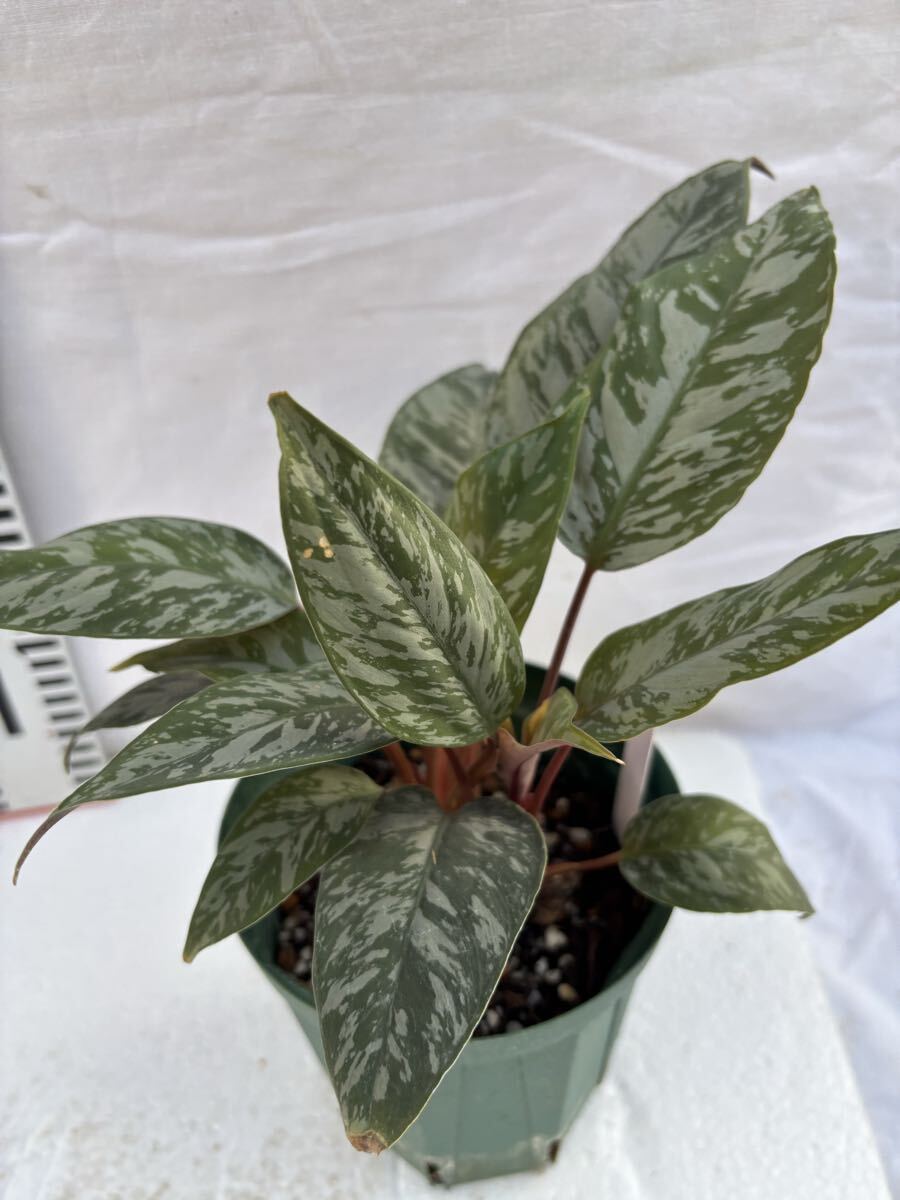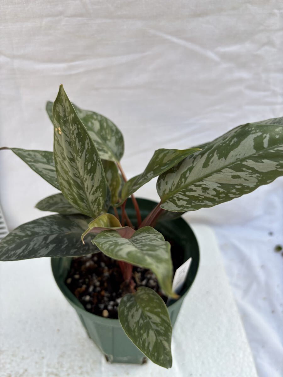 濃いグリーンにシルバー系の斑が美しい、サトイモ科の観葉植物アポバリス:アクミナティッシマです。バーガンディカラーの葉裏とのコントラストも美しいです。比較的湿潤な環境を好みます。アグラオネマと同じようなイメージの育てられます。質感、紋様が非常に美しいアポバリスの葉裏はカラテアの様にボルドー色でコントラストが美しいですが、質感が異なります。未だ日本ではメジャーな植物ではなく、あまり見かけない植物。