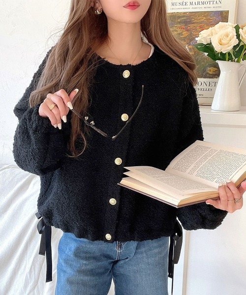 参考商品名:サイドリボンで差をつける! 前後2wayふわふわブークレ素材カーディガン