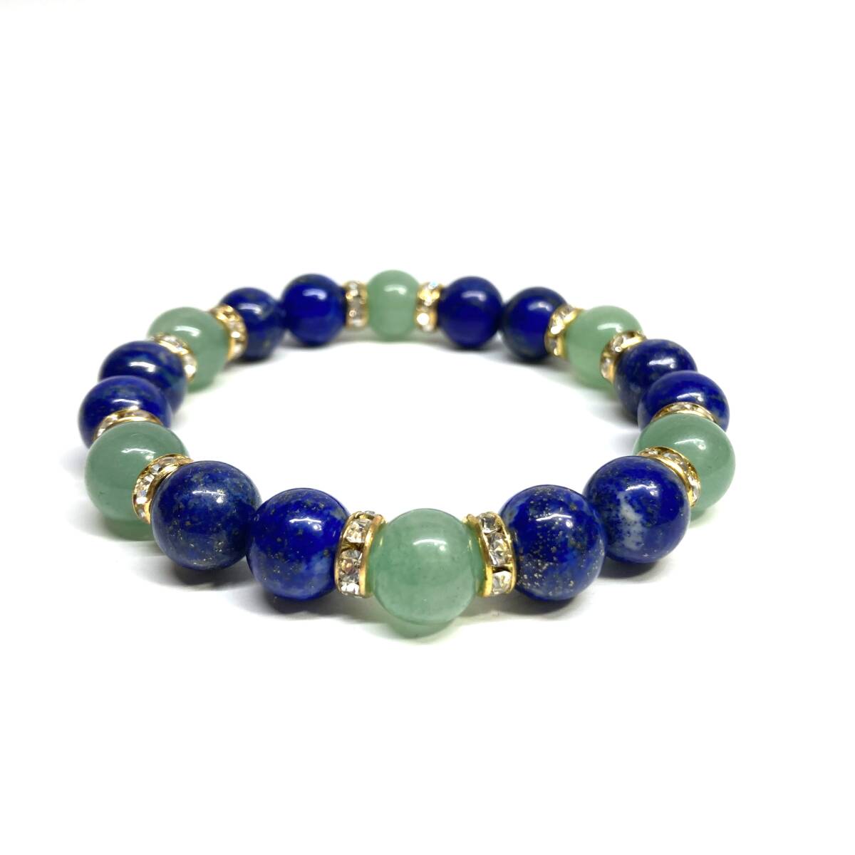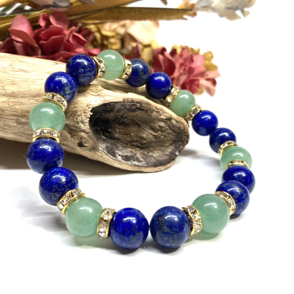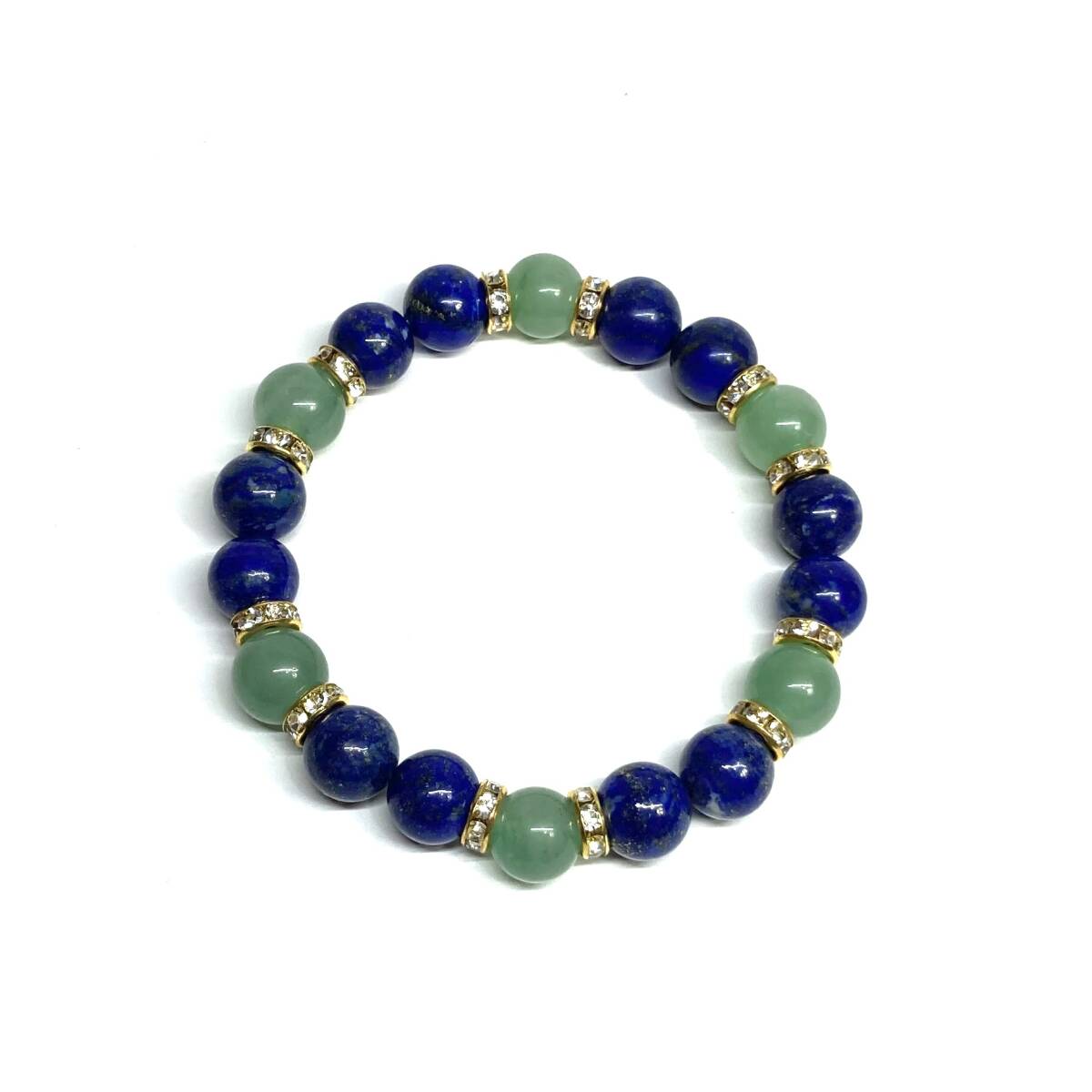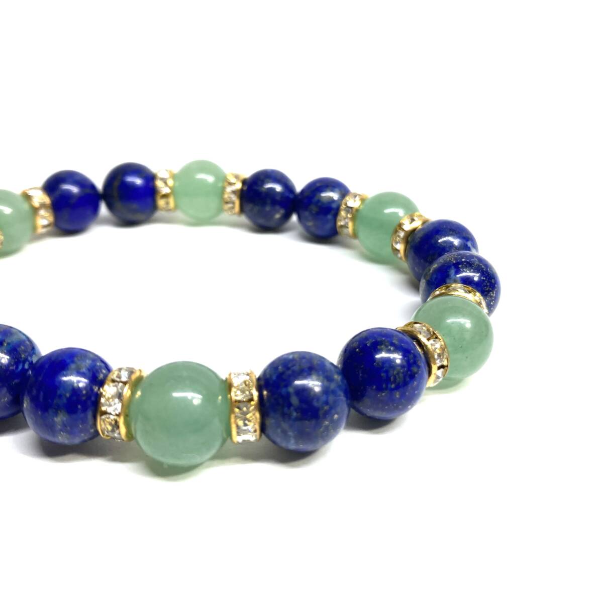 こちらは、ラピスラズリとアベンチュリンを組み合わせたパワーストーンブレスレットです。間にはロンデルを挟み高級感あるデザインに仕上げております。石大きさは腕にも馴染みやすいように10mm玉で内径約18cm(伸可能)です。(サイズ変更の場合は取引ナビにてご連絡をお願いします。) 数に限りがございますので気になる方はお早めにどうぞ。