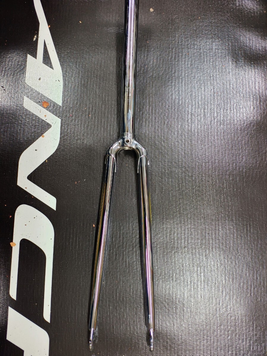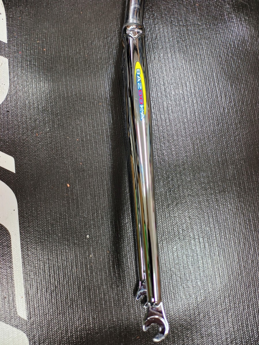Bazooka というRACEFACE、Jagwire の輸入代理店でもあるTak21がフォークの専業工場に製作を依頼して作ったフロントフォークです。ビンテージというよりはカーボンフォーク等に採用されているオーバーサイズと言われる1-1/8サイズのコラムを採用した他に類するものがないフロントフォークです。お使いのフレームがオーバーサイズと言われるアヘッドであれば、ヘッドセットの下玉押しを組み替えてお使いいただけます。