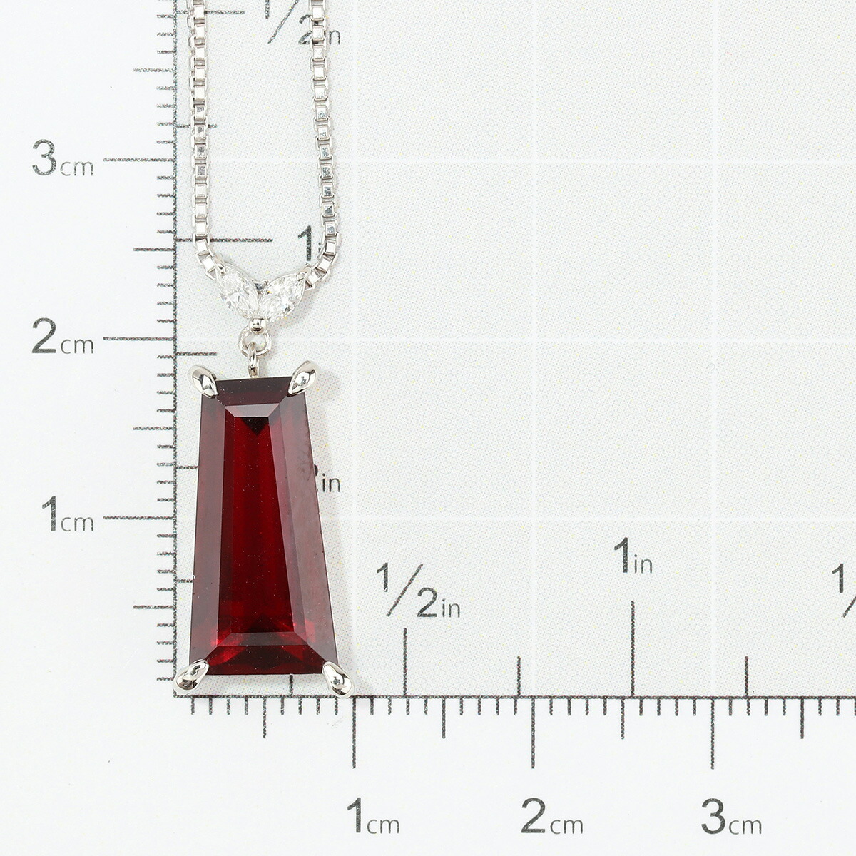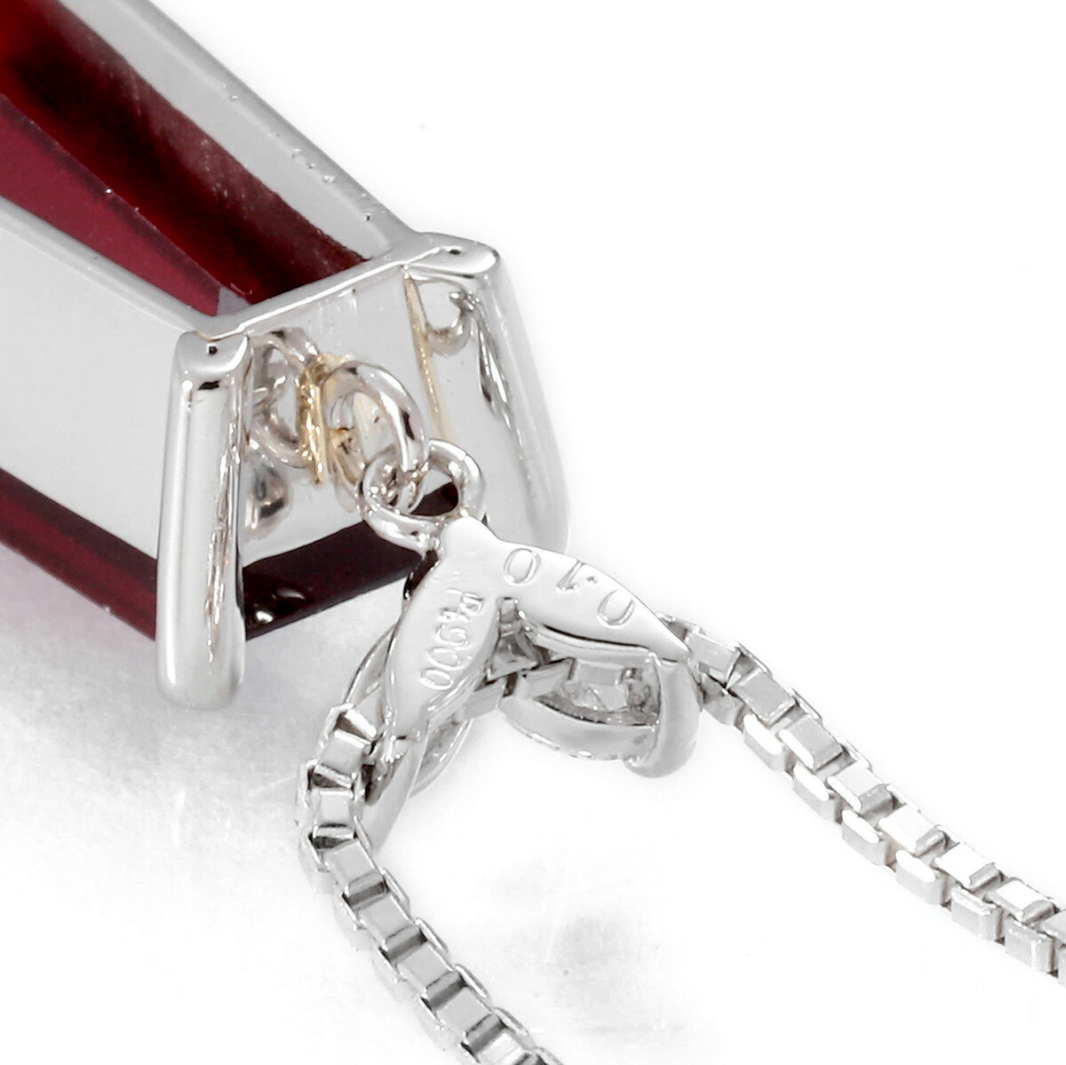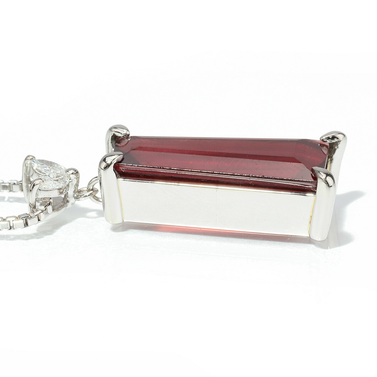 6.19ctのガーネットが放つ深みあるワインレッドが魅力のペンダントネックレス。縦長のテーパードカットが洗練された印象を演出し、上部にあしらわれたメレダイヤが繊細な輝きを添えます。プラチナの気品が引き立つ、スタイリッシュな一品です。デイリーにも特別な日にも映える、上品で存在感のあるデザインです。