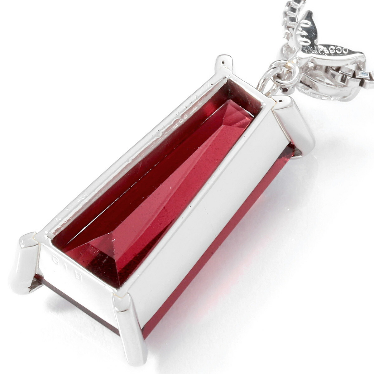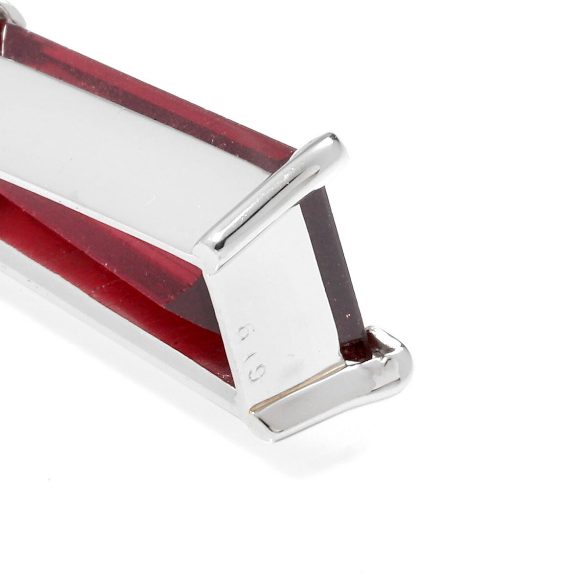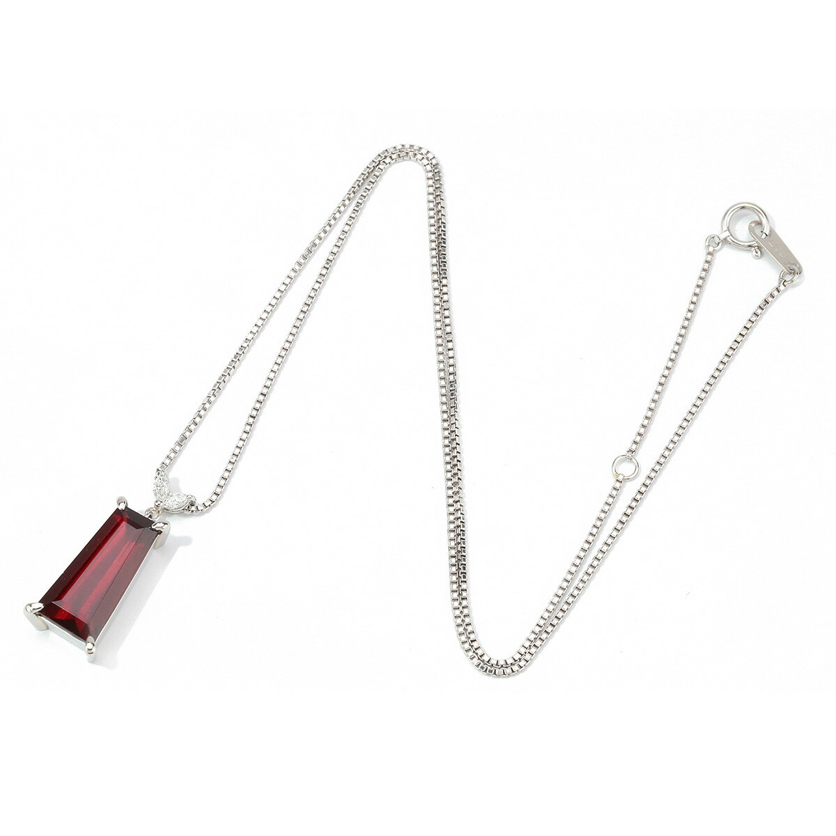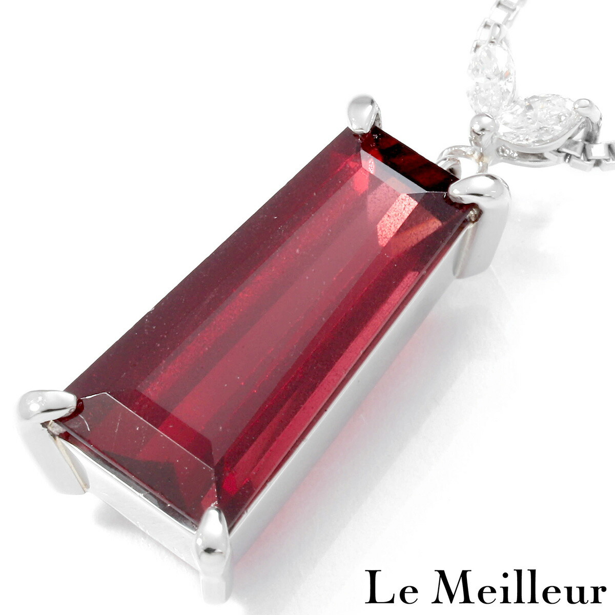 6.19ctのガーネットが放つ深みあるワインレッドが魅力のペンダントネックレス。縦長のテーパードカットが洗練された印象を演出し、上部にあしらわれたメレダイヤが繊細な輝きを添えます。プラチナの気品が引き立つ、スタイリッシュな一品です。デイリーにも特別な日にも映える、上品で存在感のあるデザインです。