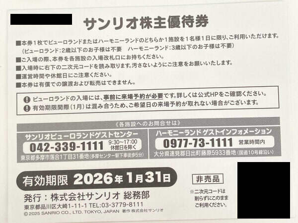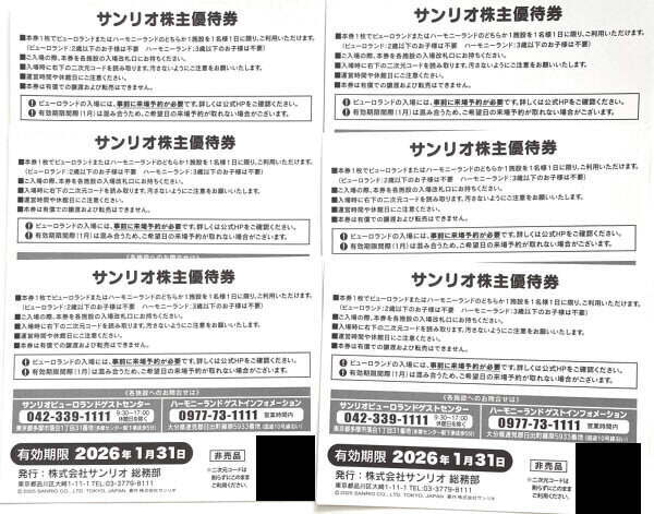 株主優待券 サンリオ ピューロランド ハーモニーランド 6枚 2026.1.31まで 送料無料