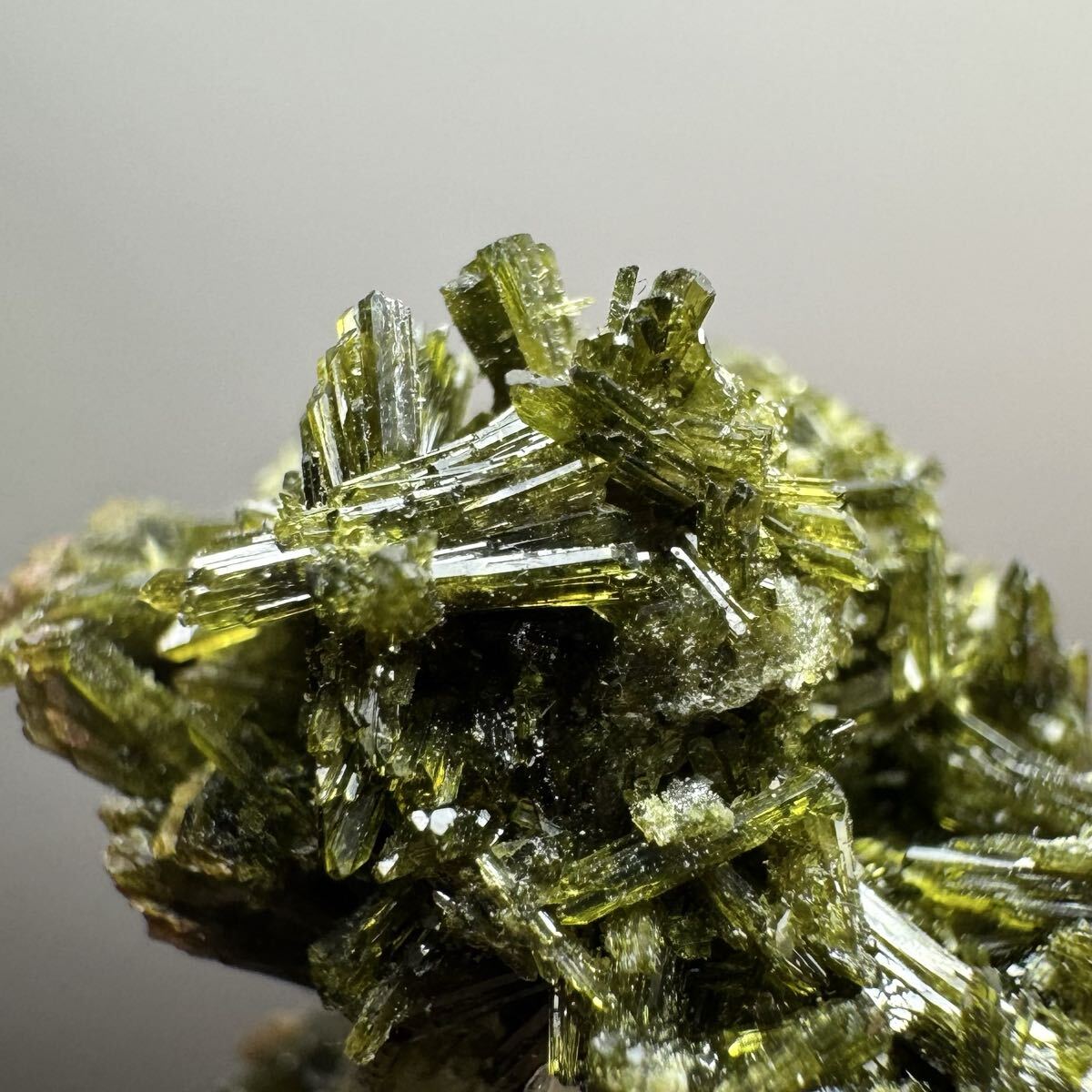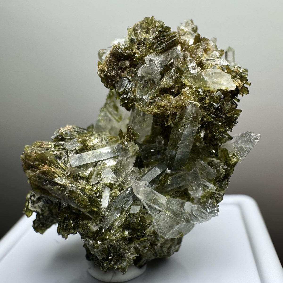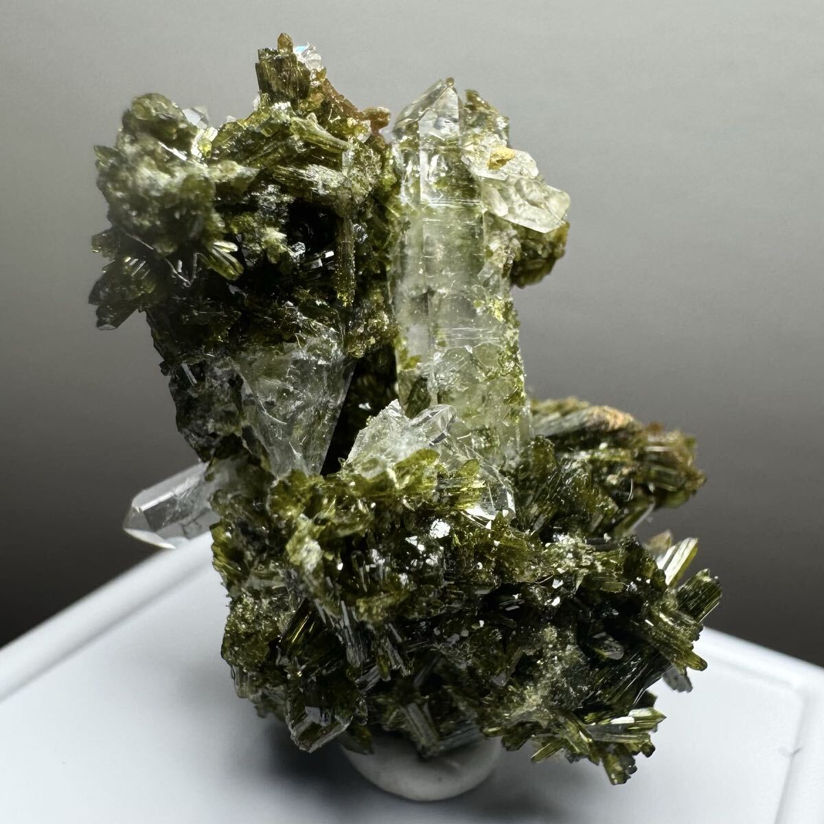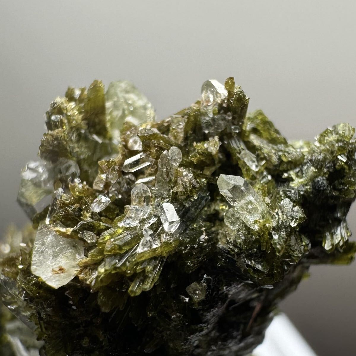 たくさんのエピドートの結晶と水晶が共生している原石です。
