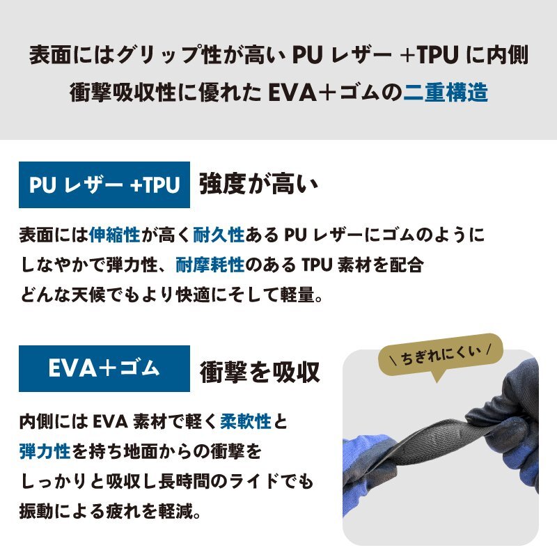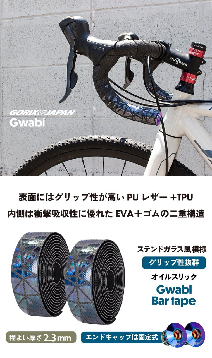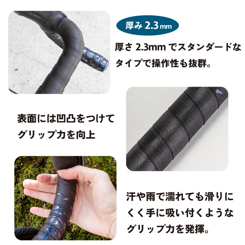 表面にはグリップ性が高いPUレザー+TPUに内側は衝撃吸収性に優れたEVA+ゴムの二重構造。 ブラックベースに先端はオイルスリック柄がちりばめられたステンドグラスのようなおしゃれなバーテープです。 厚さは 2.3mm で標準タイプ、操作性と衝撃吸収力理想的は高いコントロール性を発揮。 グリップ力が優れ地面からの衝撃もしっかりと吸収します。耐久性、耐摩耗性、強度があるバーテープです。 ロードバイクのカスタマイズに適したブラックベースの2カラー柄デザインに仕上がっています。 [PUレザー+TPU] 表面には伸縮性が高く耐久性あるPUレザーにゴムのようにしなやかで弾力性、耐摩耗性のあるTPU素材を配合 どんな天候でもより快適にそして軽量。強度が高いので巻きやすい。 [EVA+ゴム] 内側にはEVA素材で軽く柔軟性と弾力性を持ち地面からの衝撃をしっかりと吸収し長時間のライドでも振動による疲れを軽減。 [厚さ2.3mm] 厚さ2.3mmでスタンダードなタイプ。ロングライドから自転車通勤や通学、レースまで幅広く使えます。 ダイレクト感も程よくあり操作性に高いコントロール性を発揮。 [グリップ力] 表面には凹凸をつけてグリップ力を向上。汗や雨で濡れても滑りにくく手に吸い付くようなグリップ力を発揮。 [触り心地・感触] 感触の良い握り心地と程よい薄さで手に吸い付くような触り心地。 バーテープ表面はベタベタしないで不快感はない。 [カスタム] ブラックベースに先端はステンドグラスの様な模様をオイルスリック柄で散りばめたデザイン。 地味にならず派手にならず丁度いいシンプルで落ち着いた印象に。 個性も残しつつどんなロードバイクにもコーディネートしやすい柄とカラーになっていてカスタマイズも楽しめます。 [ネジ式エンドキャップ] バーテープ先端部分を固定してバーテープがほどけないようにするエンドキャップは、転倒時やぶつかったりした時にハンドル先端部分の破損を防ぐのにも役立ちます。 このエンドキャップは外れにくいネジ式タイプで固定力が通常のエンドキャップより優れています。 美しくかっこいいオイルスリックカラーはハンドル周りのワンポイントカスタムに最適。 商品内容バーテープ×2本、オイルスリックエンドキャップ×2個、エンドテープ×2枚 材質表面PUレザー, TPU, 裏面EVA+ゴム(裏面は取外してから、もう一回再利用可能) サイズ厚み2.3mm*長さ2150mm | |