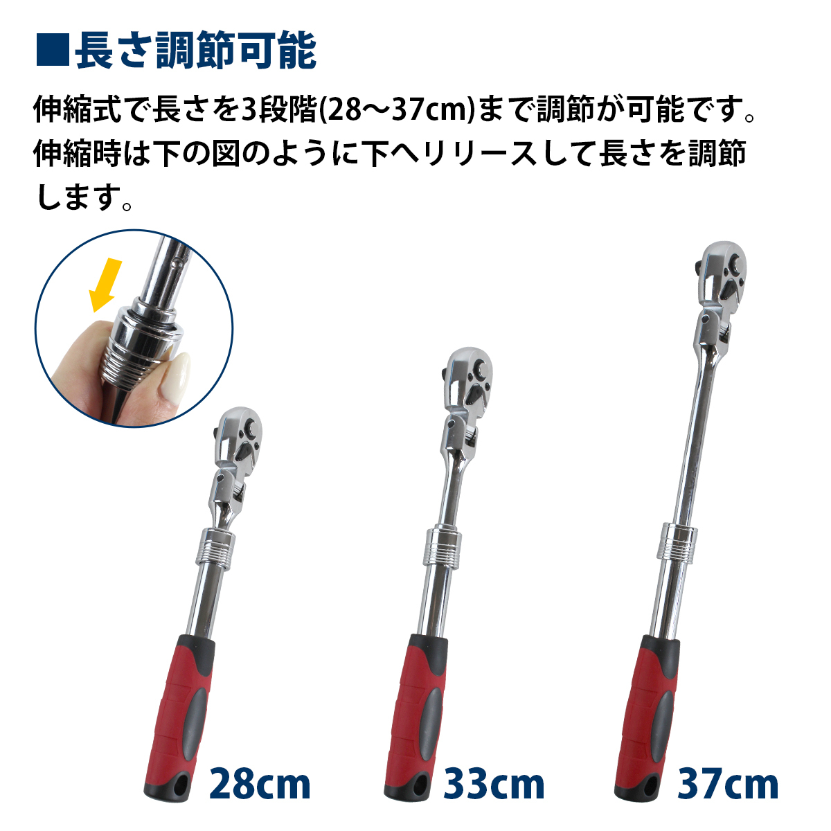 【送料無料】180度 首振り 全長伸縮 ラチェット 28cm~37cm 72ギア 差込角 3/8 9.5mm ラチェット ハンドル ソケット 長さ3段階調整式