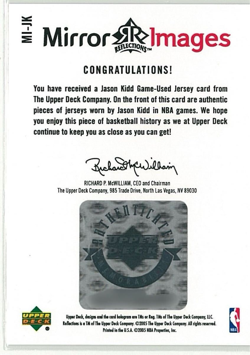 NBAを代表するポイントガードだったジェイソン・キッドこ10枚限定 upper deck reflections mirror images jersey card です。