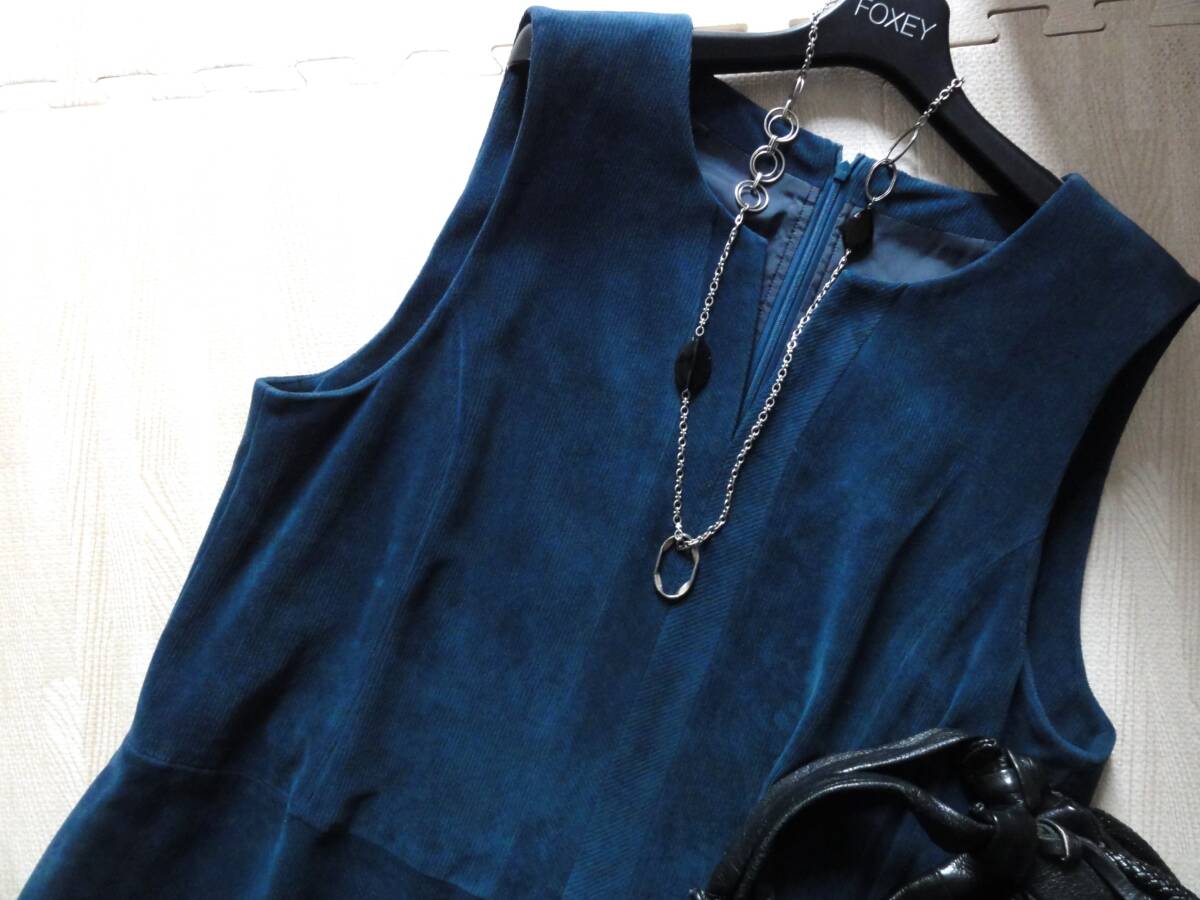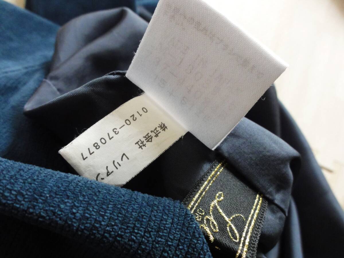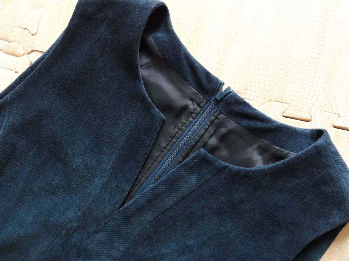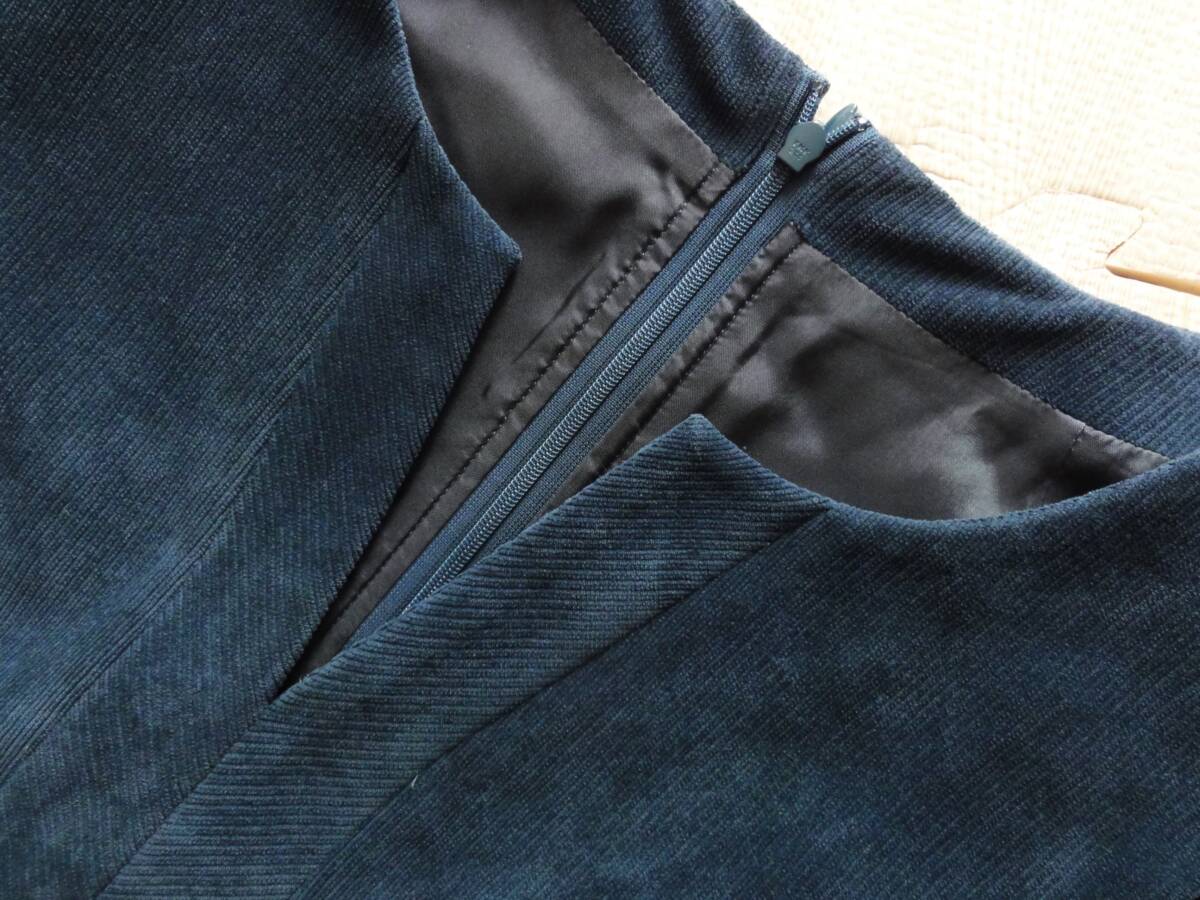 お色は濃浅葱色系、後ろ上部ファスナー開閉、ウエスト切り替え、