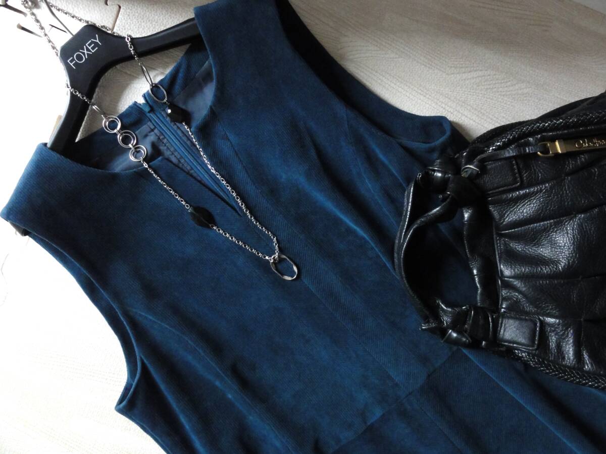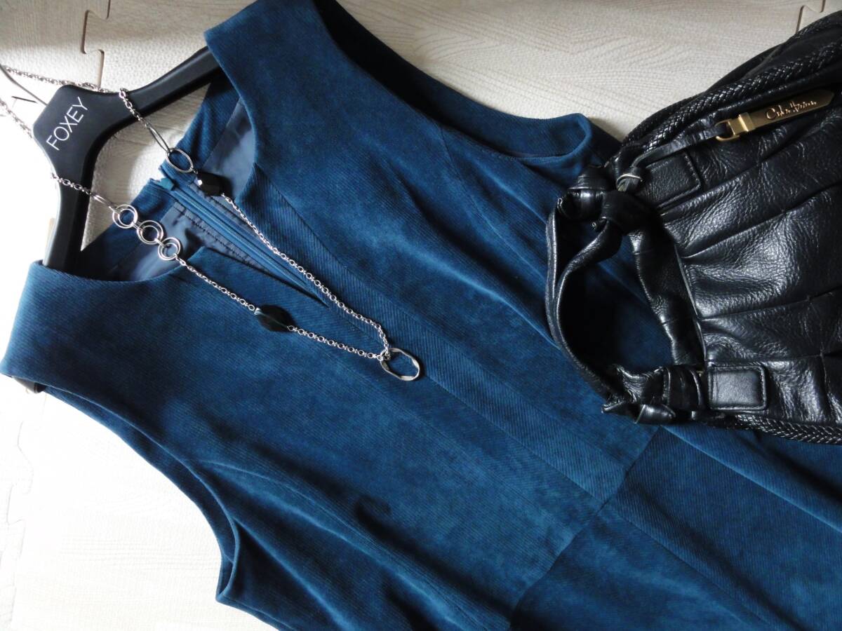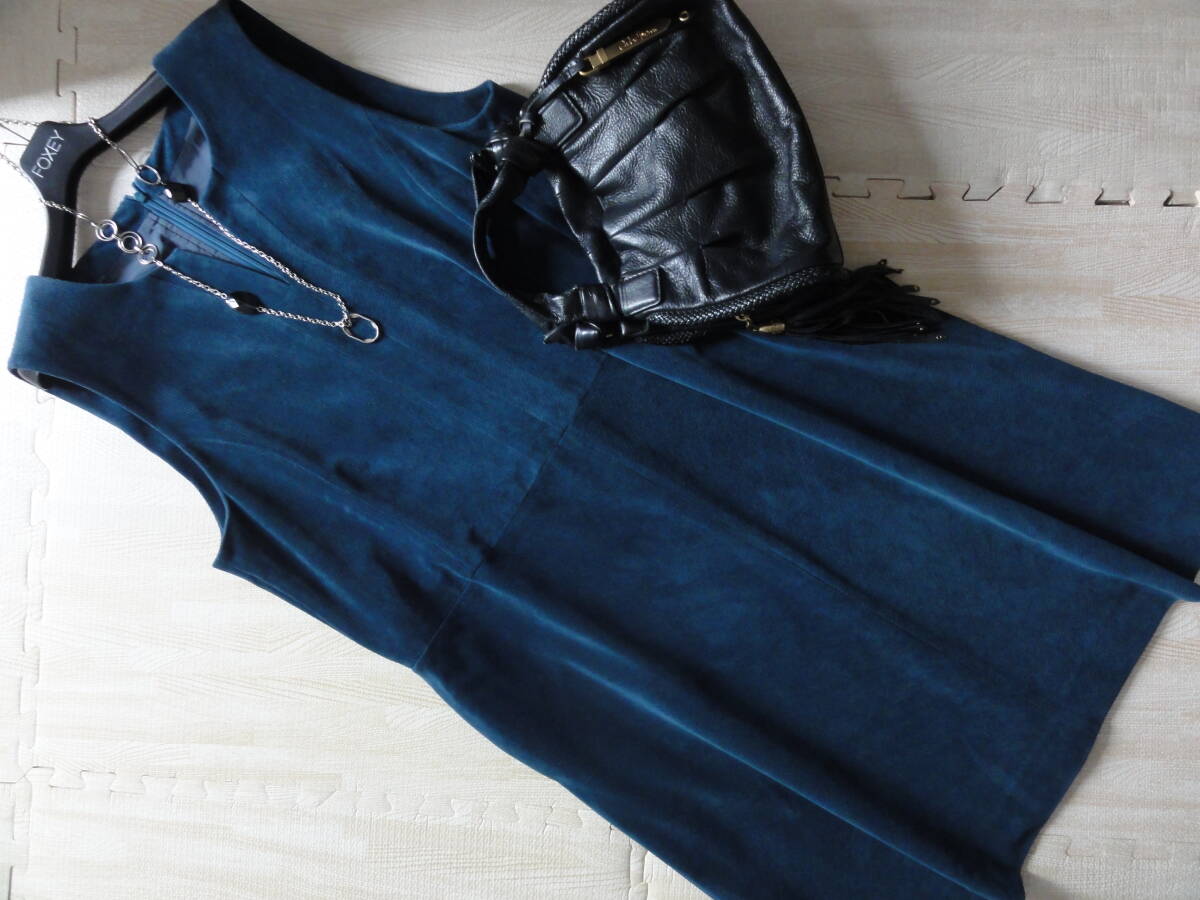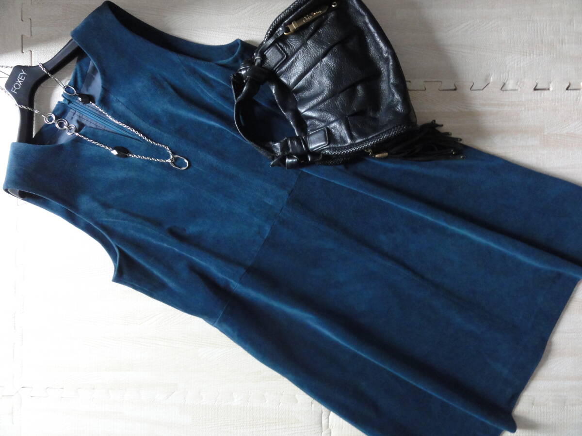 お色は濃浅葱色系、後ろ上部ファスナー開閉、ウエスト切り替え、
