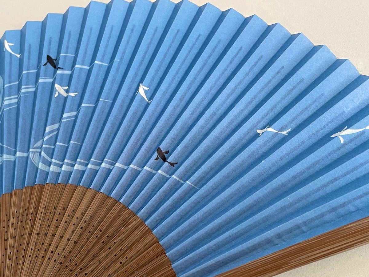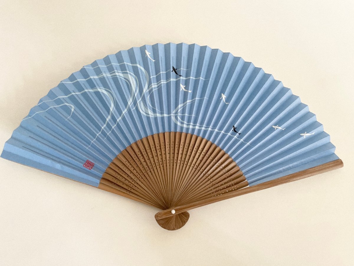紳士用 紙扇子〈香り付〉 唐木中彫 紺地 流水鮎 せんす お土産 贈り物 インテリア