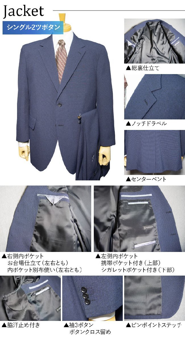 | ジャケット | シングル2ボタン ノッチドラペル 総裏 センターベント 袖3ボタン ボタンクロス留め ピンポイントステッチ 汗止め付き お台場仕立て 携帯ポケット シガレットポケット |