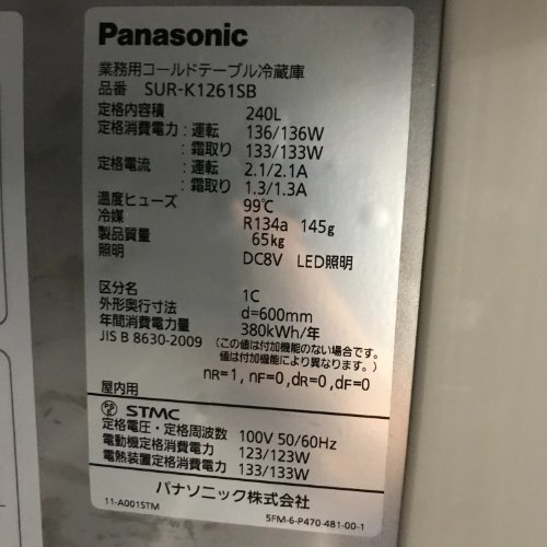 冷蔵コールドテーブル パナソニック(Panasonic) SUR-K1261SB 業務用 中古/送料別途見積