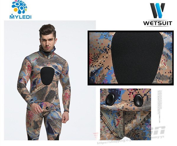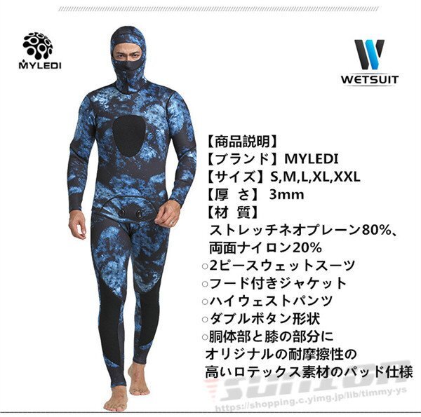 【商品説明】【ブランド】MYLEDI【サイズ】S,M,L,XL,XXL,3XL【厚 さ】 3mm○2ピースウェットスーツ○フード付きジャケット○ハイウェストパンツ○ダブルボタン形状○表面素材:超弾力性ネオプレン 通気性に大変優れており、簡単に装着が可能です。○内部素材:オープンセルネオプレン○胴体部と膝の部分にオリジナルの耐摩擦性の高いロテックス素材のパッド仕様☆素材は優れた弾性新世代のネオプレンです。優れた機能性と高い保温性ができます。日本特有の地磯、岩礁地帯や海藻が生えた海底にマッチおり、優れたカモフラージュ機能を発揮します☆スムーススキンの生地は、撥水性がよく気化熱による体温低下に強いため、海面で長時間過ごすフリーダイバー、スキンダイバーには人気です。【保管について】☆海から上がったら、なるべく早めに洗う。☆熱いお湯はNG、必ず水かぬるま湯で洗う。☆乾燥は直射日光を避け、細いハンガーは使用しない。しっかりと乾燥したら、なるべく早めに表面へ戻す。