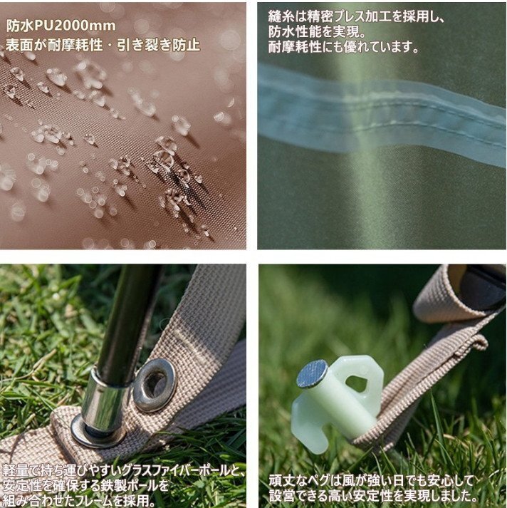 【優れた防水性とUVカット性能】150Dシルバーコーティングオックスフォード生地を採用し、PU2000mmの防水性能を実現。突然の雨でも安心して使用でき、水漏れの心配がありません。また、生地表面のシルバーコーティングにより、紫外線を効果的に遮断。強い日差しからもしっかり守るので、晴れの日も快適にお過ごしいただけます。アウトドア初心者からベテランキャンパーまで、どんな天候でも快適してご利用いただけるテントです。