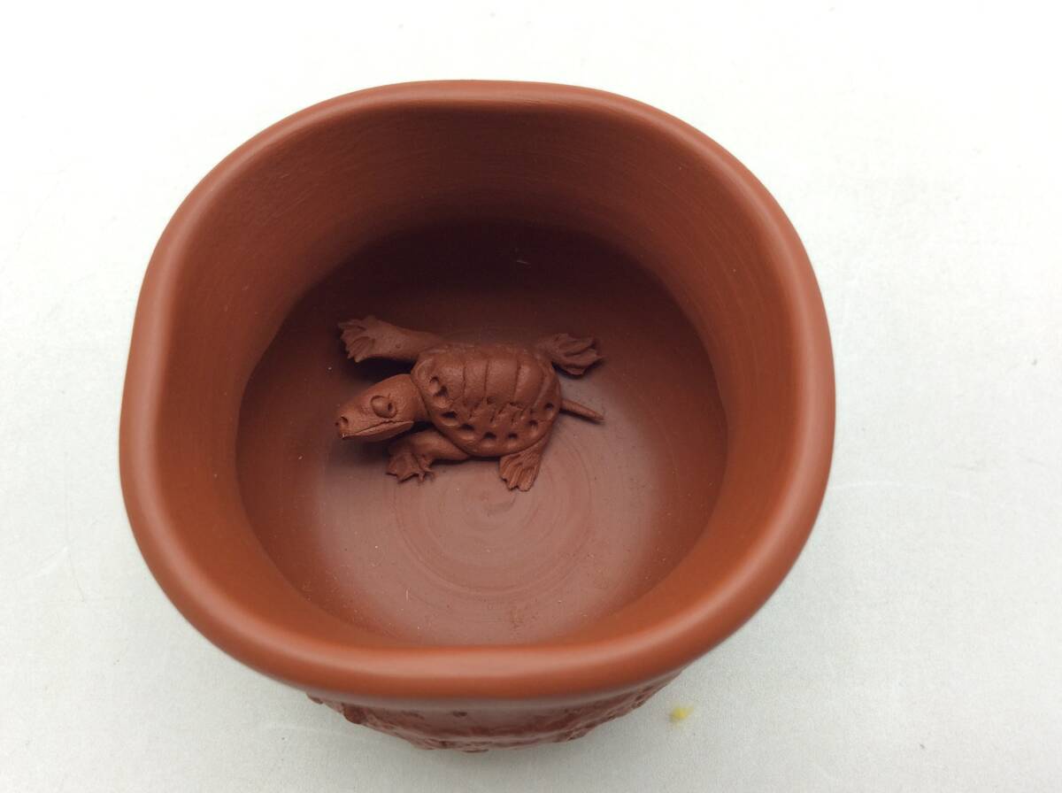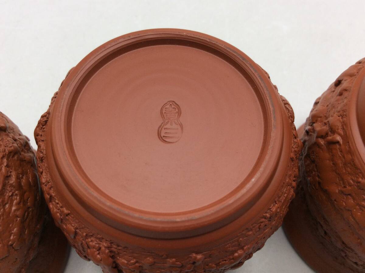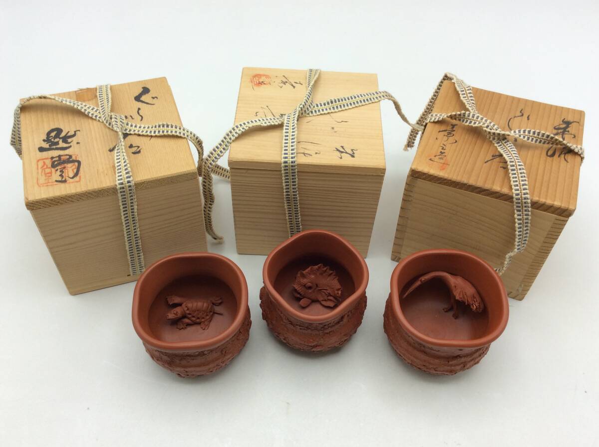 【3客セット】常滑焼 朱泥 不識庵 素三造 井上素三 ぐい呑み 盃 おちょこ 亀 鯉 鳥 約口径5.0㎝×高さ4.8㎝ 陶芸 酒器 茶器 木箱付き