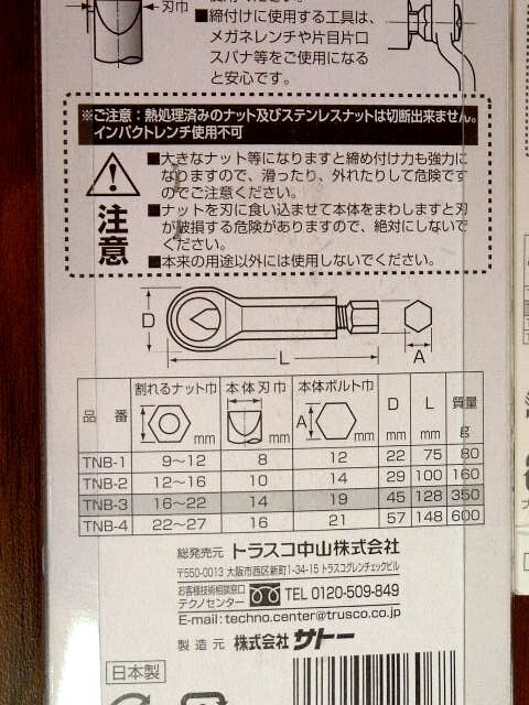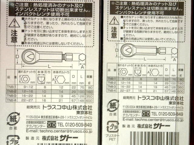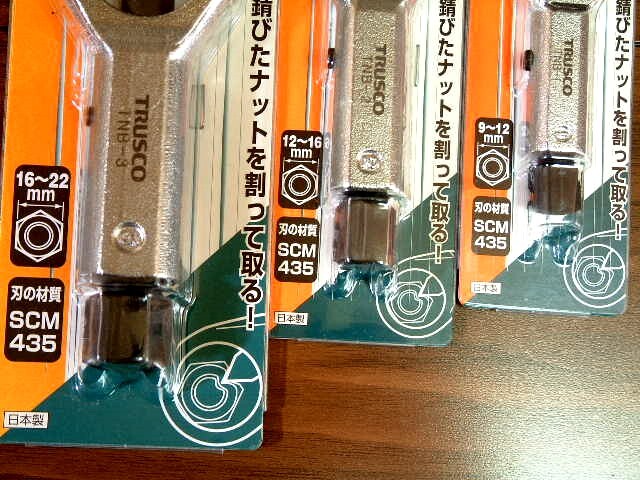 トラスコ中山のナットブレーカー3種、TNB-3(16~22mm)、TNB-2(12~16mm)、TNB-1(9~12mm)、計3点未開封品の出品です。簡単な仕様は画像をご参照下さい。詳細はメーカーホームページでお願いします。画像をご参考に、よくご検討のうえご入札下さい。ノークレーム、ノーリターンで宜しくお願いします。送料は無料です。発送は、レターパックライトを予定しています。