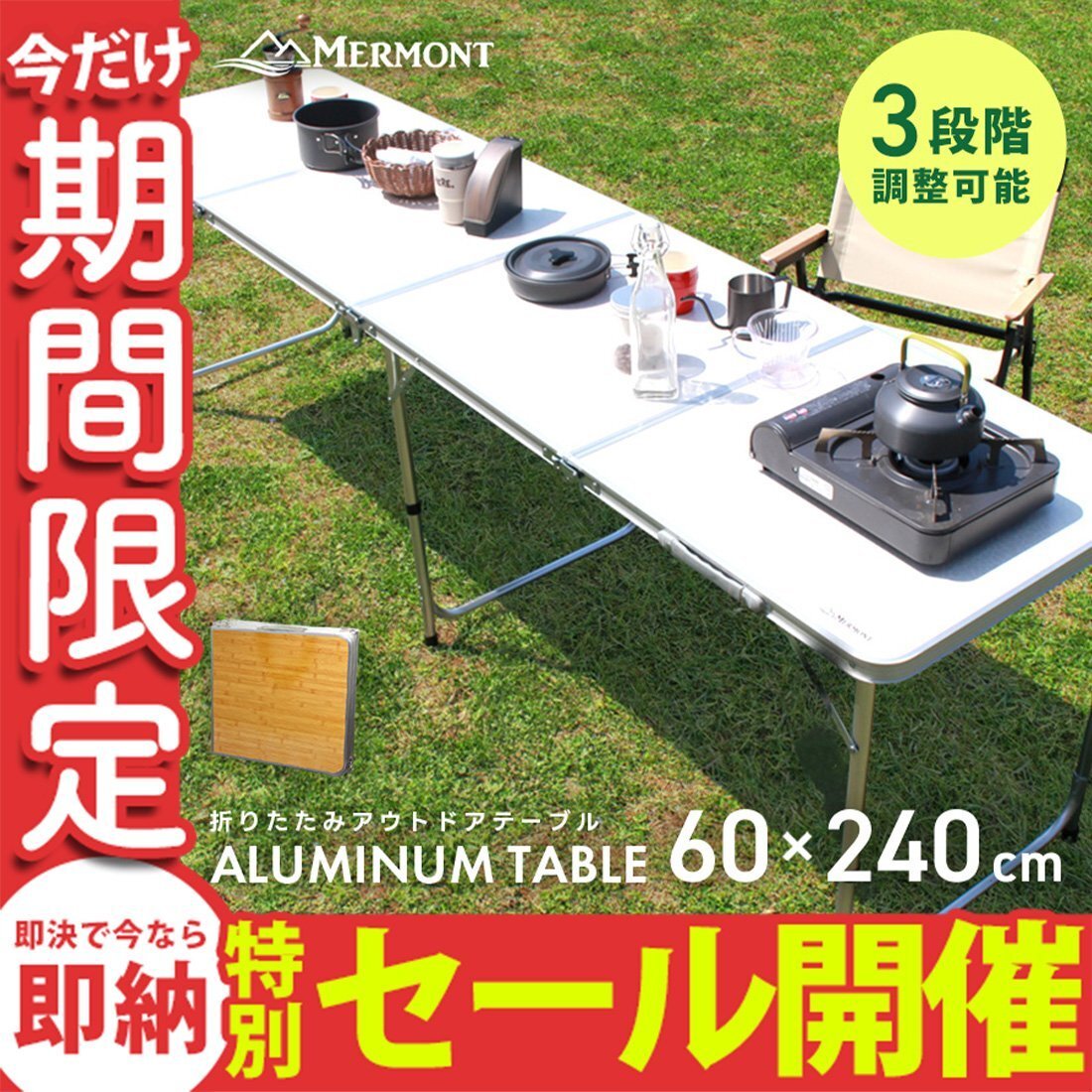 | かんたん組立の折りたたみアウトドアテーブルです。 広々サイズの240cm×60cm!! サビに強いアルミを使用! 天板には防水加工が施されています。 必要のない時は折りたたんで収納できる!! 取っ手付きで持ち運びもラクラク♪ 高さは「ハイスタイル」「ミドルスタイル」「ロースタイル」の3段階調節。 お好みや用途に合わせて使い分けることができる嬉しい仕様♪ キャンプ、バーベキュー、お花見などにとても便利! 【商品仕様】 カラー:ベージュ テーブルサイズ(約):幅240cm×奥行60cm×高さ55cm/62cm/70cm(※高さ3段階調節) 収納サイズ(約):60cm×60cm×13cm 耐荷重(約):30kg 重量(約):9.5kg 材質:アルミニウム 他 【注意事項】 海外製品で簡易梱包での輸入のため風防に擦れや多少の小キズなどがある場合がございますが、商品自体には問題ありませんのでご了承下さい。 |