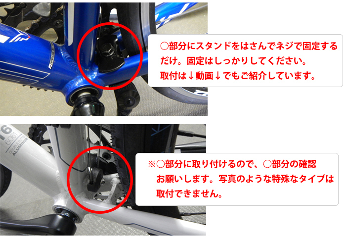| ロードバイクやマウンテンバイク、クロスバイクのスタンドに。 スマートで細身軽量ながらもしっかりとしたアルミ製のキックスタンドです。 車体のチェーンステーに取り付けるタイプのセンタースタンドになります。 取り付けも簡単でチェーンステー上下から挟んでボルトで固定するだけ、1度取り付けたら足先で操作するだけで取り外し不要になります。 脚の長さも11cm伸縮調整可能。 内容 サイズ:取り付け箇所:幅3.1x高さ2.6x奥行5.8cm 脚長さ26~37cm(11cm伸縮調整可能)、Φ1.5cm 重量:250g 適合サイズ:20~28インチ 取付サイズ:チェーンステー厚3cm 材質:アルミ 必要工具:1.4cmボルトを締めるレンチ 脚の長さ調整用プラスドライバー (工具は付属しません) ※カーボンフレームには危険なので取付できません。 ※フレームの形状によって取付できない場合があります。 ※スタンドとペダルがあたる場合は取付角度をかえてみると対処できます。 | |