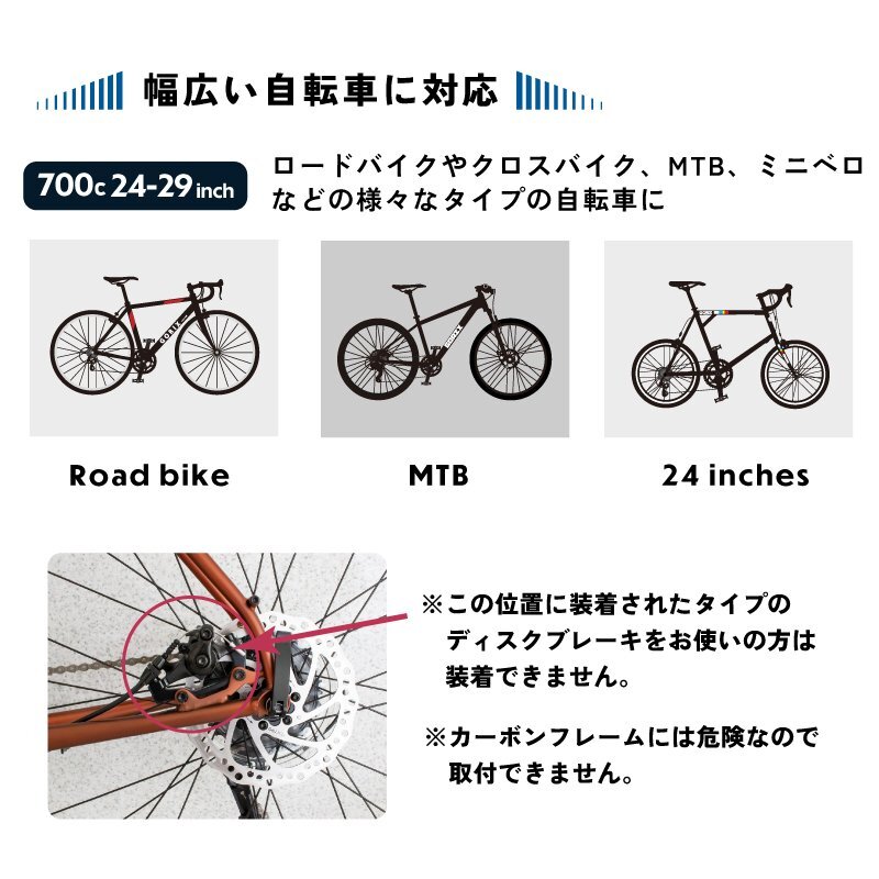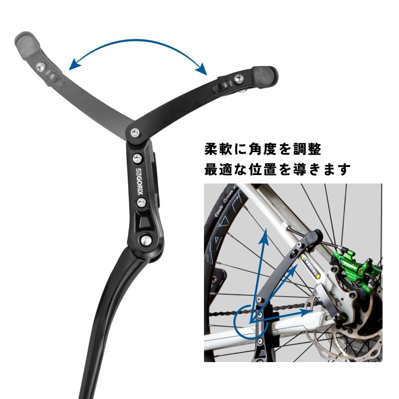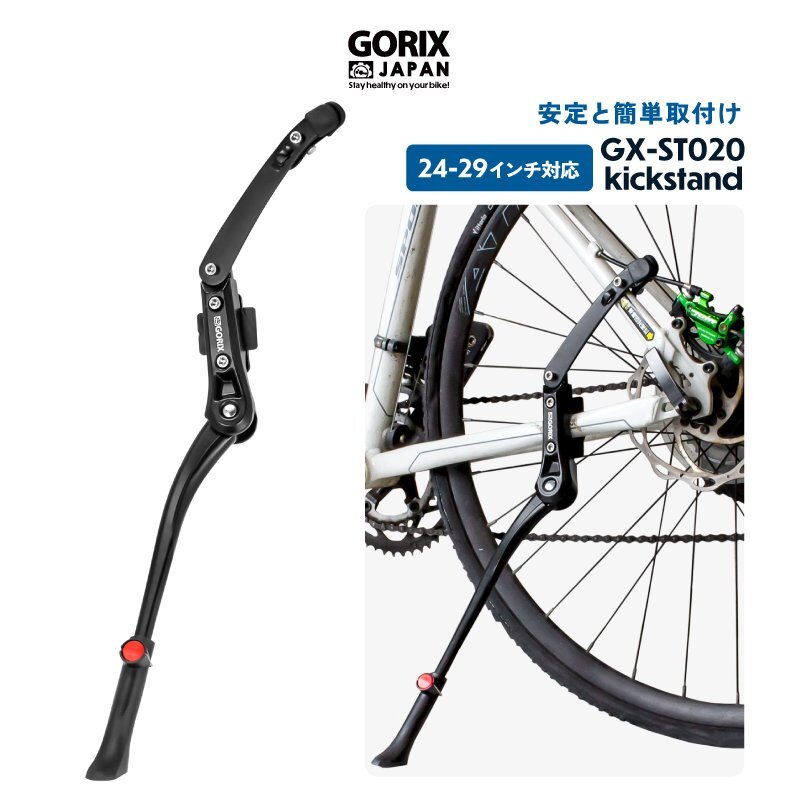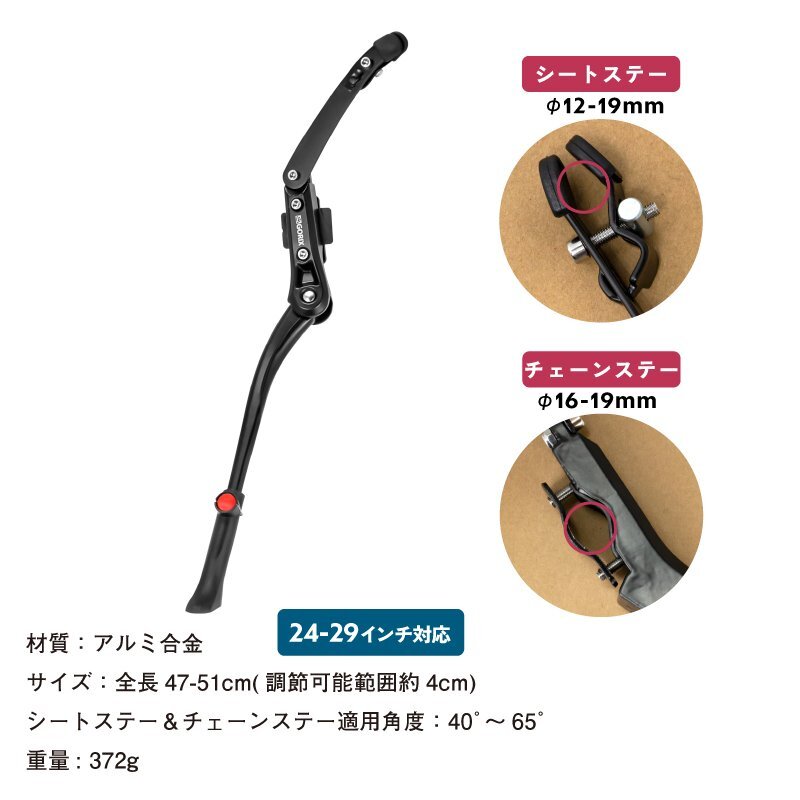 自転車の車体に取付るキックスタンド。 一度取り付ければ取り外し不用で足先だけで簡単に操作ができる安定型スタンドです。 自転車通勤や通学、買い物など頻繁に駐輪する事が多いのであれば自立するスタンドを使うのをおすすめします。 ロードバイクやクロスバイク、マウンテンバイク、ミニベロなど24-29インチ(700C)までは幅広い自転車に対応。 2点固定でしっかりと自転車を支えるので自転車はバランスよく安定して倒れにくい。装着も簡単。 ※カーボンフレームには危険なので取付できません。 ※ディスクブレーキの位置によっては装着できませんのでお持ちの自転車の位置をご確認下さい。 [2点固定] チェーンステーとシートステーの2点に固定して使用します。2点に固定する事で片足スタンドでも不安定にならずバランス良く自立します。 しっかり支える事で自転車も倒れにくい。 [幅広い自転車に対応] スタンドの脚の長さを調整する事で24-29インチまで対応します。 700cのロードバイクやクロスバイク、マウンテンバイク、ミニベロなど幅広い自転車をカバーします。 [アルミ素材] アルミ合金素材は軽量で強度が高く耐久性に優れています。 また防錆でサビに強く屋外で使用するのに向いています。 [ボタン調整] ボタン一つでスタンドの長さを調整可能で自転車に装着してからも楽に再度調節できる。 [滑り止め] 脚の裏には凸凹の滑り止め加工を施し地面と接しても滑りにくい。 底部分は強化プラスチックを採用し硬く頑丈に仕上がっています。 商品内容自転車用キックスタンド 材質アルミ合金 サイズ全長47-51cm(調節可能範囲約4cm) シートステー&チェーンステー適用角度40゜~65゜ シートステー直径16~19mm チェーンステー直径12~19mm 適用サイズ24-29"インチ(700c) 重量372g 《ご注意》 ※カーボンフレームには危険なので取付できません。 ※ディスクブレーキの位置によっては装着できませんのでお持ちの自転車の位置をご確認下さい。 | |