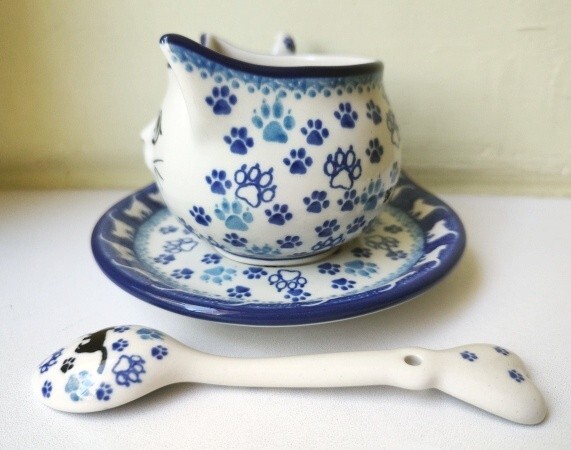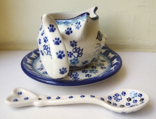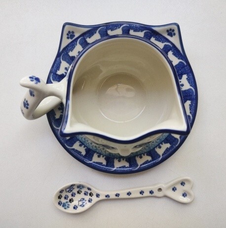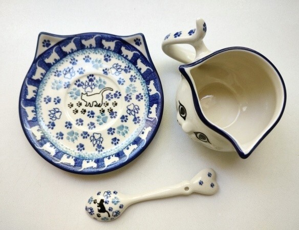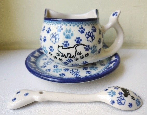 ポーランド ボレスワヴィエツ陶器 猫型カップ&ソーサー&スプーン 白/黒猫&足跡です。