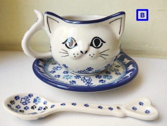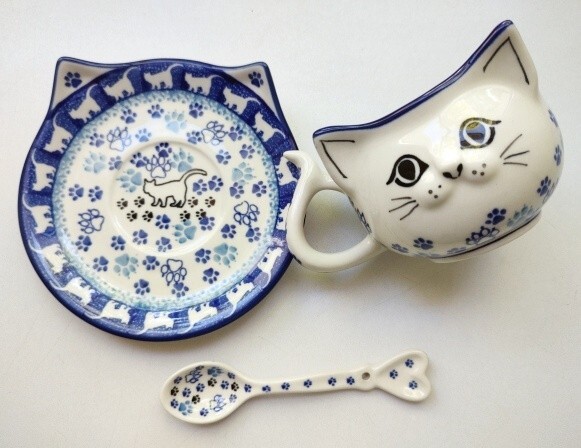 【在庫3セット】x976 ポーランド陶器 猫型カップ&ソーサー&スプーン 白/黒猫&足跡 B ポーリッシュポタリー 食器