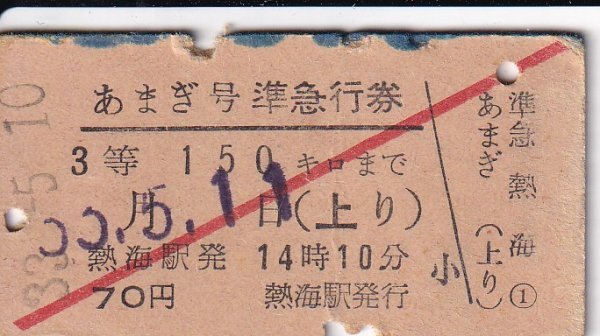 鉄道切符 硬券 国鉄 あまぎ号 準急行券(3等) 熱海駅 上り
