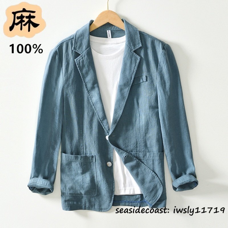 超希少*テーラードジャケット メンズ 春夏秋 リネンジャケット 麻100% 無地 清涼感 通気性 ブレザー 麻スーツ 紳士服 鮮やか ブルー 3XL