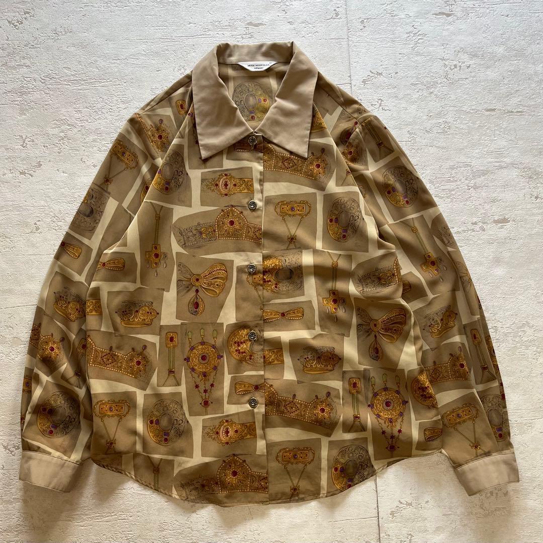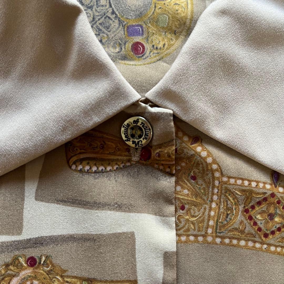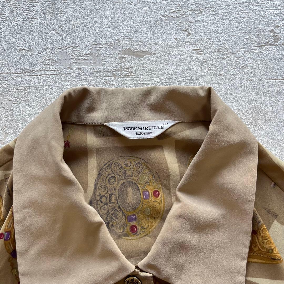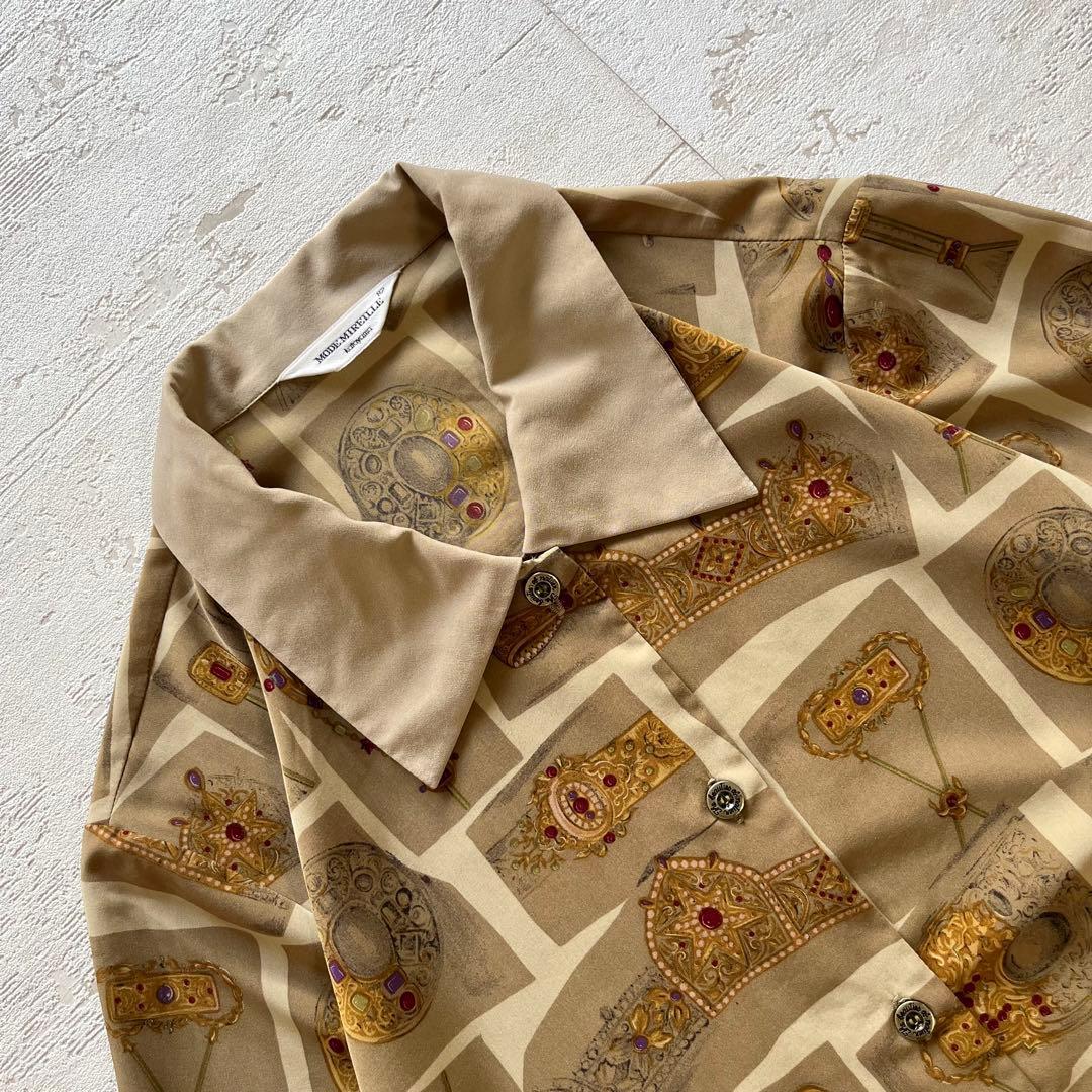 クラシカルな王冠や宝石モチーフが並ぶ、アート感のある昭和レトロプリントシャツ。落ち着いたベージュトーンにゴールドやルビー色のアクセントが映え、大人の遊び心を感じる一枚です。光沢のあるしなやかな生地で高級感があり、ジャケット感覚で羽織っても◎。個性派コーデや古着スタイルのポイントにおすすめ。