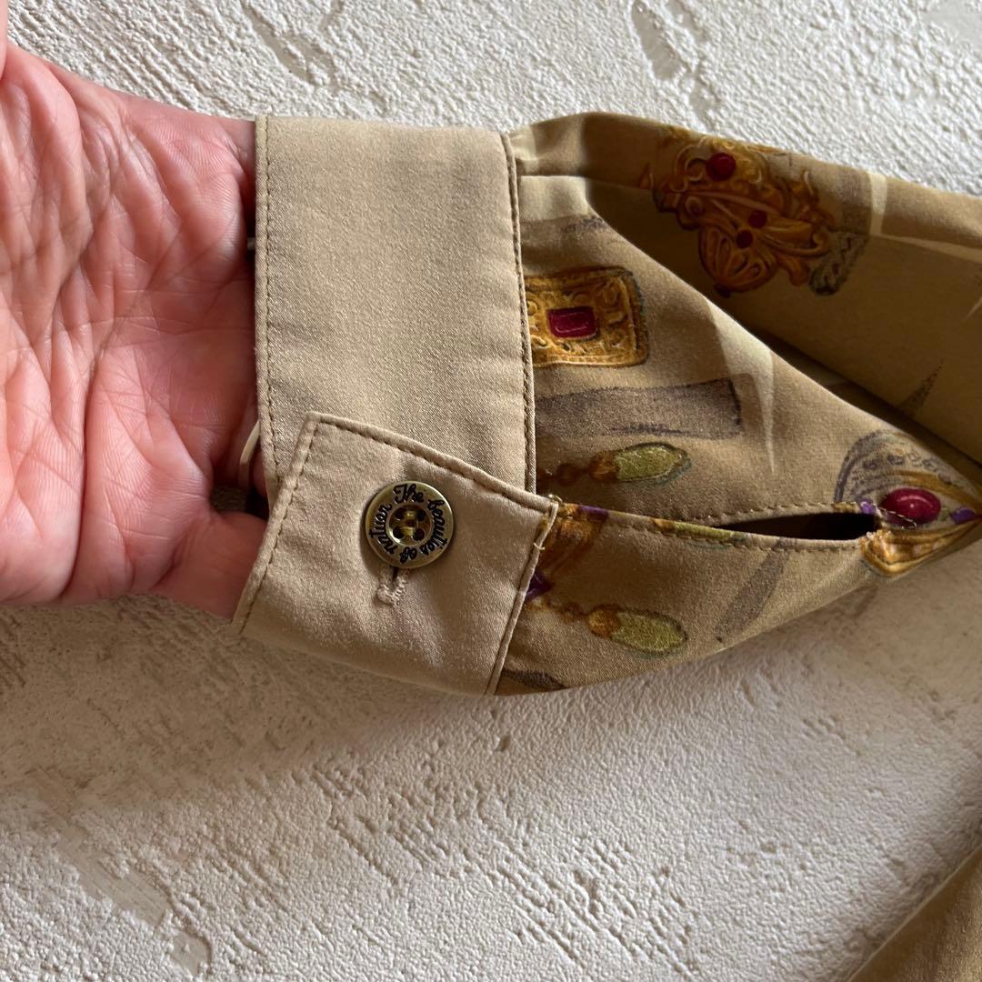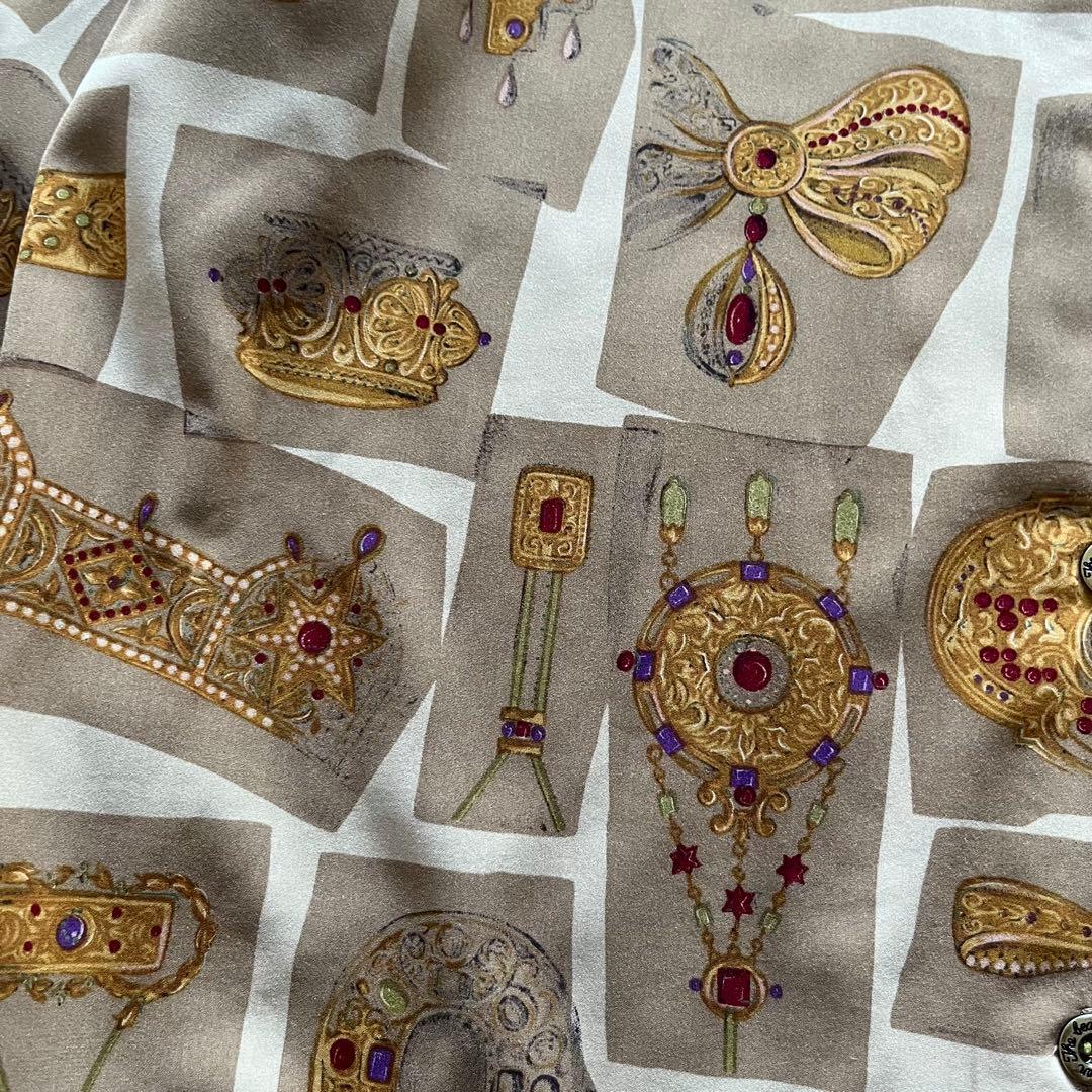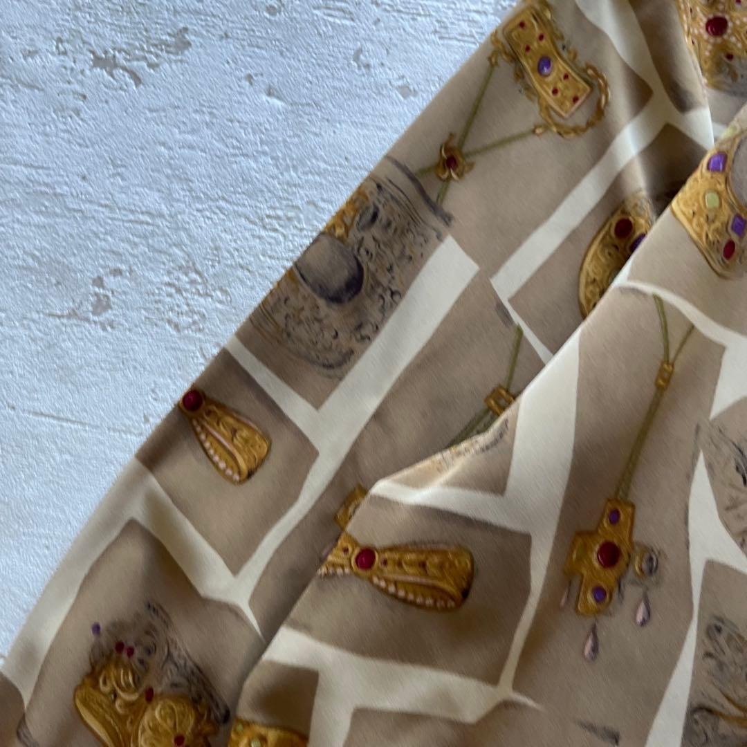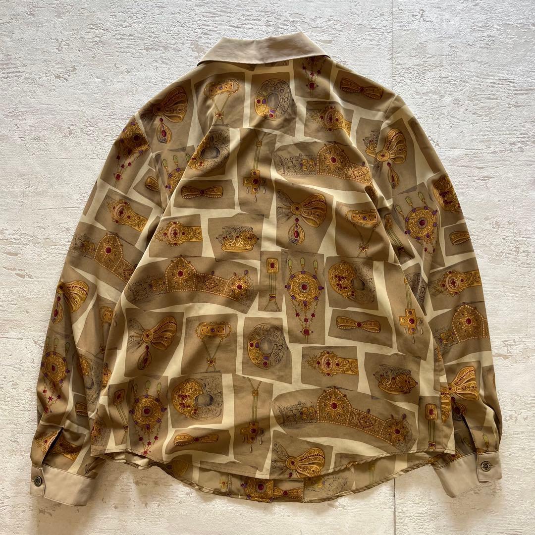 クラシカルな王冠や宝石モチーフが並ぶ、アート感のある昭和レトロプリントシャツ。落ち着いたベージュトーンにゴールドやルビー色のアクセントが映え、大人の遊び心を感じる一枚です。光沢のあるしなやかな生地で高級感があり、ジャケット感覚で羽織っても◎。個性派コーデや古着スタイルのポイントにおすすめ。