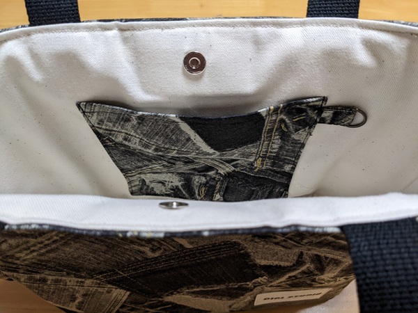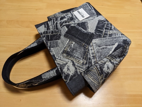 黒のヴィンテージデニムパッチ柄  両サイドポケット付手作りトートバッグ  Dカン付内ポケット