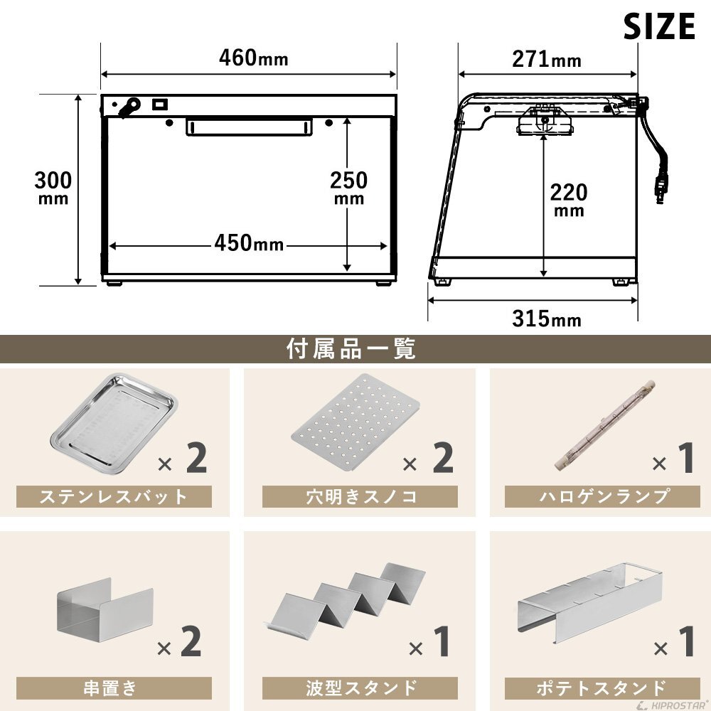 | 付属品 | ステンレスバット・穴明スノコ…各2枚 串置き…2個 波衝立…1個 ポテト立て…1個 ランプ…1個+予備1個 |