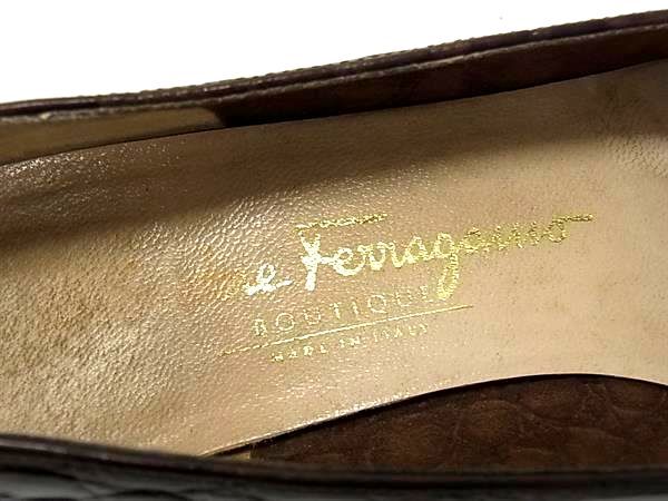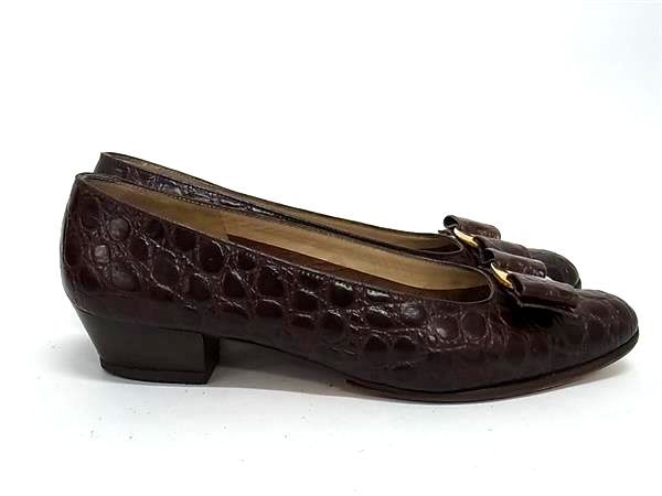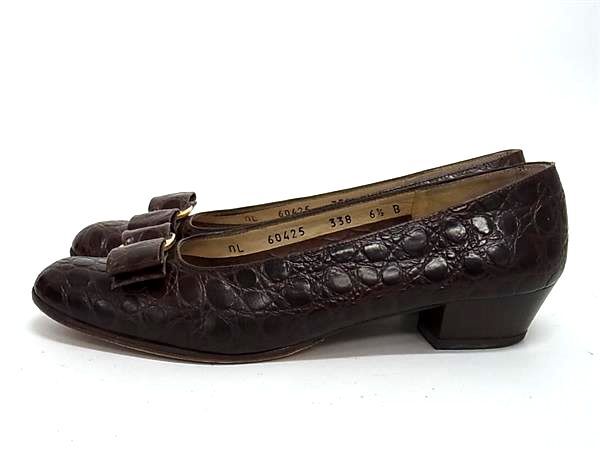 Salvatore Ferragamo フェラガモ ヴァラリボン クロコダイル型押しレザー ヒール パンプス サイズ6 1/2 (約24cm) 靴 シューズ DK0293