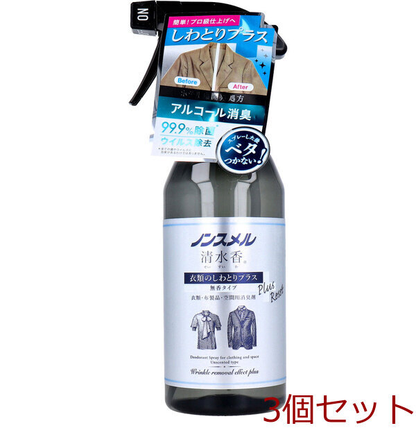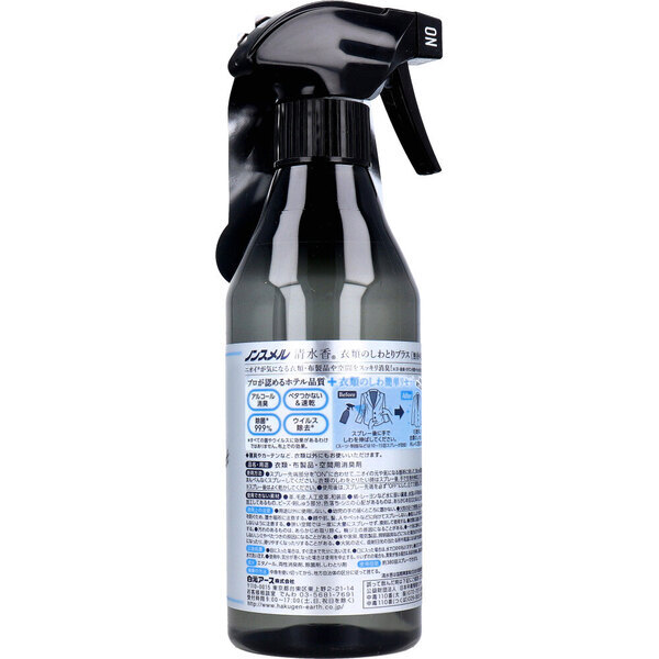 簡単!プロ級仕上げへ。 衣類・布製品の気になるニオイ(汗・体臭・タバコ・料理・ペットなどのニオイ)を消臭・除菌。 ウイルス除去にも。 空間にも使用できます。 ※すべての菌やウイルスに効果があるわけではありません。 布上での効果。 ・衣類のしわをキレイに整えるしわとり効果つきで簡単身だしなみケア。 ・スプレーした後にベタつきません。 速乾タイプ。 ・寝具やカーテンなど、衣類以外にもお使いいただけます。 ・無香料。 個装サイズ:85X218X65mm 個装重量:約452g 内容量:400mL 製造国:日本 【発売元:白元アース株式会社】 【品名・用途】 衣類・布製品・空間用消臭剤 【成分】 エタノール、両性消臭剤、除菌剤、しわとり剤 【使用方法】 ・スプレー先端部分を「ON」に合わせて、ニオイの元や気になる箇所に対して、30cm程度離し、まんべんなくスプレーしてください。 ・衣類のしわをとりたい時はスプレー後、手で生地を伸ばしてください。 (スーツ・制服などは10~15回スプレーが目安。) ※スプレー後はよく乾かしてください。 ・使用後は、スプレー先端を必ず「OFF」にして、立てて保管してください。 【使用できない素材】 ・革、毛皮、人工皮革、和装品。 ・絹・レーヨンなど水に弱い繊維、水洗い不可のもの、防水加工してあるもの、ビーズ・刺しゅう部分、色落ち・シミの心配があるものは、あらかじめ目立たないところで試す。 【使用回数】 約380回スプレーできます。 【廃棄の方法】 ・中身を使い切ってから、地方自治体の区分に従って捨てる。 【応急処置】 ・目に入った場合は、すぐ流水で充分に洗い流す。 ・口に入った場合は、水で口の中をよくすすぐ。 ・皮フについた場合は、水で洗い流す。 ・使用中、気分が悪くなった場合は使用を中止する。 ・いずれの場合も、異常が残る場合は、本品を持参し、医師に相談する。 【使用上の注意】 ・用途以外に使用しない。 ・幼児の手の届くところに置かない。 ・火気の近くで使用しない。 ・誤飲を防ぐため、置き場所に注意する。 ・顔や肌、髪、人やペットなどに向けてスプレーしない。 ・吸入したり目に入ったりしないように注意する。 ・狭い空間では一度に大量にスプレーせず、換気して使用する。 ・衣類には脱いでから使用する。 ・汚れのあるものは、あらかじめ取り除く。 輪ジミの原因になることがある。 ・一ヶ所に集中してスプレーしない。 シミやベタつきの原因になることがある。 ・床や家具、電気製品、照明器具などについた場合はすぐふき取る。 シミになったり、滑りやすくなったりすることがある。 ・火気の近く、直射日光の当たる所や高温になる所では保管しない。 注意事項 予告なく成分・パッケージが変更になることがございます。 予めご了承ください。 *予告なく成分・パッケージが変更になることがございます。予めご了承ください *ダンボールを使用して発送する場合には、入数以下の個数の場合、 中古ダンボールを使用する場合があり、ご注文の商品とは異なるダンボールになる場合があります。 あらかじめ、ご了承ください。 |