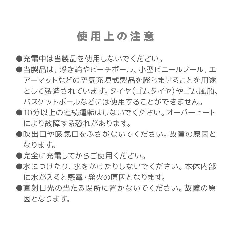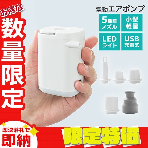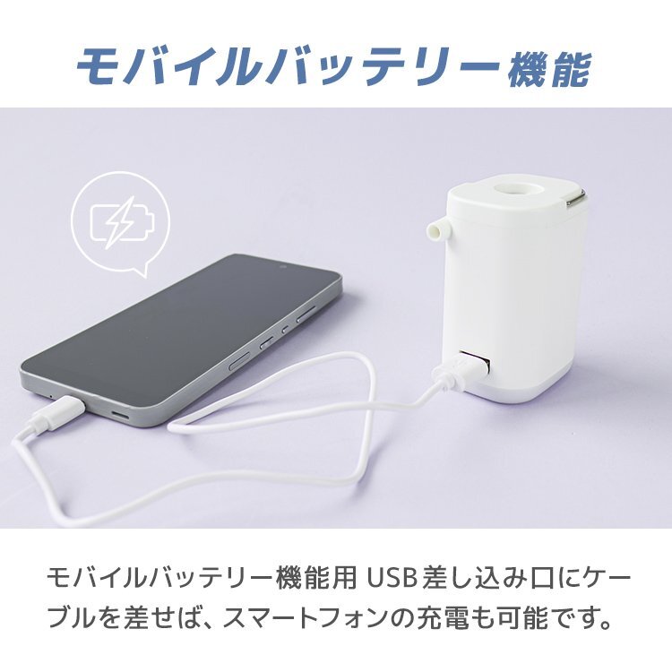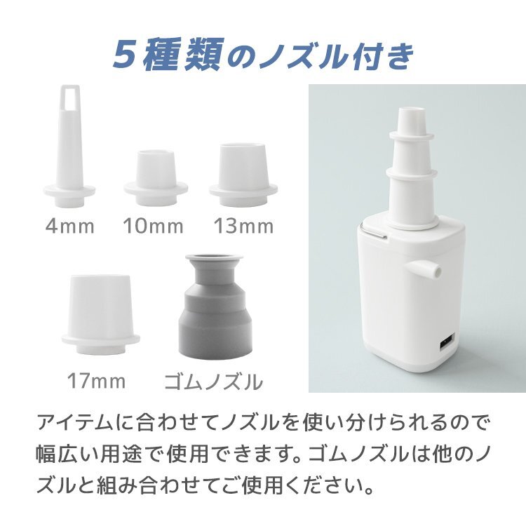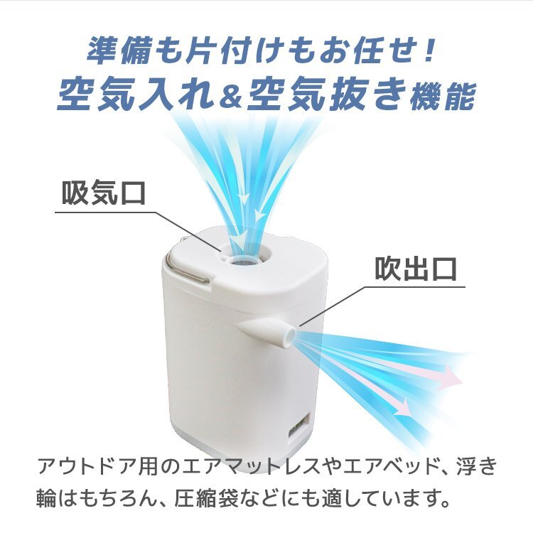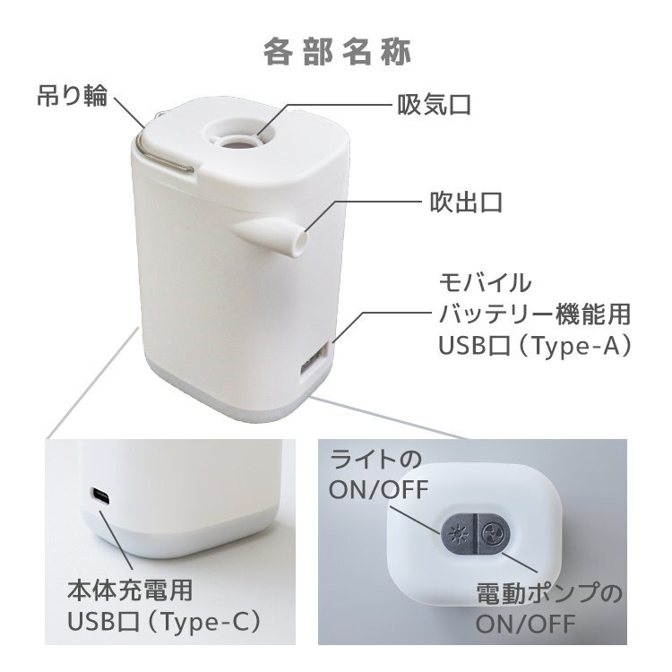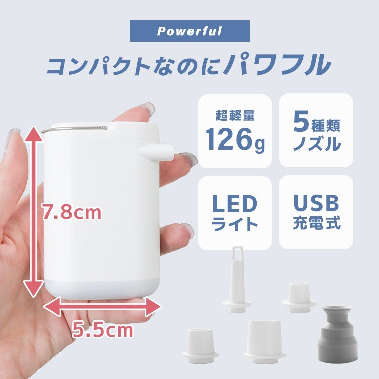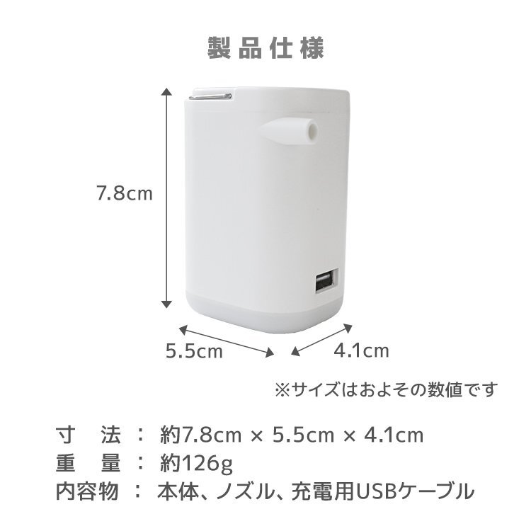 プールや浮き輪、エアーベッドなどの空気入れ・空気抜きに! 手乗りサイズなのにパワフルで使い勝手抜群です!! 充電式でどこでも使えます!持ち歩きもしやすい! この電動ポンプには5種類のノズルが付属してます。 アイテムに合わせてノズルを交換して使えます! また、3段階調光できるLEDライト機能付き! 吊り輪付きなのでキャンプのテント等で、ランタンとしても使えます。 他にも!モバイルバッテリー機能付きです。 各デバイス対応のケーブルを差して充電できちゃいます☆ 様々なシチュエーションで大活躍間違いなしです♪ 【商品仕様】 サイズ(約):5.5cm×7.8cm×4.1cm 重量(約):126g ノズルサイズ(約):4mm / 10mm / 13mm / 17mm / ゴムノズル ※ゴムノズルは他ノズルと組み合わせてご使用ください 【商品内容】 ポンプ本体、ノズル ×5種類、充電用USBケーブル |