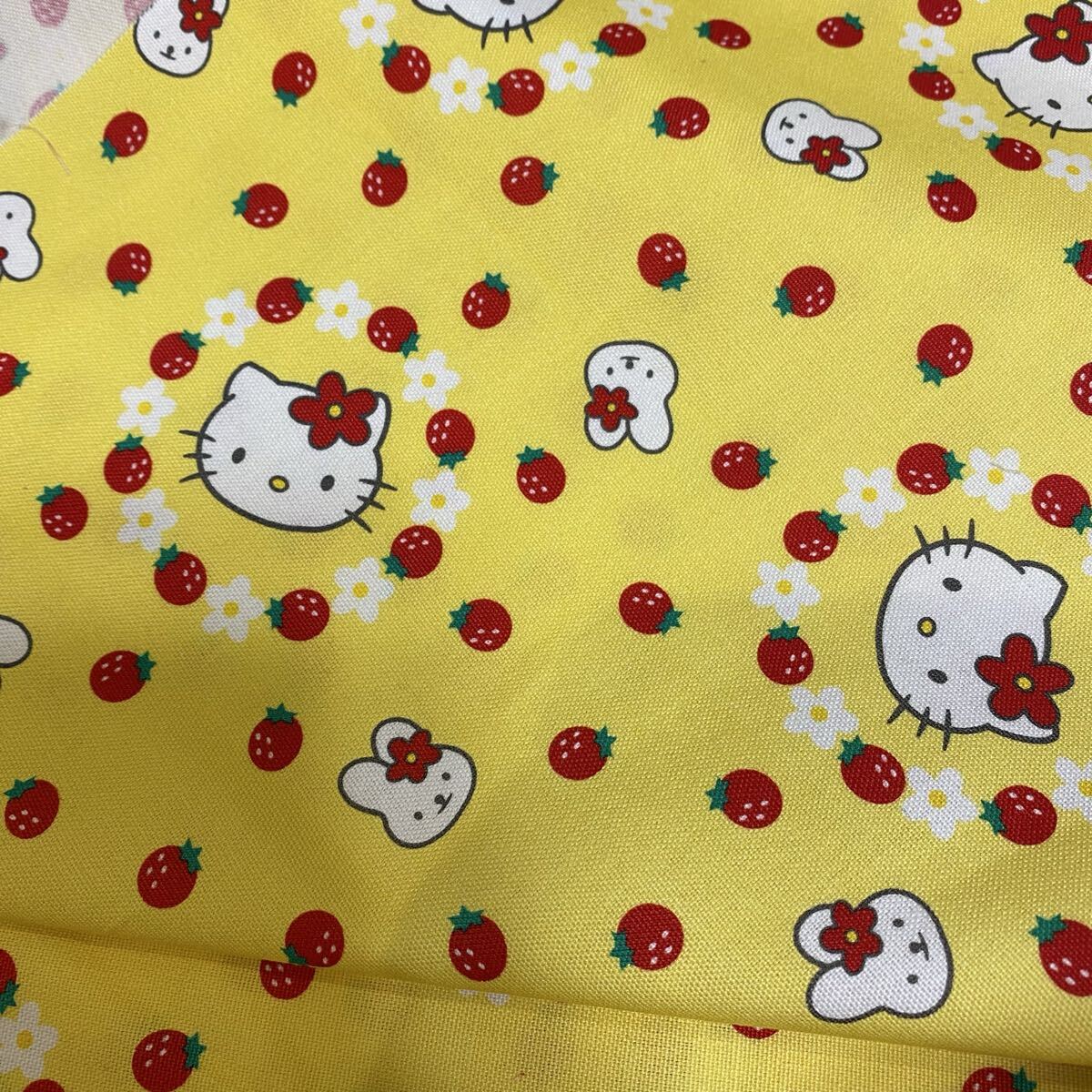 イチゴとハローキティの可愛いプリント生地、明るいイエローが特徴。