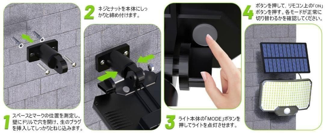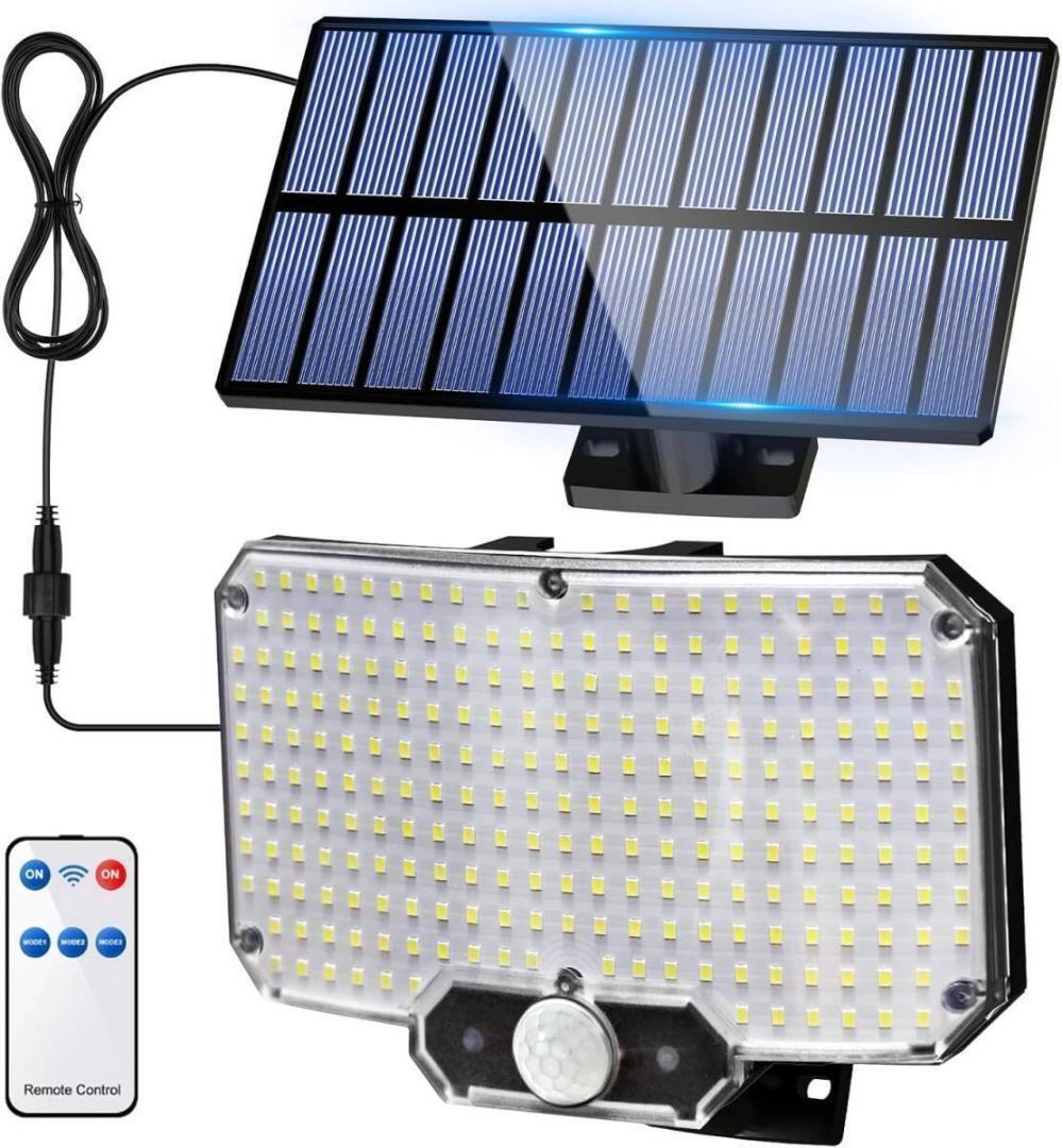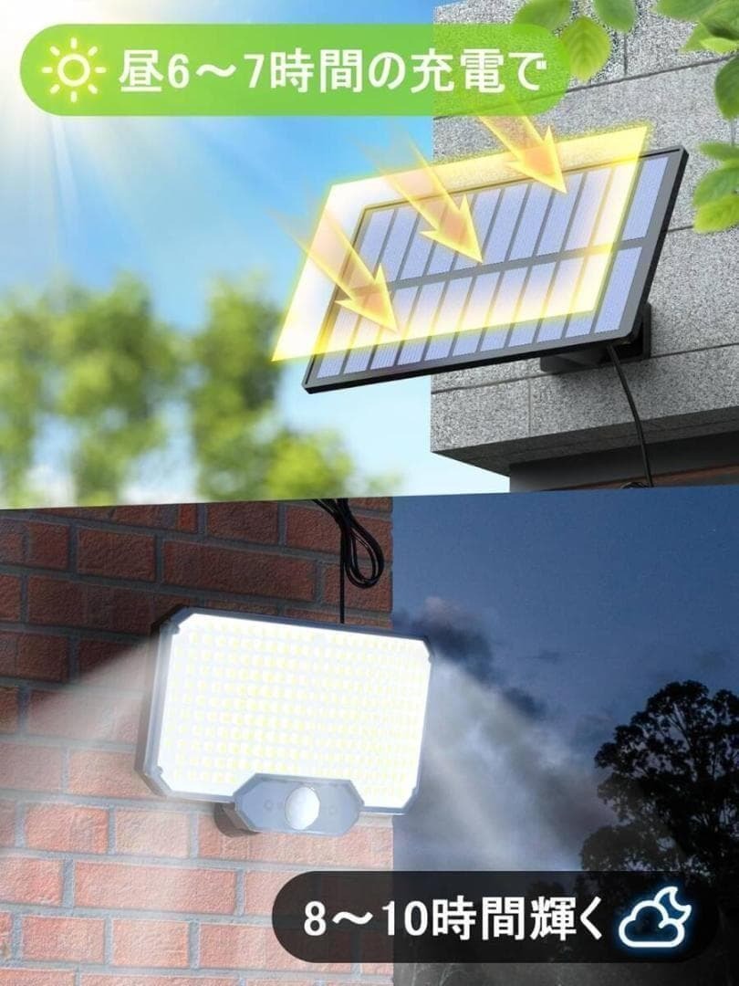 【高輝度 LEDライトで広範囲を照らす!】 本製品は 234個の高輝度LEDチップ を搭載し、最大2000ルーメンの明るさを実現! 従来のソーラーライトと比べ、照射範囲がさらに広がり、庭・ガレージ・バルコニー・花壇・小道 など、あらゆる屋外空間に最適です。夜間の安全性を高め、より快適な暮らしをサポートします。【スマート人感センサー搭載で自動点灯&省エネ!】 高精度の人感センサーを内蔵し、3~5mの範囲で動きを感知すると自動で点灯! 人がいなくなると自動消灯するため、余計な電力を使わず、バッテリーの寿命を大幅に延ばします。従来の常時点灯ライトに比べ、よりエコで省エネ設計になっています。【3つの点灯モードで多彩なシーンに対応!】 利用シーンに合わせて、3種類の照明モードを自由に切り替え可能! モード 1(強光センサーモード):人を感知すると最も明るく点灯し、約10~15秒後に自動消灯。玄関・ガレージ・防犯用途におすすめ! モード 2(微光センサーモード):通常は微光を維持し、人が近づくと強光に切り替わる。庭や通路の照明にぴったり! モード 3(常時微光モード):夜間はずっと微光をキープし、人の動きに関係なく点灯。ベランダや公園の小道など、落ち着いた照明が欲しい場所に最適。【IP65防水・防塵設計で耐久性抜群!】 IP65防水仕様 なので、雨・砂ぼこり・強い日差し にも耐えられる設計。 高品質の耐久素材を採用し、悪天候でも長期間使用可能! 雨の日も夏の猛暑でも安心 してお使いいただけます。【分離式デザイン & 5m延長コードで自由な設置が可能!】 従来の一体型ソーラーライトとは異なり、本製品は分離型デザインを採用。 5mの超長延長コード付きで、ソーラーパネルとライトを別々に設置可能! 例えば、ライトは屋根の下やガレージ内に、ソーラーパネルは日当たりの良い場所に 設置することで、充電効率が大幅アップ! どんな環境にもフィットする、より柔軟なレイアウトが可能 です。