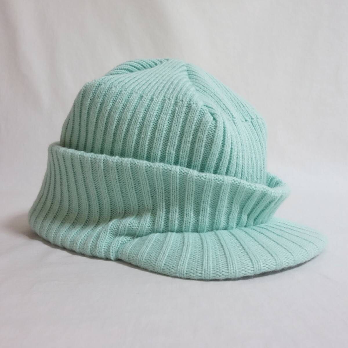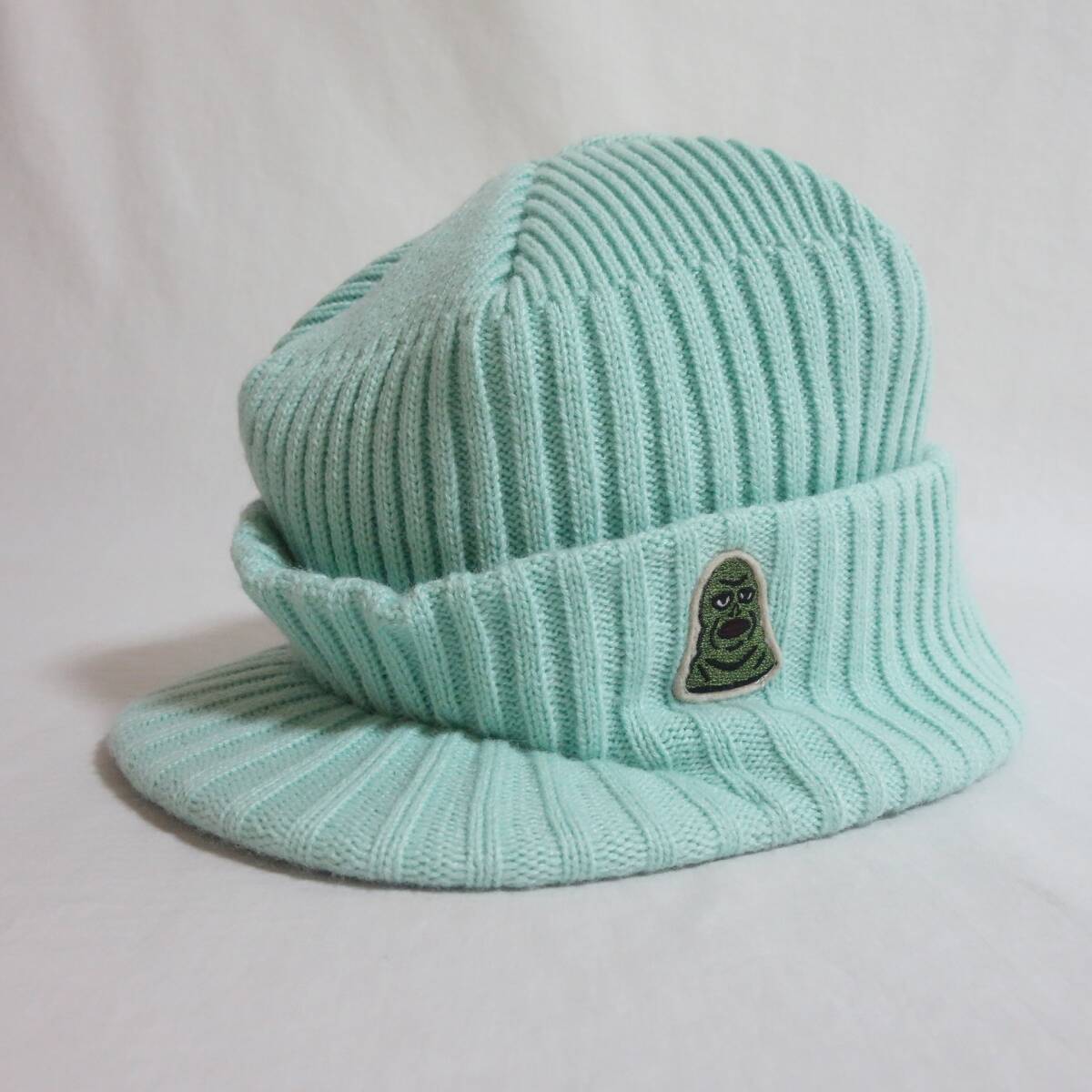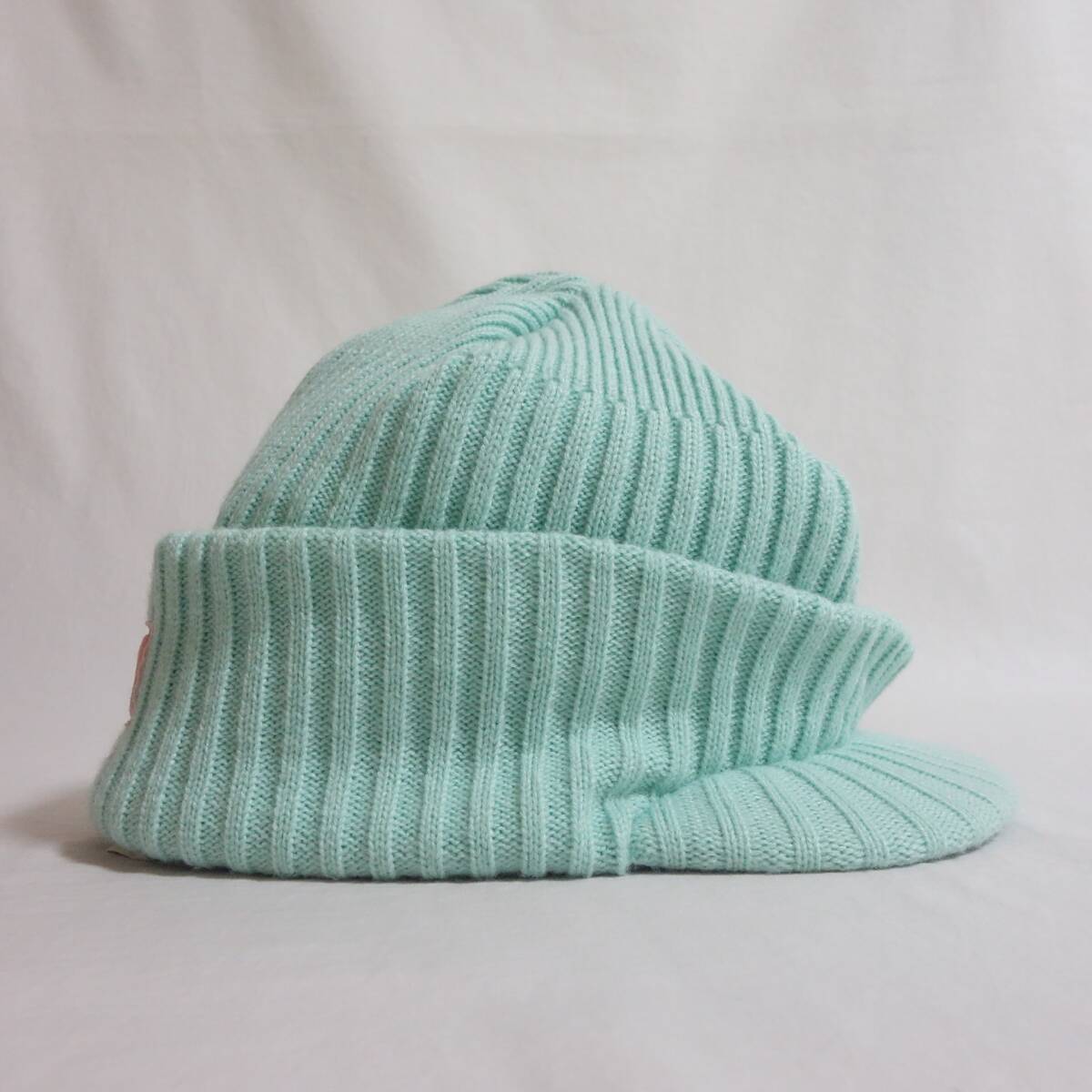 施された、つば付きのニットキャップ。