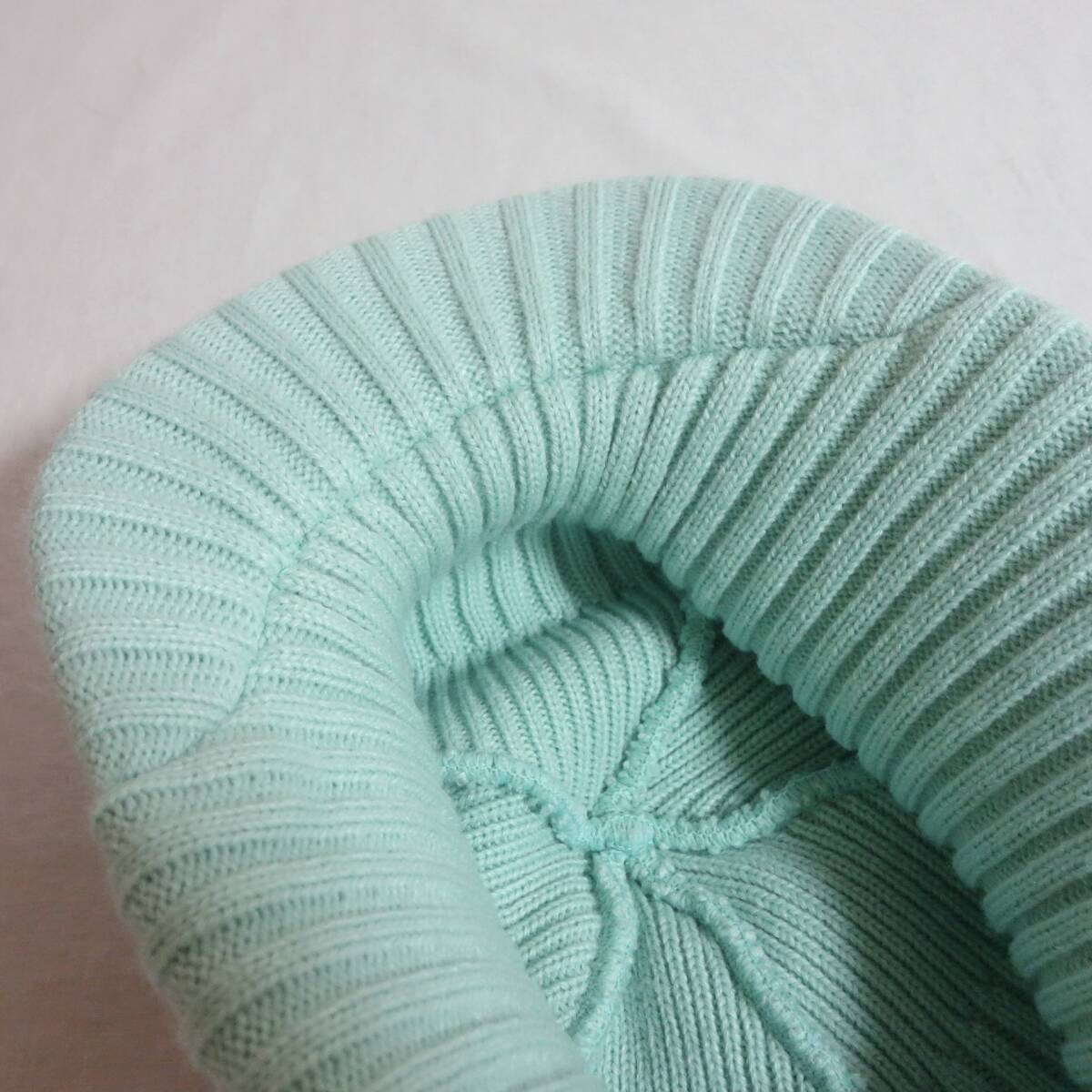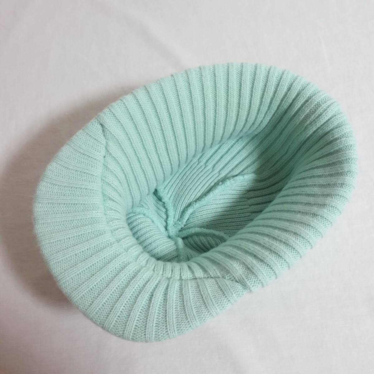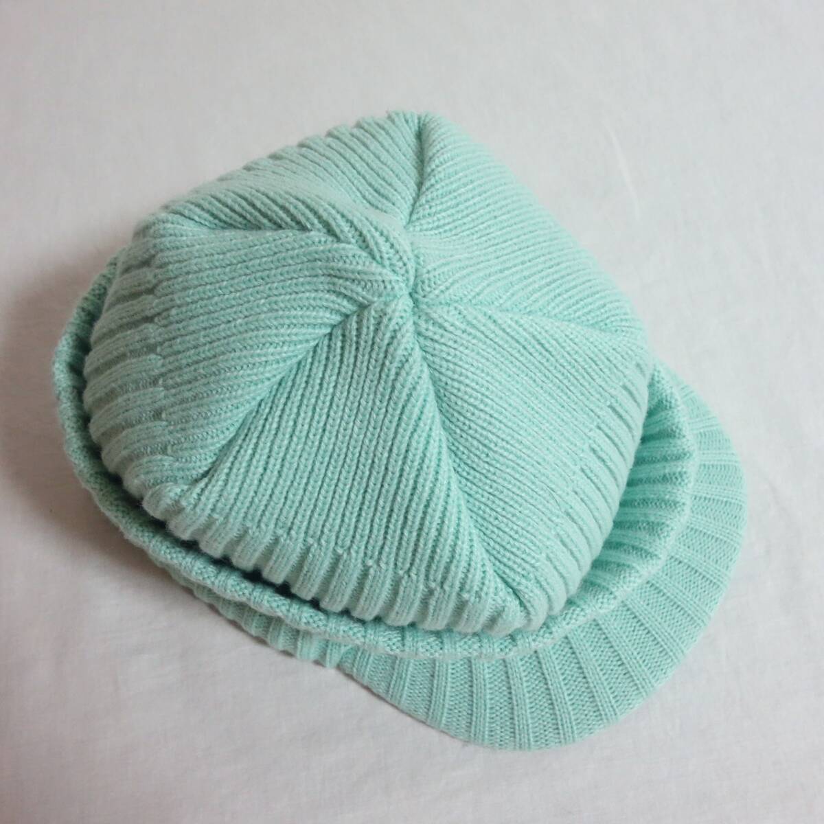 施された、つば付きのニットキャップ。