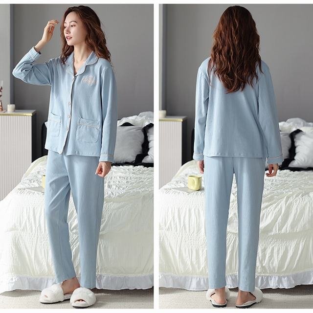 ジャマ レディース 前開き コットン 部屋着 長ズボン ルームウェア 長袖 無地 旅館 ホテル ナイトウェア ブルー L