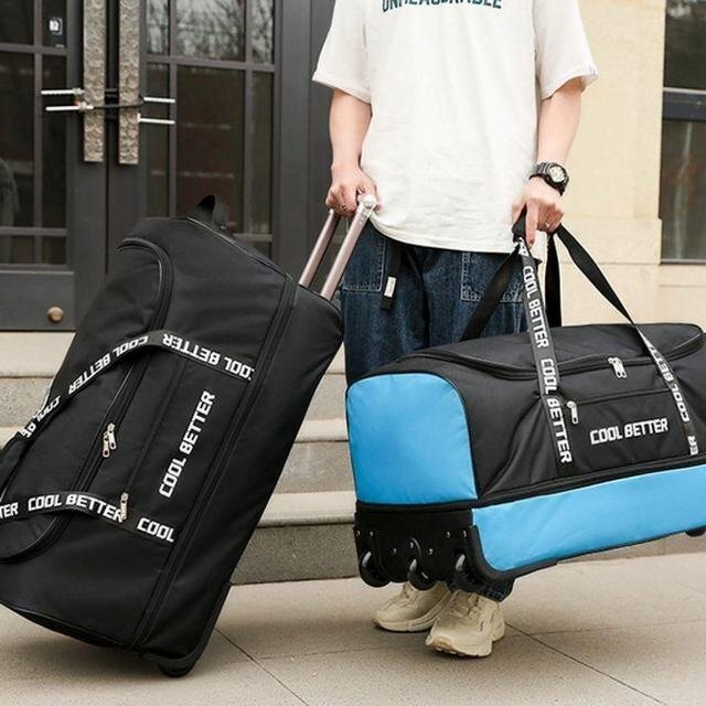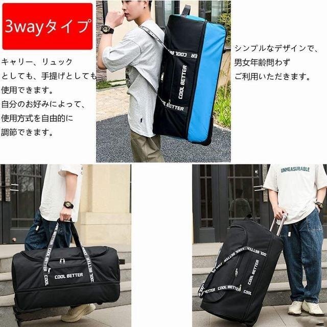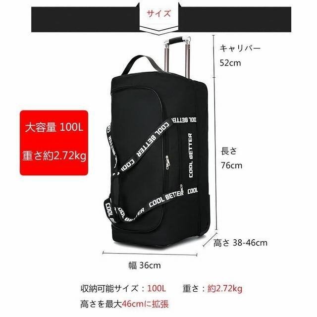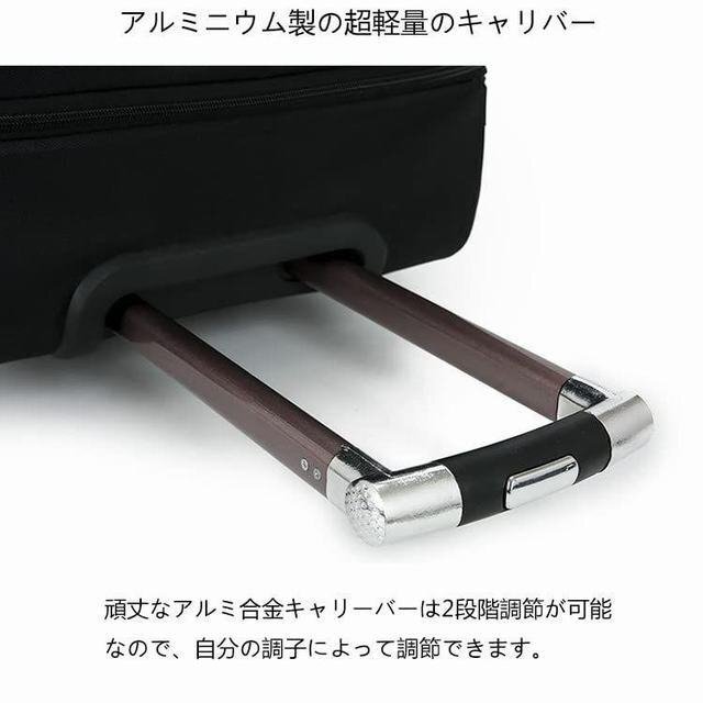 【メイン素材】:ポリエステル ポケットのサイズによって、充電器、スマホ、腕時計、財布、鍵、usbケーブルなど小物から傘、靴、ノートパソコン、ipad、衣服など大きな物まで仕分けてスッキリに収納できます。男女兼用のキャリーバッグです。 【高品質素材】: 耐摩耗性に優れた丈夫なポリエステル素材と高品質の金属製ジッパーを取り入れ、上品な質感と耐久性を兼ね備え、長くご愛用いただけます。 また、縫製がしっかりしていて丈夫であり、耐久性に優れている、通気性、柔軟性と速乾性も良い、抗菌作用があり、長期間の使用でも色落ちしにくい。撥水機能も備え、雪や雨水など滲みにくく、汚れてもさっと拭き取れ、お手入れ楽々です。 【3wayキャリーバッグ】: 普通のキャリーバッグと比べて、実用性に優れた3way多機能キャリーバッグリュックはキラキラ登場します。キャリー、リュックとしても、手提げとしても使用できます。自分のお好みによって、使用方式を自由的に調節できます。 【多段調節キャリバー&高品質キャスター】: アルミニウム製の超軽量のキャリバーは伸縮可能で、ご自分の身長に合わせて、スムーズな2段階調整が可能です。高弾性のゴムキャスターを採用し、より静かで耐摩耗 性も向上しています。耐振性に優れるデザインで、荷物を入れて凸凹な路面でもスムーズで安定した移動を可能にします。 【様々なシーンで活躍】: シンプルなデザインで、男女年齢問わずご利用いただきます。旅行、出張、通学、合宿、アウトドア、遠足、ショッピング、お釣り、帰省、お出かけ、スポーツ、防災用など様々なシーンで活躍できます。