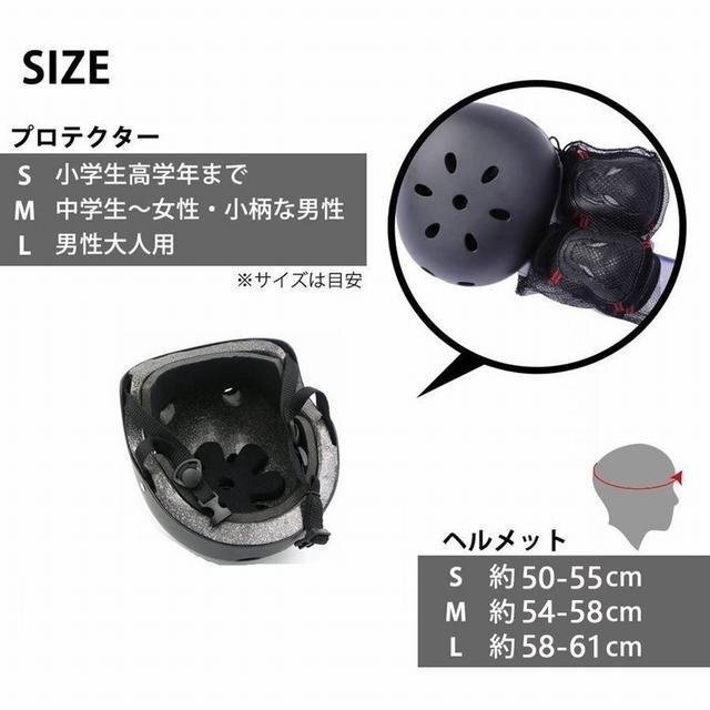 【プロテクターサイズ】: S(小学生高学年まで) M(中学生?女性?小柄な男性) L(男性大人用) ※あくまで目安です。 【ヘルメットサイズ】 : S(約51-54cm) M(約55-57cm) L(約57-59cm) ※あくまで目安です。 【セット内容】: ?ヘルメット×1 ?肘パット×2 ?膝パット×2 ?手首ガード×2