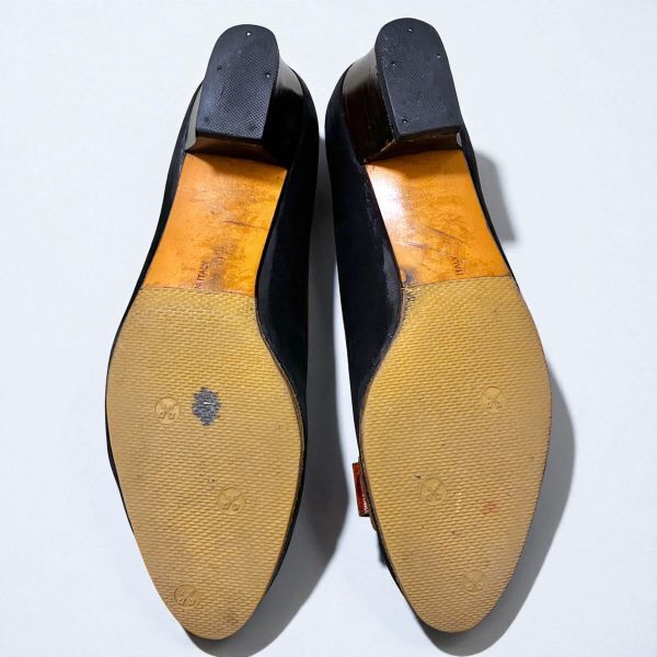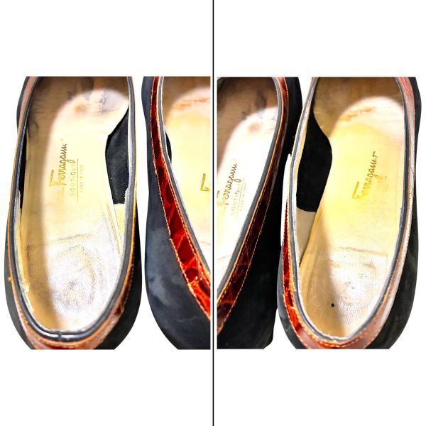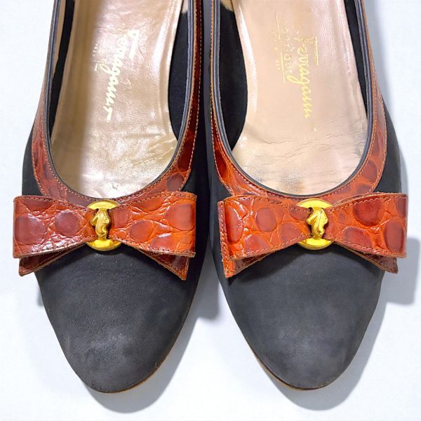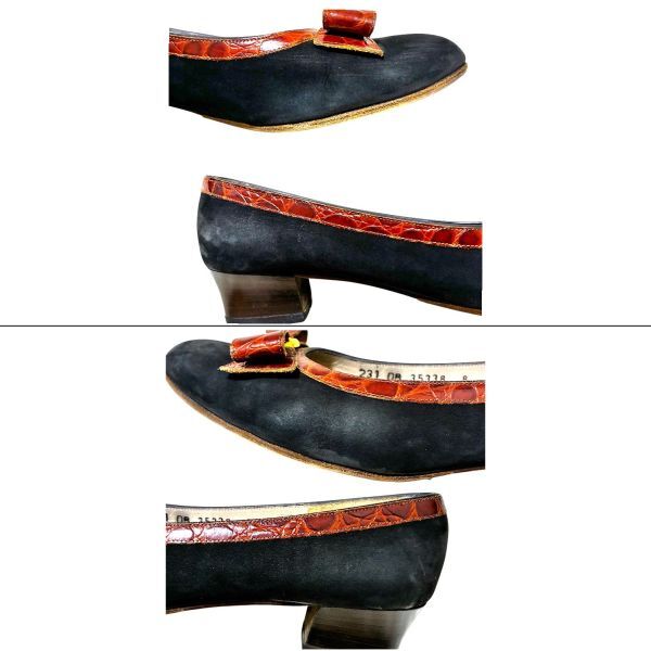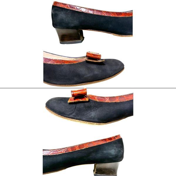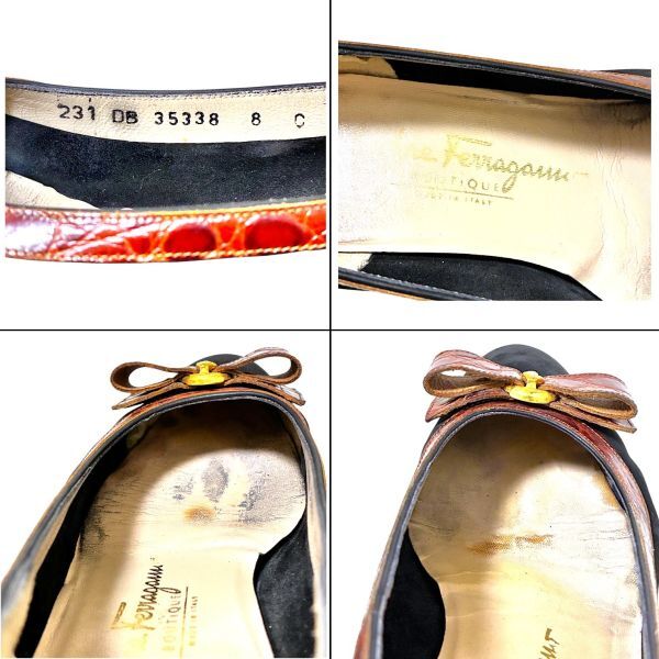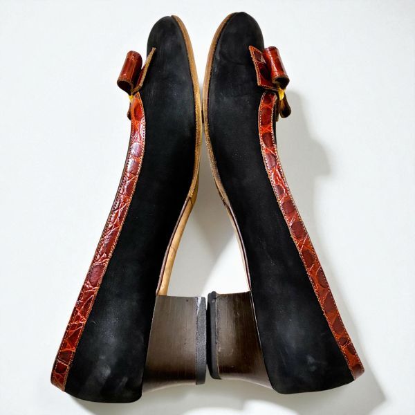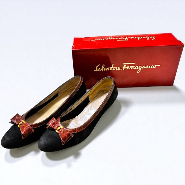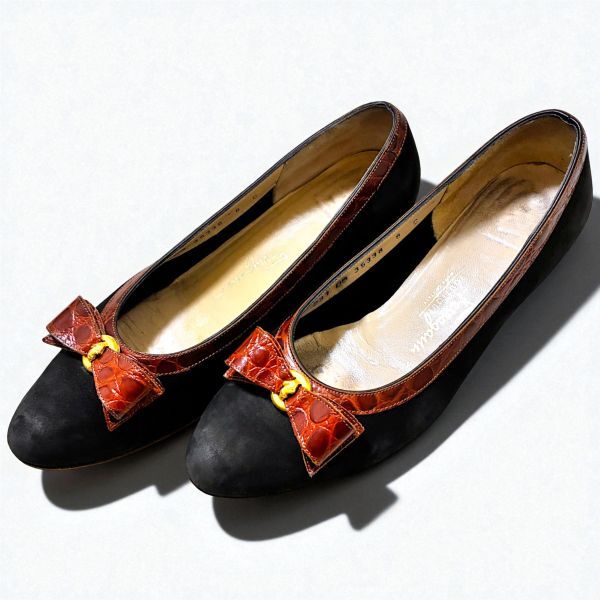 Salvatore Ferragamo サルヴァトーレフェラガモ クロコ型押し フラットシューズ ローヒールパンプス リボン 黒 サイズ8 スエード レディースヴィンテージ