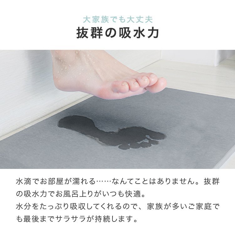 ご安心してご使用ください。 踏んだ瞬間から乾く! 珪藻土バスマットです。 珪藻土の持つ優れた吸水性で、湯上りの濡れた足の裏の水分を すばやく吸い取ってくれます。 カビや嫌な匂いが発生しにくい! 影干ししておくだけで、カビの発生が防げる特徴があり衛生的で手間要らず!! お手入れに手間がかかりません。 軽い!薄い、丈夫!! 女性でも片手で持てる軽さが魅力です♪ 【商品仕様】 カラー:グリーン サイズ(約):幅60cm×奥行39cm×厚さ0.9cm 重量(約):1.8kg 材質:珪藻土、植物繊維、石英砂 【商品内容】 珪藻土バスマット ×1 ・海外からの輸入製品となりますので、製造、または配送の過程において生じた、 端部分の欠け、細かなキズやへこみが見られる場合がございますが、 機能性や品質上に問題はないため、返品や交換の対象とはなりません。 予めご了承の上、ご購入をお願いいたします。 商品コード:KMT01GR |