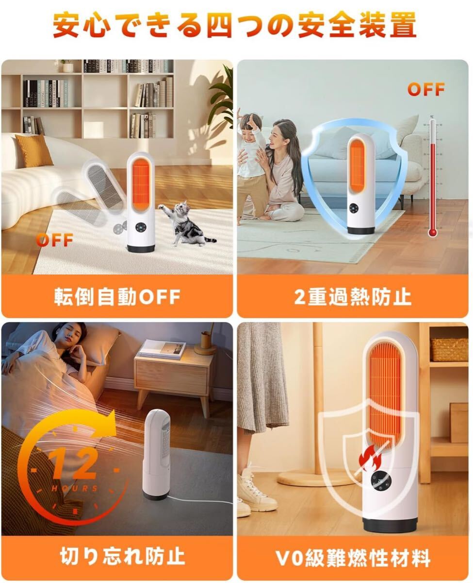 ①転倒自動OFF機能 ②二重過熱防止 ③12時間自動OFF ④難燃性V0素材 ⑤電源OFF後の冷却送風 ⑥PSE認証取得済み。安全性を徹底した設計で、小さなお子様やペットのいるご家庭でも安心して使えます。