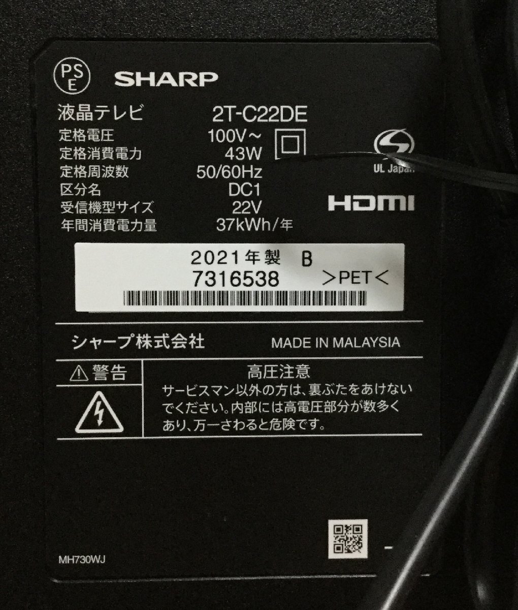 SHARP 液晶テレビ 2T-C22DE 動作品 22型 フルHD リモコン B-CARD付き